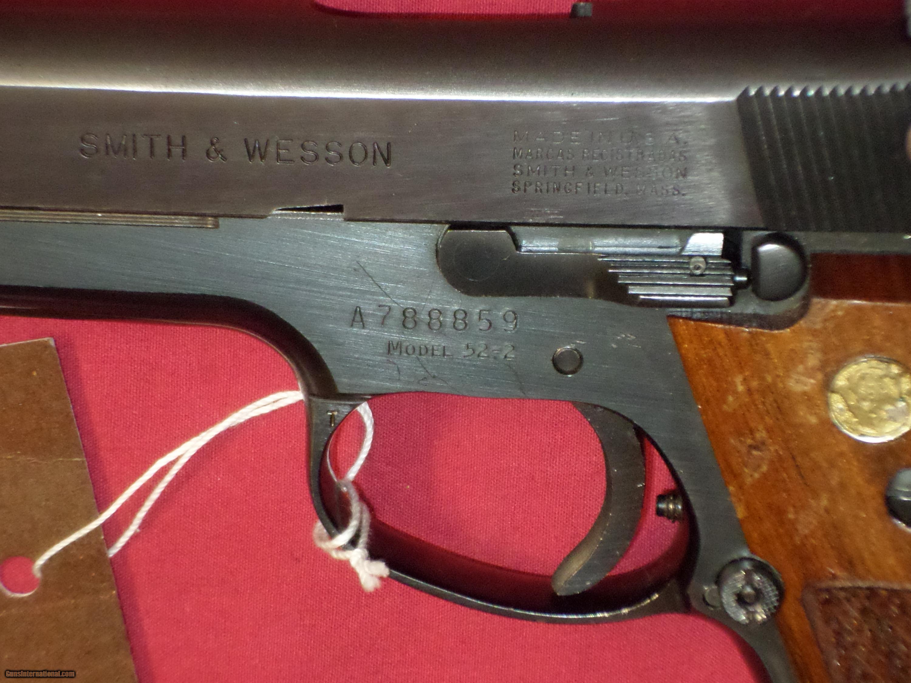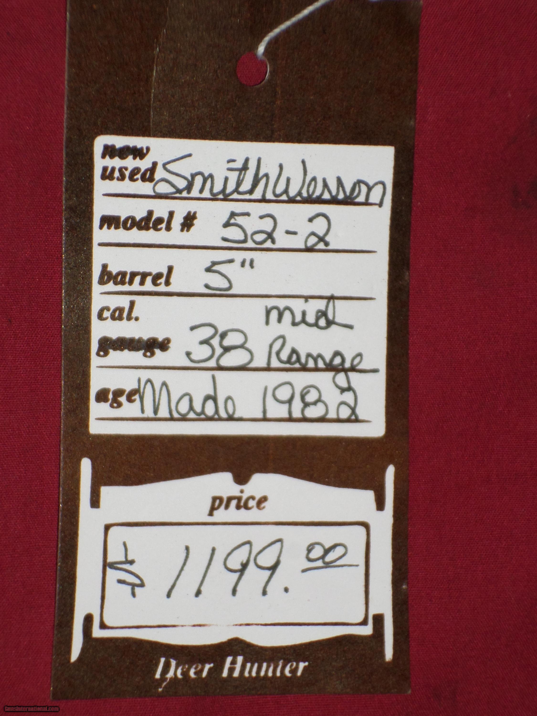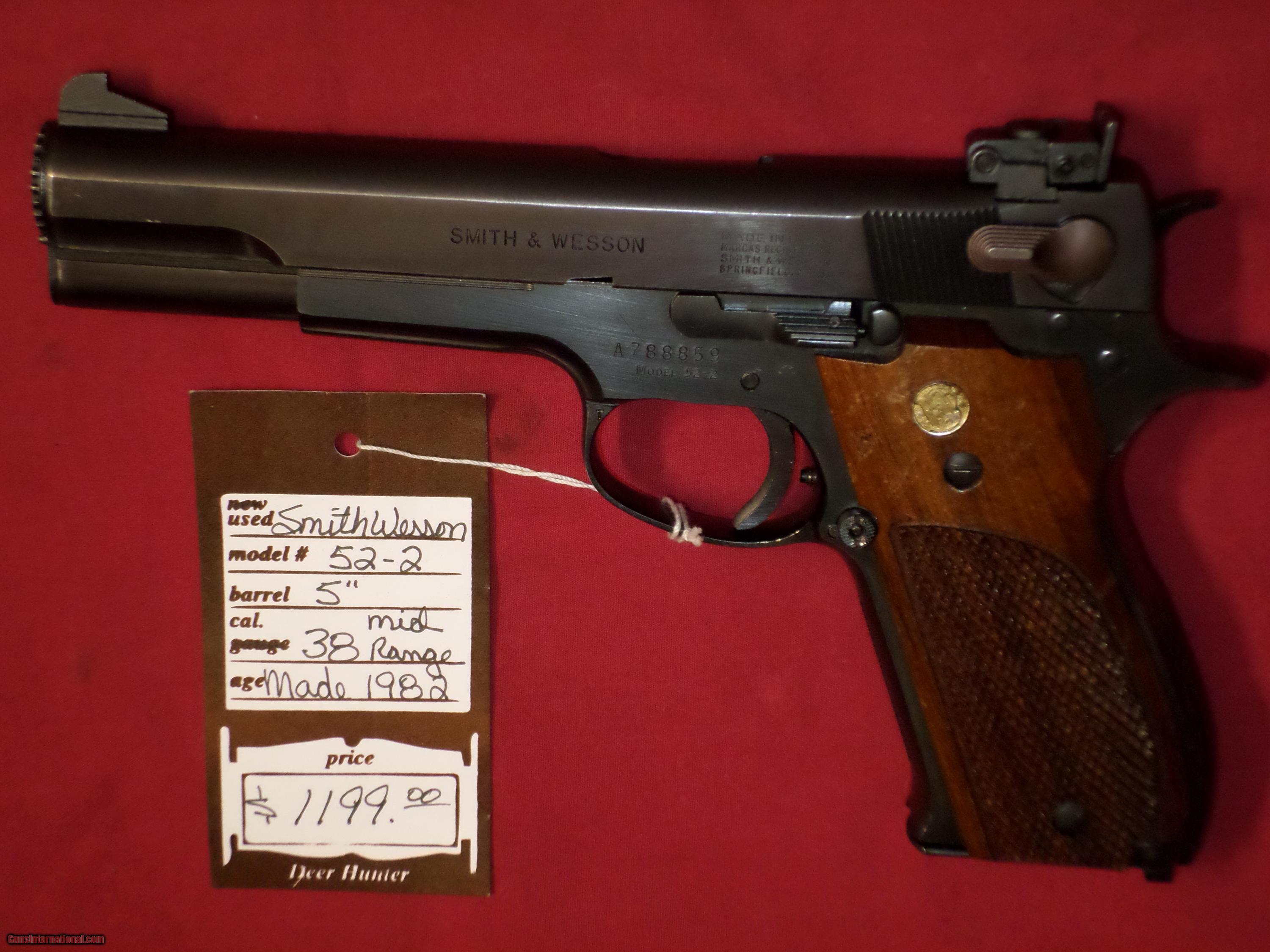 Description: SOLD For sale, Smith & Wesson 52-2, .38 Mid Range, (.38 Wadcutter), excellent condition, grips show use. Circa 1982 SOLD To see more of our inventory, visit deerhunterguns,com We accept MC, Visa and Discover, no AmEx. No Sales to California. Like us on Facebook: Deer Hunter Guns SOLD |