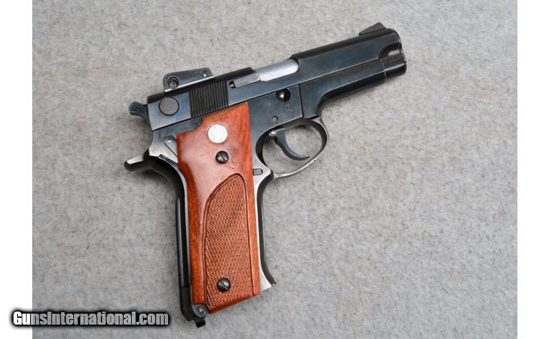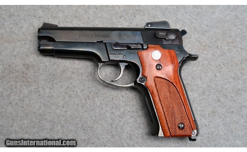 Description: This S&W model 559 is in very good condition. The model 559 9mm semi auto pistol was originally designed in 1971 and was manufactured from 1980-1983. It features all carbon steel construction, blued finish, adjustable sights, double action / single trigger, right hand safety and decocker and has Smith and Wesson wood grips. Includes 1 factory magazine, no box. A very nice example of a 2nd generation S&W semi auto. SOLD Manufacturer: Smith & Wesson sources indicate production between 1980-1983. Caliber Info: 9mm Metal Condition: Good, shows some finish wear from normal use and due to its age. Wood Condition: Grips are in excellent condition. Bore Condition: Bright and shiny. Barrels: 4 inch steel. Matte black slide. Triggers: Single Action / Double Action steel trigger. Stock: Checkered walnut. Weight: 32 oz. Sights: Adjustable rear sight and a ramp front sight. Item Location: Hazelwood, MO |