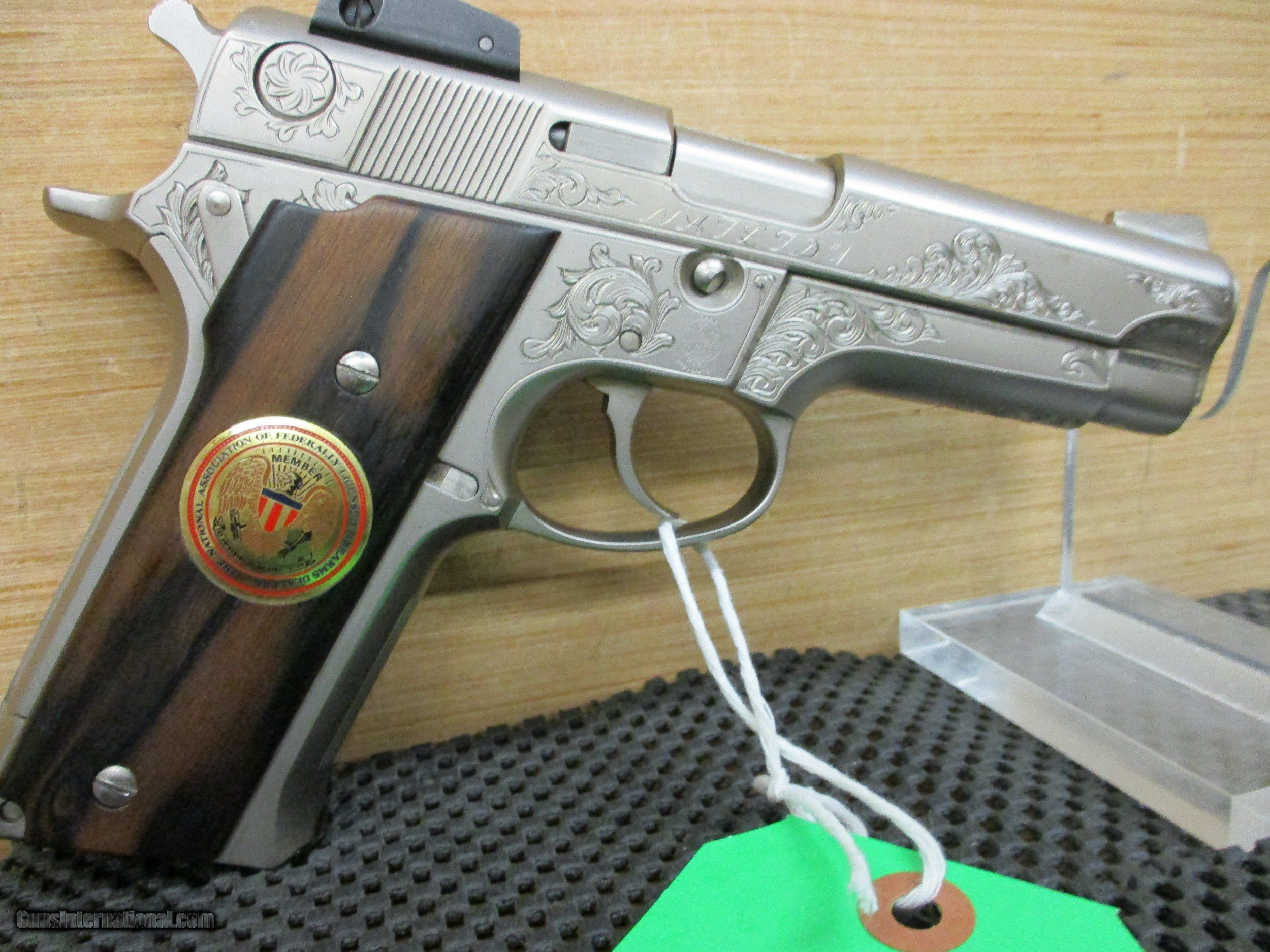 Description: CONSIGNMENT APPEARS NEW UNFIRED SMITH & WESSON 559 NICKEL ENGRAVED K HURST 9MM NAFLFDA -- 4" BARREL --1-13 Rnd Mag This is a limited edition S&W Model 559 pistol engraved by Master Engraver Ken Hurst to specifically celebrate the 10th Anniversary of the National Association of Federally Licensed Firearm Dealers (NAFLFD). # 154 of 250 ****PLEASE CALL IN THE WITH THE SELLER’S INVENTORY NUMBER IF INQUIRING ABOUT A FIREARM****** WE DO NOT SHIP FIREARMS AND/OR FIREARMS’ PARTS OUT OF THE 50 UNITED STATES, SO DON’T ASK—YOU NEED TO KNOW IF FIREARM IS LEGAL FOR YOUR STATE PRICE REFLECTS PAYMENT BY MONEY ORDER / CASHIERS CHECK. A 3% PREMIUM IS ADDED FOR CREDIT CARDS. WE DO ACCEPT PERSONAL OR BUSINESS CHECKS, BUT THERE IS A GRACE PERIOD OF 10 BUSINESSS DAYS ON THEM. Shipping is $40 for handgun and $30 for long gun. Shipping to Alaska and Hawaii will be more based on weight of firearm. WE DO OFFER LAYAWAY PLANS FOR 30,60, OR 90 DAYS. THERE IS A $5.00 CHARGE FOR EVERY 30 DAYS ITEM IS ON LAYAWAY. WE ALSO REQUIRE A 20% DOWN PAYMENT ON TOTAL OF LAYAWAY SALE. LAYAWAYS ARE NON- REFUNDABLE. HERE IS HOW THIS PROCESS WORKS. YOU WOULD CALL US AT 540-337-9218 WITH LISTER # TO PURCHASE THE GUN. THEN ONCE I HAVE RECEIVED PAYMENT AND AN FFL (FEDERAL FIREARMS LICENSE) FROM A LICENSED DEALER IN YOUR AREA OF YOUR CHOICE. WE WILL THEN SHIP THE GUN TO THEM. YOU WOULD THEN PICK UP THE GUN AT YOUR LOCAL DEALER AND DO PAPER WORK THERE. Please have your FFL Dealers contact information when you call. DOMINION OUTDOORS 15 ANGELA COURT FISHERSVILLE, VA 22939 540-337-9218 540-337-2422 fax M – F 9 a.m. to 6 p.m. ETZ Sat 9 a.m. to 4 p.m. ETZ ****PLEASE CALL IN THE WITH THE SELLER’S INVENTORY NUMBER**** ***PLANO HARD CASES AVAIABLE FOR PURCHASE $19.99 WITH THE PURCHASE OF A FIREARM** *** Online prices compared to in store prices will vary. *** SOLD |