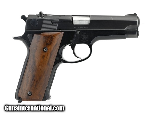 Smith & Wesson 59 9mm caliber pistol. 1st Gen auto with 14rd magazine. Has custom wood grips.