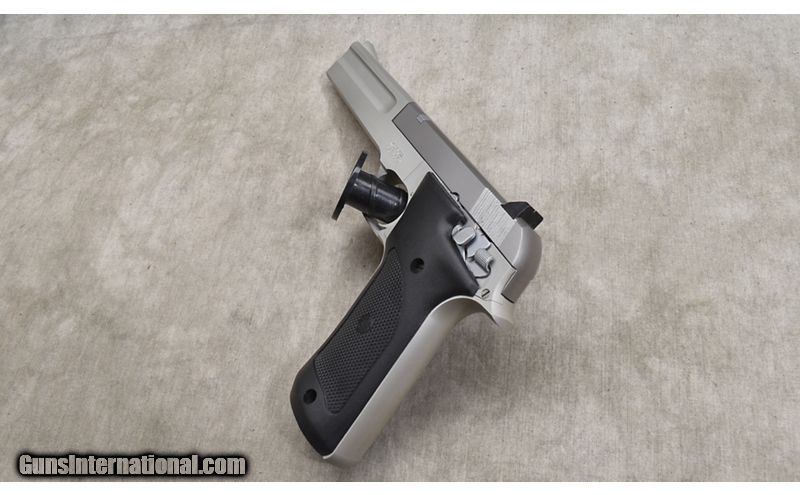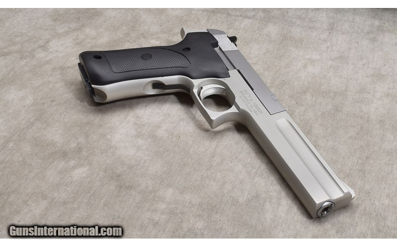 Description: Unusual alloy autoloading pistol featuring a barrel located in the lower part of the frame putting it "close to the hand." It has a satin white alloy frame, and a steel slide. .22 Long Rifle SOLD Chambers: 12+1 capacity mag Metal Condition: Excellent. Wood Condition: Excellent. Bore Condition: Shiny and bright. Barrels: 6-inch Triggers: Factory single action trigger. Butt Pad: Black plastic. Weight: 23 oz. Sights: Serrated ramp and notch sights Item Location: Rogers |