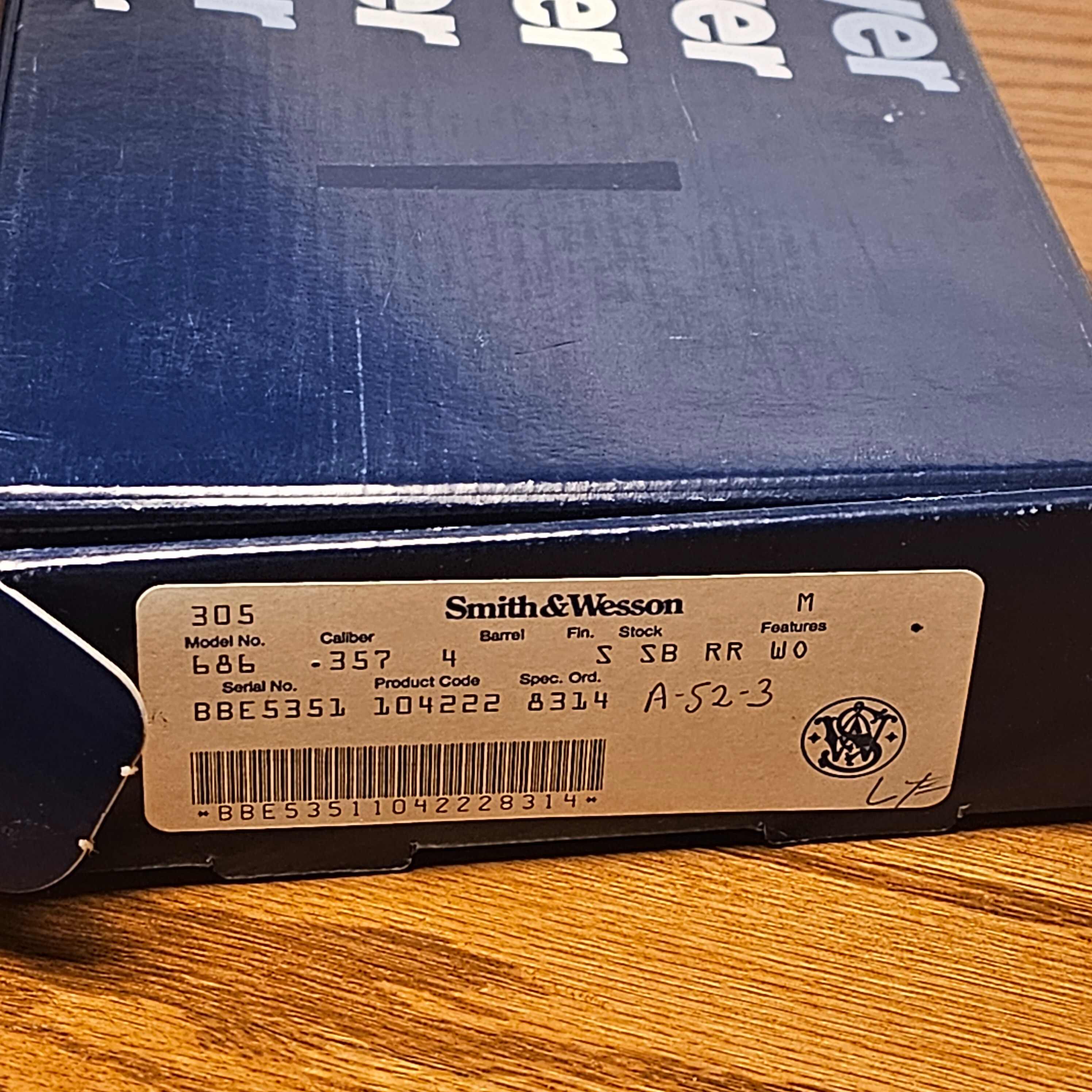 Smith & Wesson Model 686-3 Caliber 357 Magnum Barrel length 4" S,S. Target grips with orignal factory box. Condtion 99% Vaint dragline on cylinder Want to purchase call shop 716-941-3946
