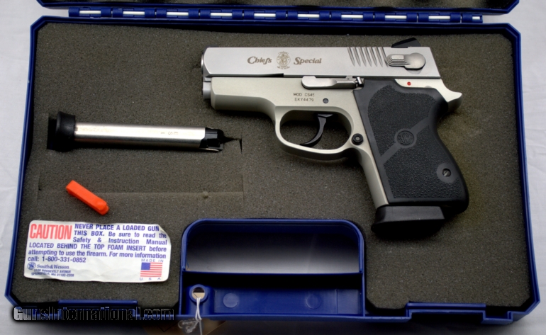 Description: SMITH & WESSON CHIEFS SPECIAL 45 ACP ... 3 1/4” barrel with an excellent, bright bore ... 3 Novak Low mount night sights ... 6 + 1 Capacity ... 2 x 6 round magazines ... DA/SA DeCocker The stainless steel barrel rates excellent and exhibits minimal light wear. The matte finished stainless steel slide rates excellent, with some extremely faint handling marks. The alloy frame rates excellent, with a few faint handling marks. The black Hogue wraparound rubber grips rate and feel excellent. The pistol features a set of three- Novak low mount sights and decocker safety. Included with the pistol are two 6 round stainless steel magazines, chamber indicator, and factory original hardcase. SHIPPING INFORMATION: We offer flat rate $35 shipping & insurance to lower 48 states on guns under $2000. Hand guns ship 2nd Day. (M-F delivery only) Long guns ship ground. (3 to 5 days) We offer combined shipping: $35 for first gun and $15 for each additional in same box. Shipments will be delayed on any holiday. Alaska & Hawaii will be calculated on each order. Buyer pays all shipping costs. We make every effort to ship the same day we receive payment & paperwork. SOLD |