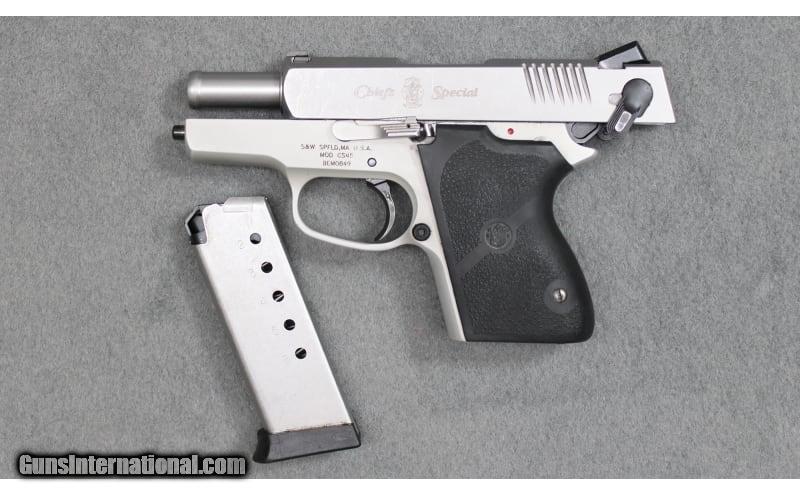 Description: Smith & Wesson CS45 "Chief's Special" semiautomatic pistol chambered in .45 Automatic. In production from 1999 – 2006. Features include traditional single/double action trigger, no hammer spur, 3-1/4 inch barrel, 6 round magazine, alloy frame, and stainless slide. Comes with a single magazine and no other accessories. .45 Auto SOLD Barrels: 3.25 inch Triggers: DA/SA Butt Pad: Hogue Wraparound Rubber Grips Sights: Novak Lo Mount Front and Fixed 2 Dot Rear Item Location: Columbus, OH |