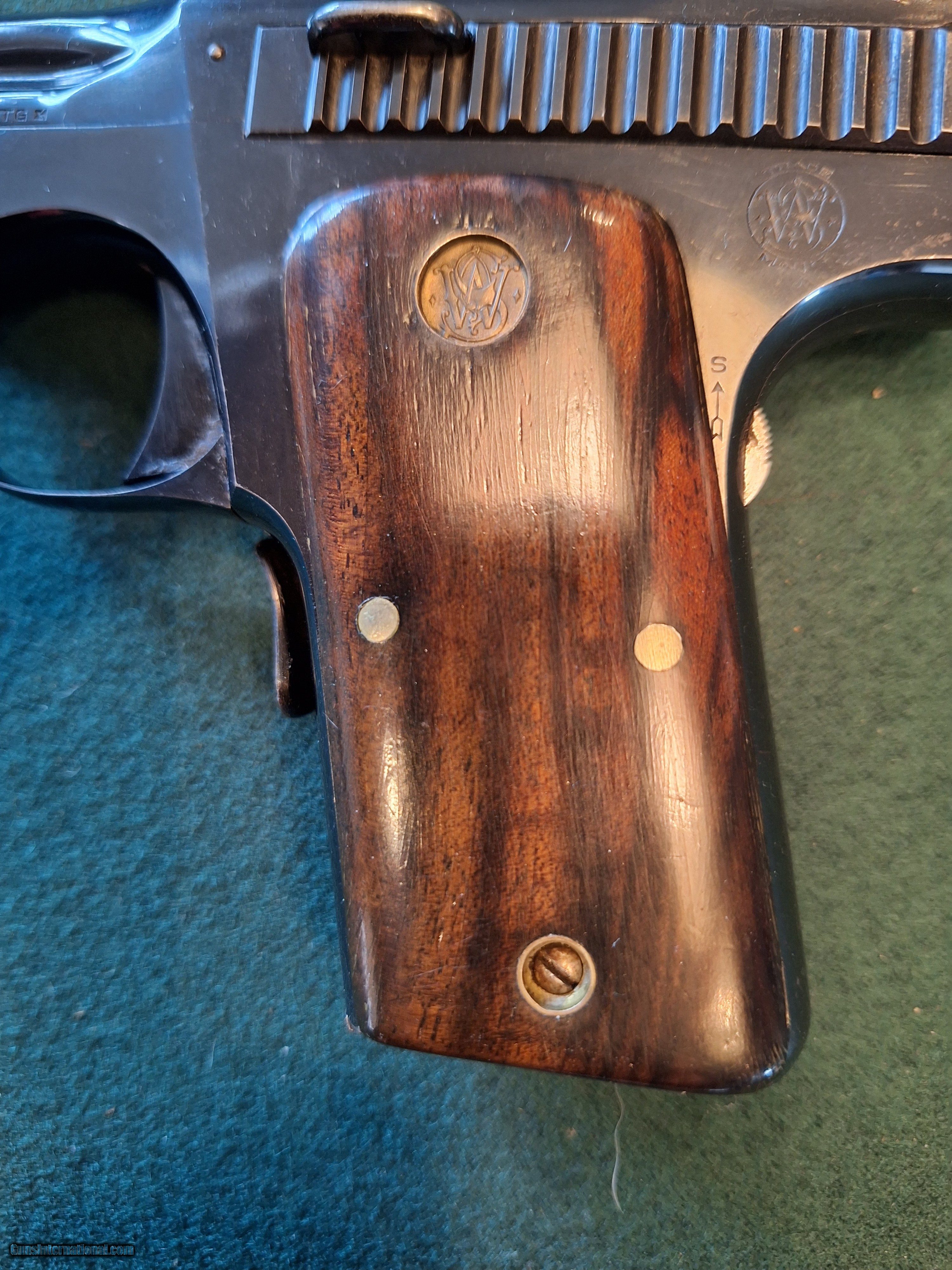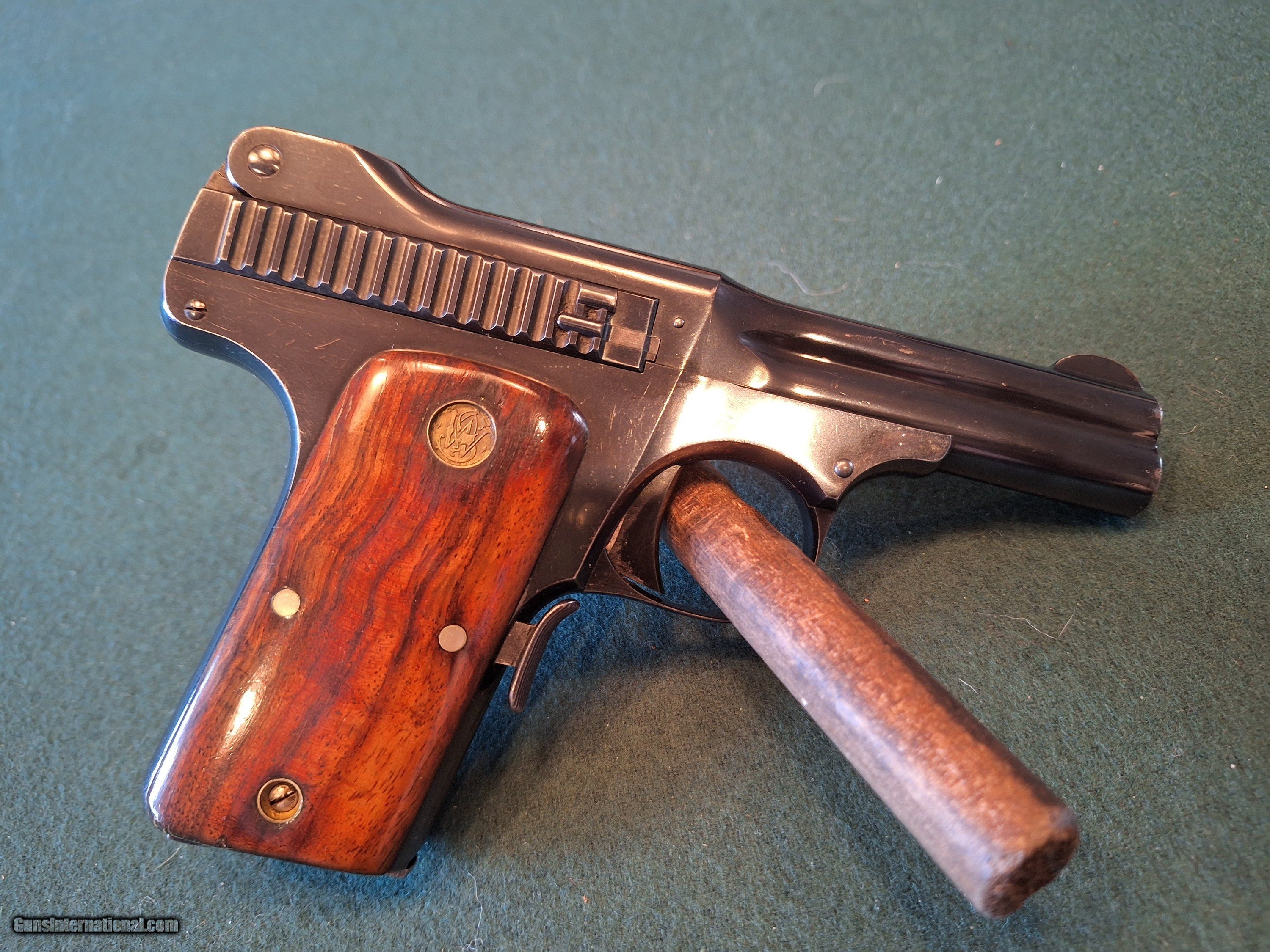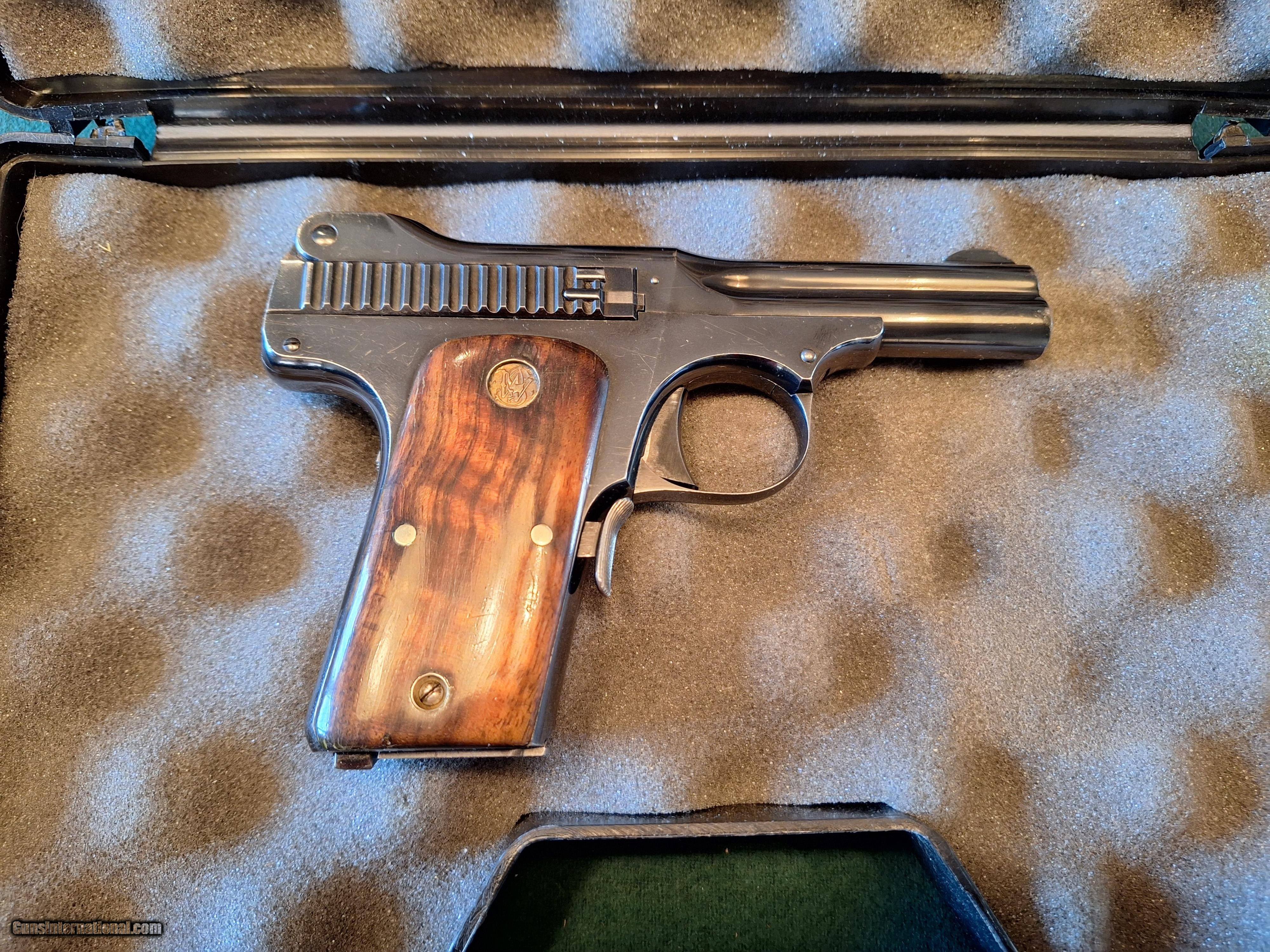 Description: Smith & Wesson. Model 1913 semi auto pistol. Cal 35 S&W (32acp) 3.5” barrel with a near mint bore. This is the first of Smith & Wesson’s designs for an automatic pistol. Pistol is in NEAR mint condition overall. Serial # 3087. Manufacturer: S&W Model: 1913 Serial Number: 3087 Barrel Length: 3.5 Condition: Excellent Metal Condition: Excellent Wood Condition: Excellent Bore Condition: Excellent Action: Semi Price: $1,250.00 Contact Seller |