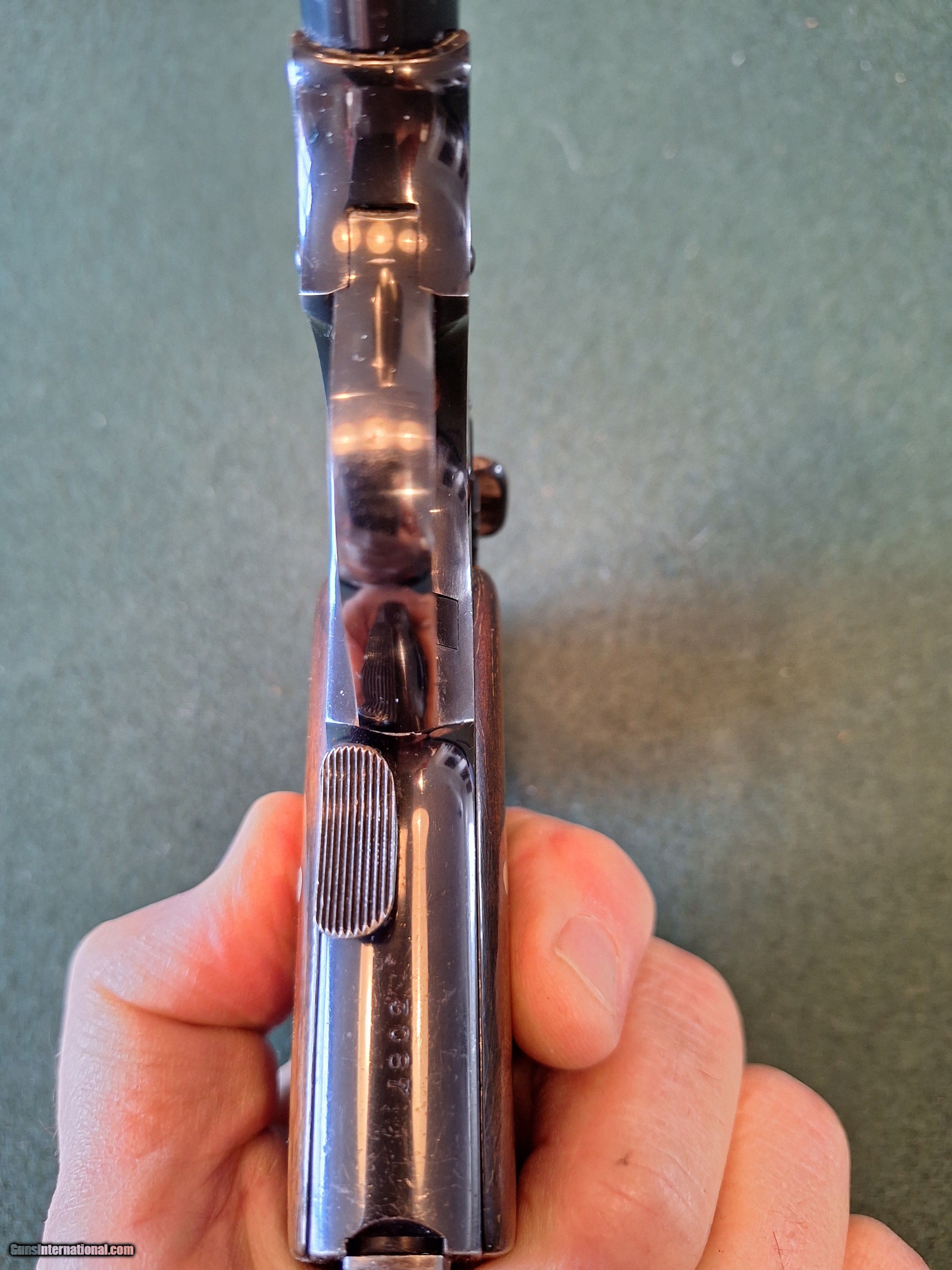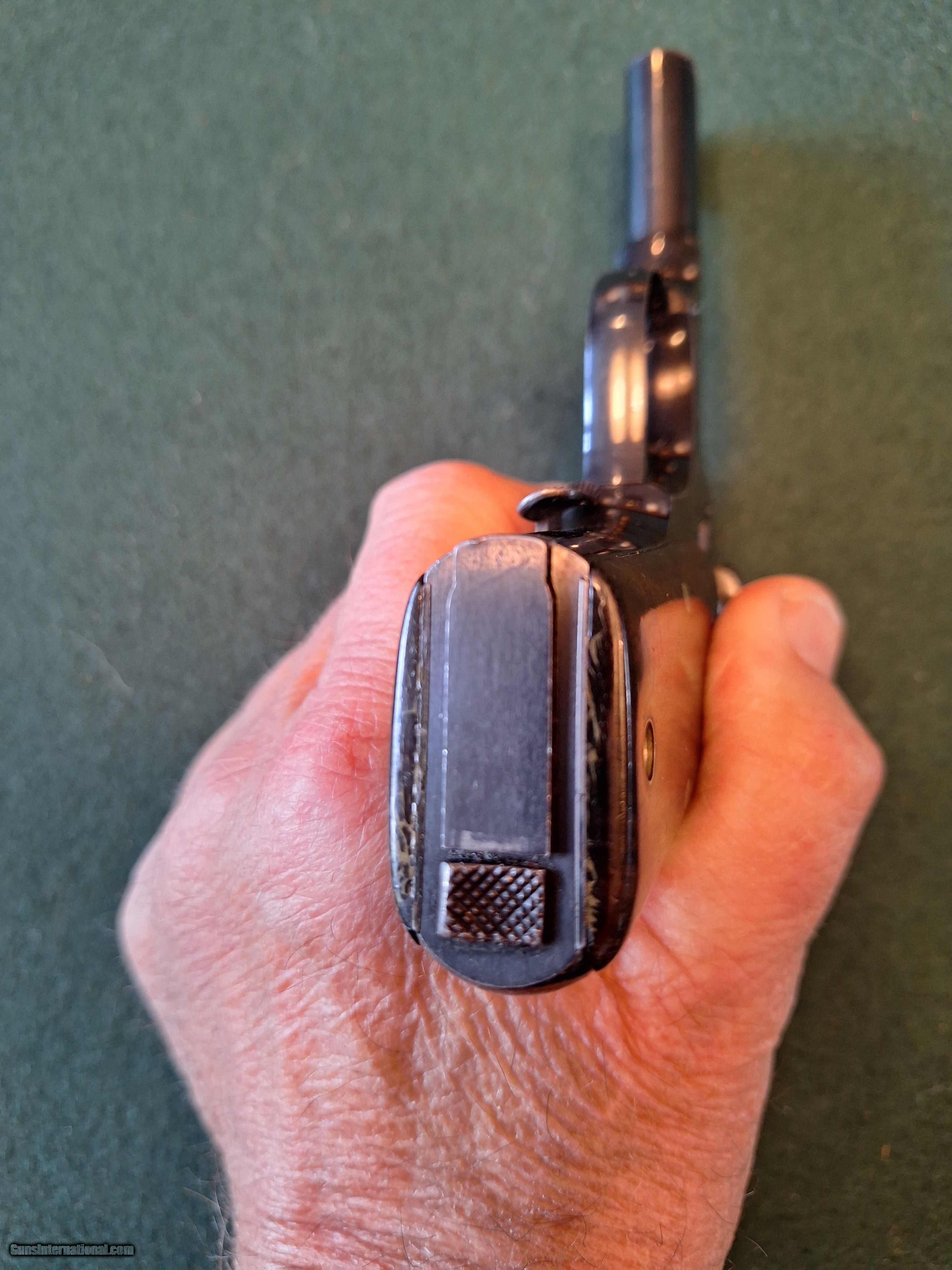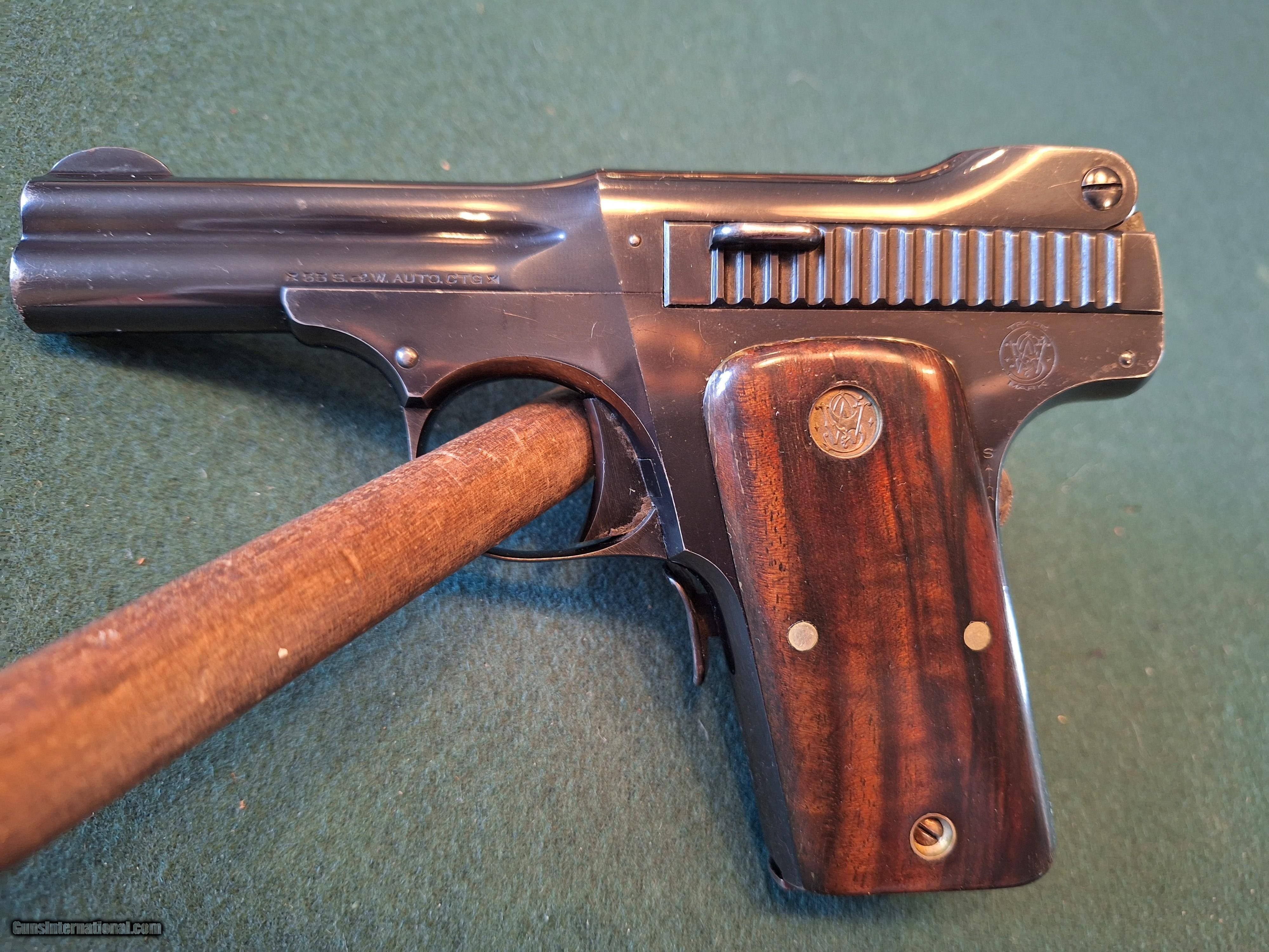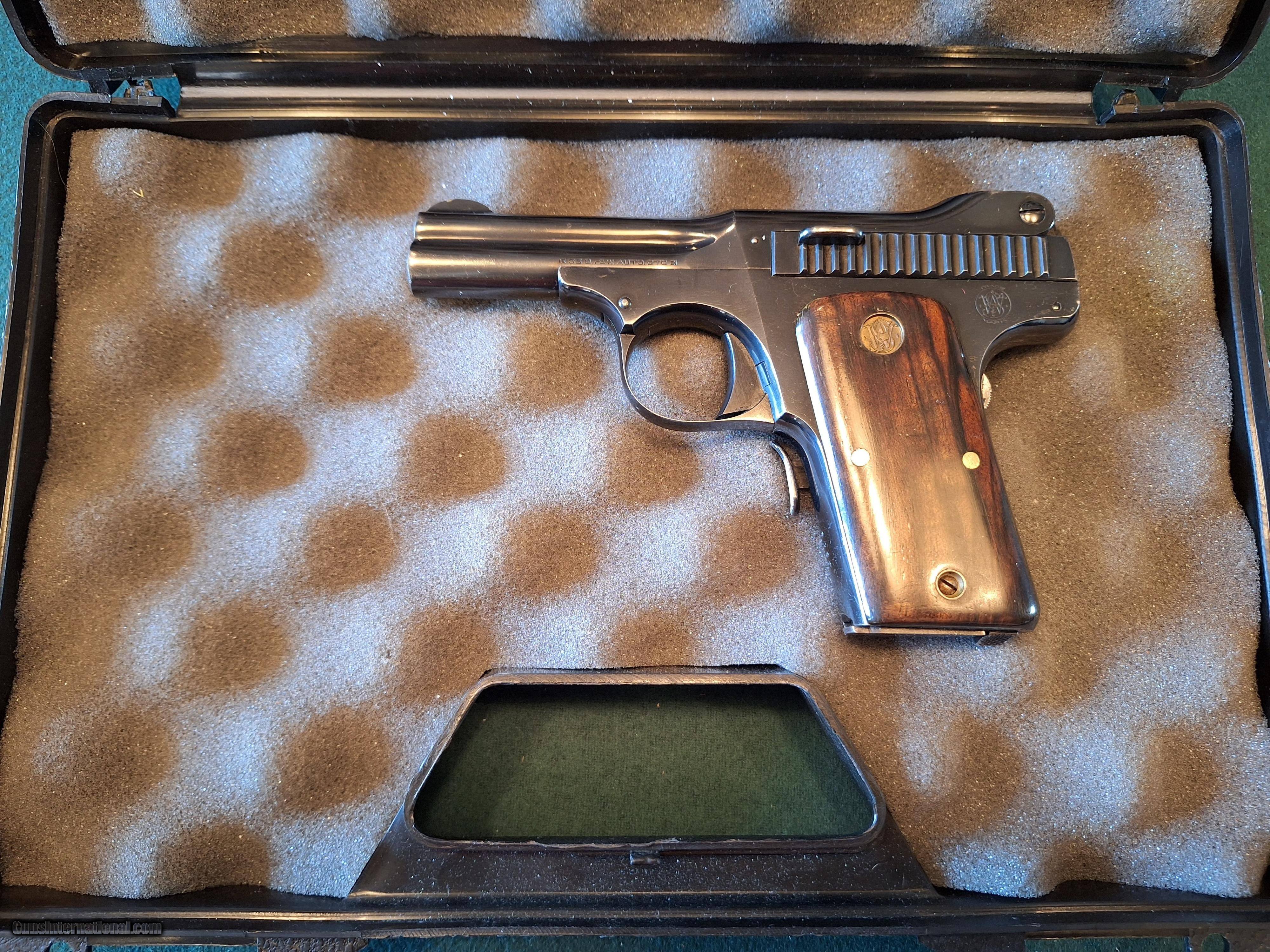 Description: Smith & Wesson. Model 1913 semi auto pistol. Cal 35 S&W (32acp) 3.5” barrel with a near mint bore. This is the first of Smith & Wesson’s designs for an automatic pistol. Pistol is in NEAR mint condition overall. Serial # 3087. Manufacturer: S&W Model: 1913 Serial Number: 3087 Barrel Length: 3.5 Condition: Excellent Metal Condition: Excellent Wood Condition: Excellent Bore Condition: Excellent Action: Semi Price: $1,250.00 Contact Seller |