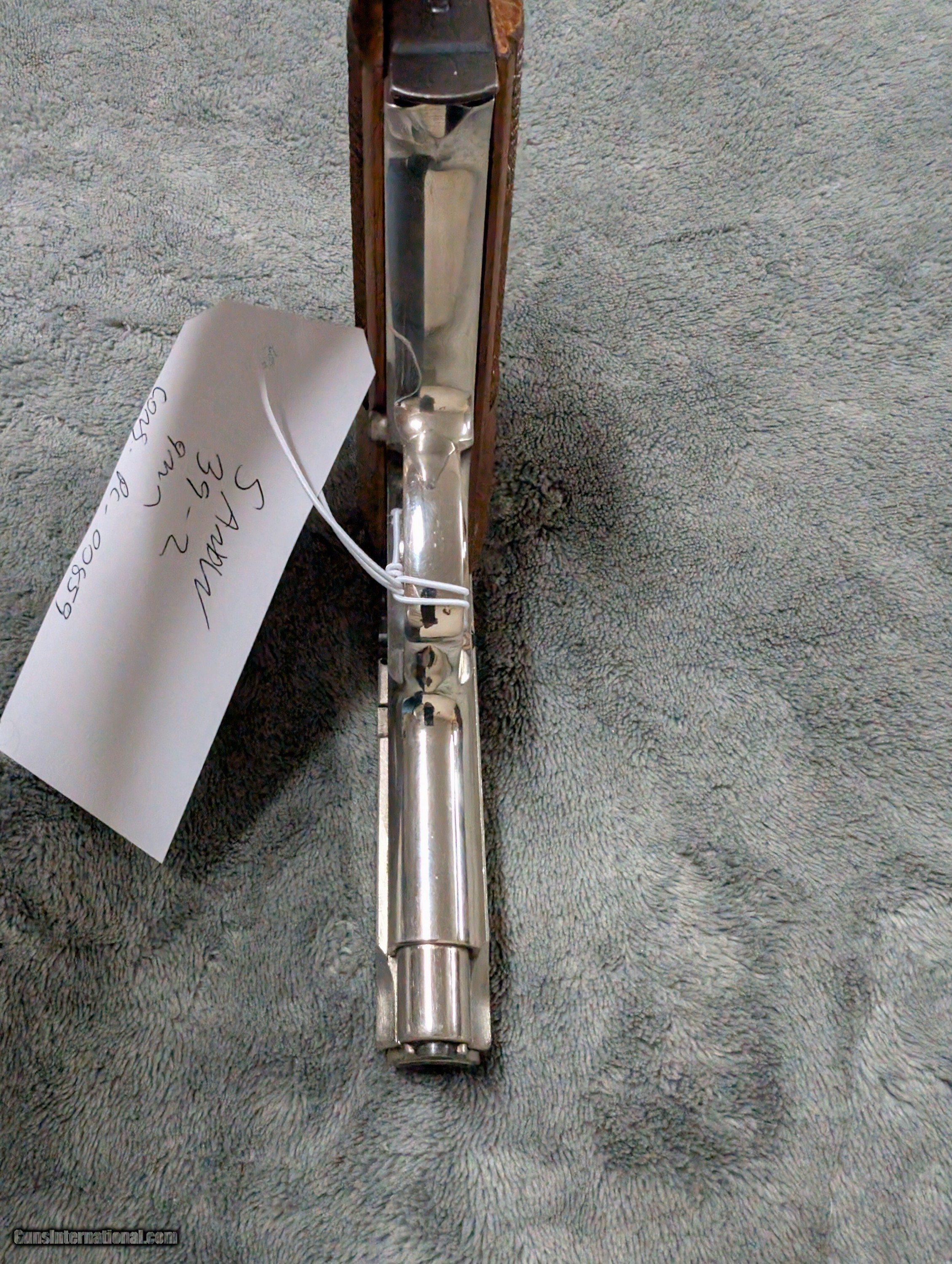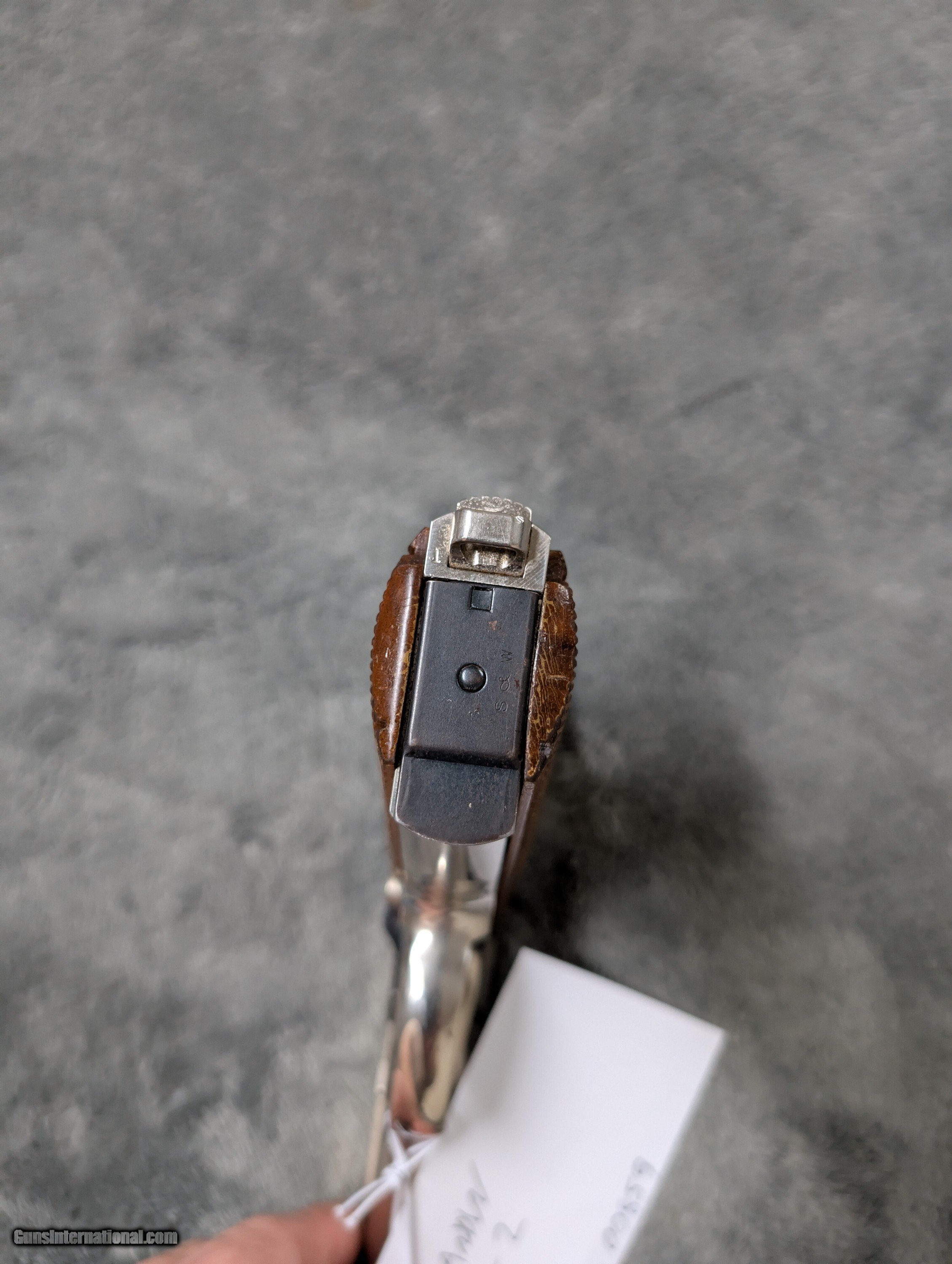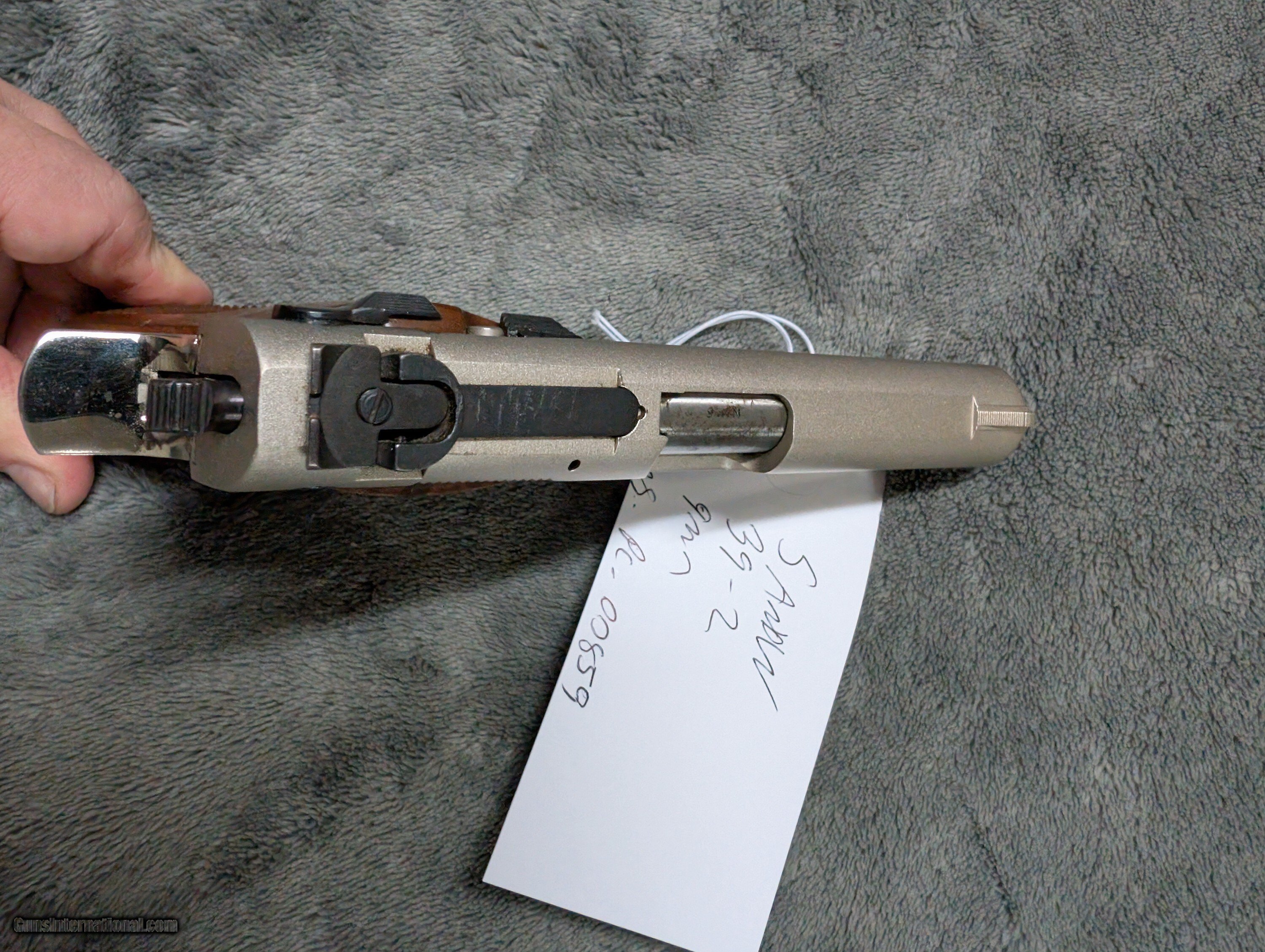 Description: CONSIGNED This Smith & Wesson Model 39-2 in 9mm remains on very good condition. There are a few small dings on the bottom of the grips, and a slight amount of discoloration on the top of the barrel hood. the majority of the finish remains intact. The bore is excellent. Please see pictures. Handgun Caliber: 9x19mm Parabellum (9mm Luger, 9x19mm NATO) Manufacturer: SMITH & WESSON Model: 39-2 Serial Number: A441229 Barrel Length: 4 Condition: VERY GOOD Metal Condition: VERY GOOD, SMALL AMOUNT OF DISCOLORATION ON BARREL HOOD Wood Condition: VERY GOOD, SOME SMALL DENTS ON GRIPS Bore Condition: EXCELLENT Item Location: 49253 Price: $795.00 Shipping: $55.00 Contact Seller |
