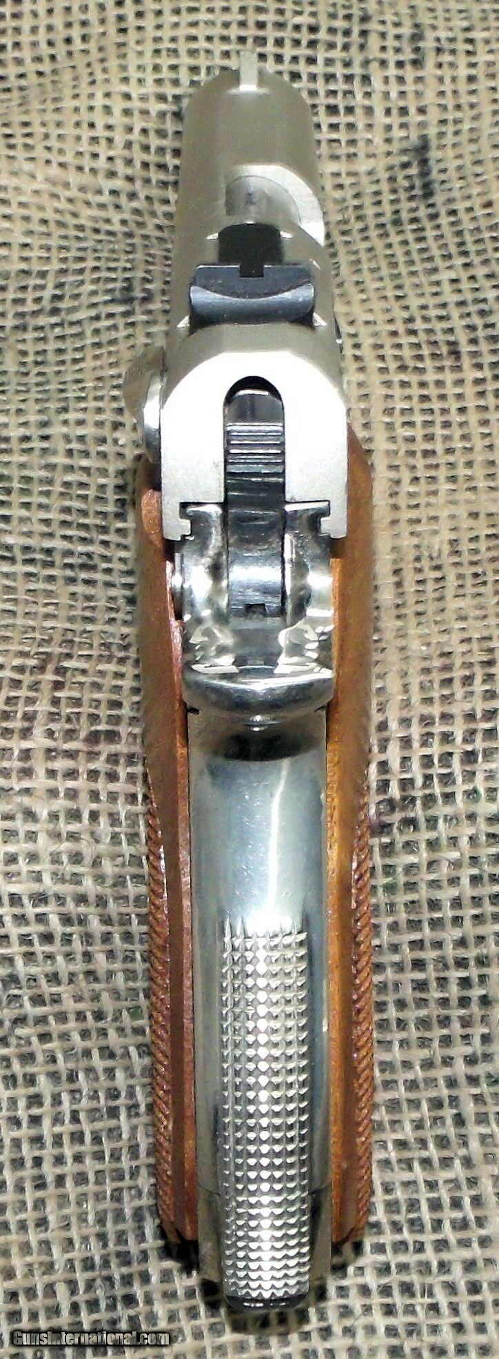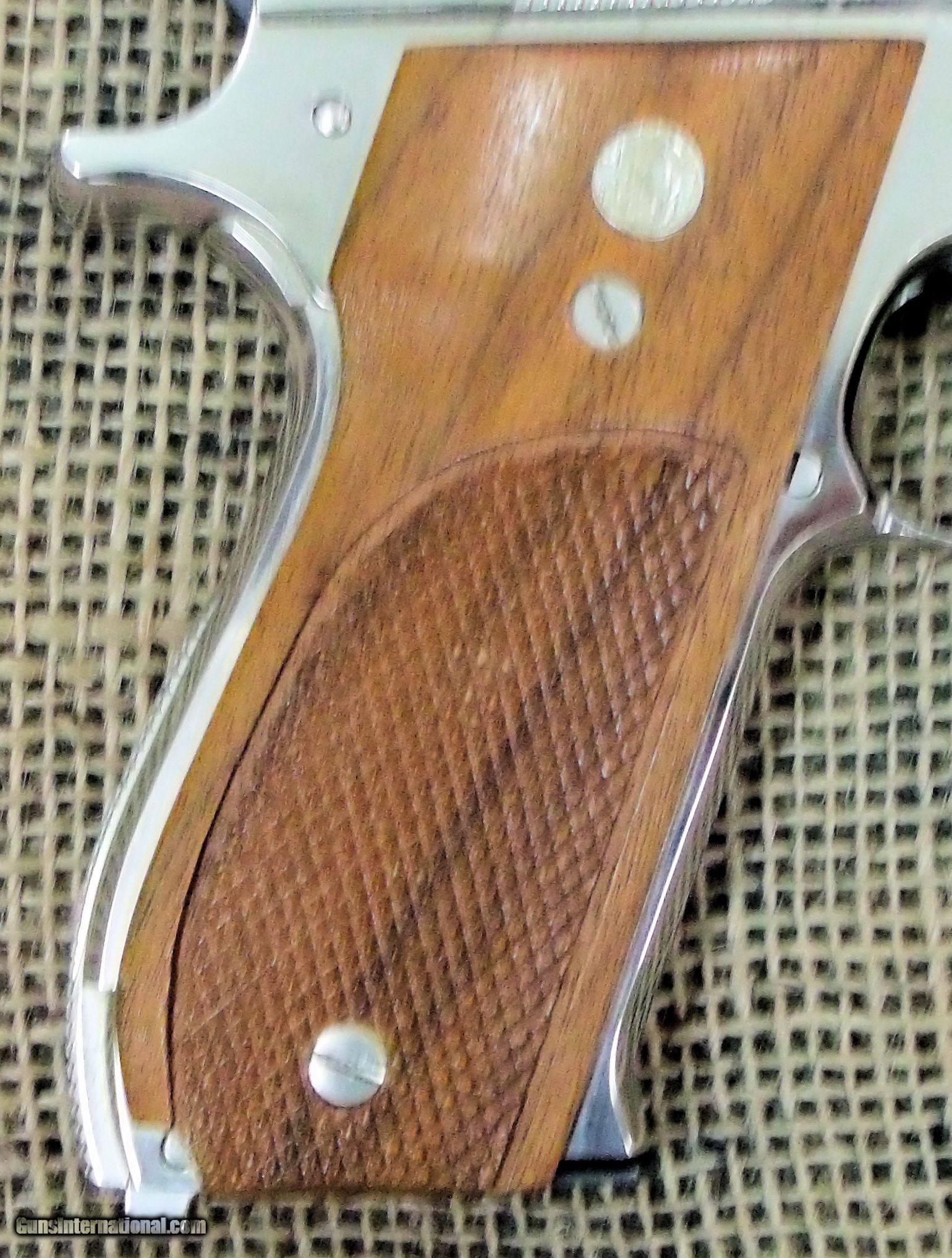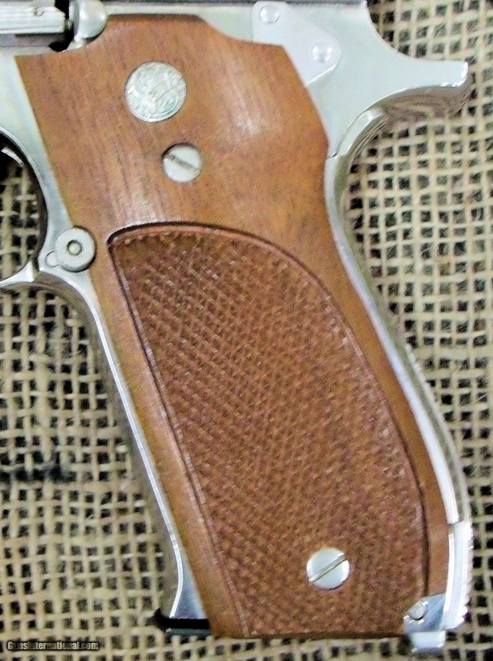 Description: Up for sale is a very nice(98% overall condition) Smith & Wesson model 39-2 semi auto pistol in 9mm Cal. This 1974 production pistol features a factory Nickel metal finish, 4 inch barrel, checkered wood factory grips, and a adj. rear sight. The pistol comes with 2 factory 8 rd. magazines and owners manual in its. factory box. J & M accepts Visa, MC, and Discover via telephone at 205-695-7574 from 8AM to 5PM CST, Mon-Sat and also Mo or Cert. Ck. mailed to J & M Trading Post, PO Box 1375, Vernon, AL 35592. The listed price reflects a 3% cash equivalent discount. A $40.00 shipping and ins. chg. will be added to the purchase price. The pistol must be shipped to a FFL dealer. SOLD Manufacturer: Smith & Wesson Model: 39-2 Caliber Info: 9mm Condition: 98% |
