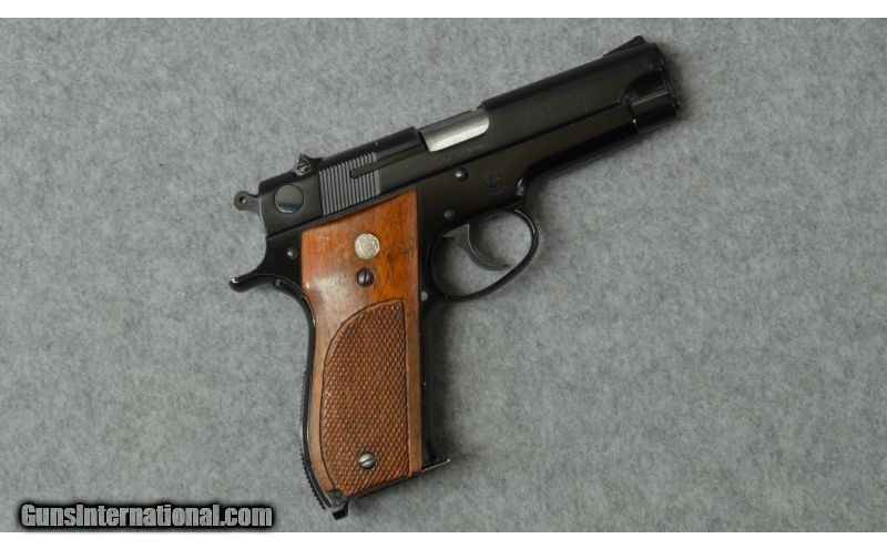Description: This is a nice Smith & Wesson, chambered in 9mm, and is in very good condition. SOLD Caliber Info: 9mm. Chambers: Semi-auto. Detachable magazine. Metal Condition: Very good. Wood Condition: Very good. Bore Condition: Very good. Bright, and shiny. Barrels: 4" blued barrel. Triggers: SA/DA, blued trigger. Stock: Smith & Wesson checkered wood grips. Stock Dimensions: 7.5" overall length. Butt Pad: Smith & Wesson checkered wood grips. Weight: 29 ounces. Sights: Red ramp front, and adjustable rear sight. Item Location: Centerville, OH |