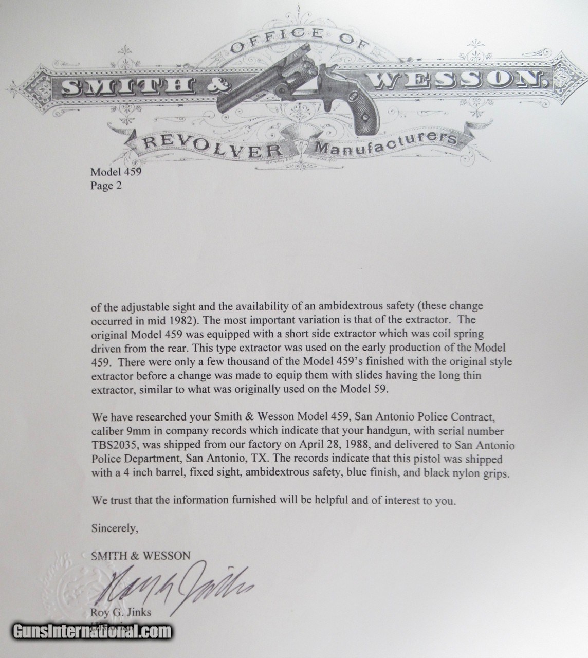 SMITH & WESSON MODEL 459 PISTOL from COLLECTING TEXAS – 9mm – SOLD to SAN ANTONIO POLICE DEPT. SWAT TEAM - 1988