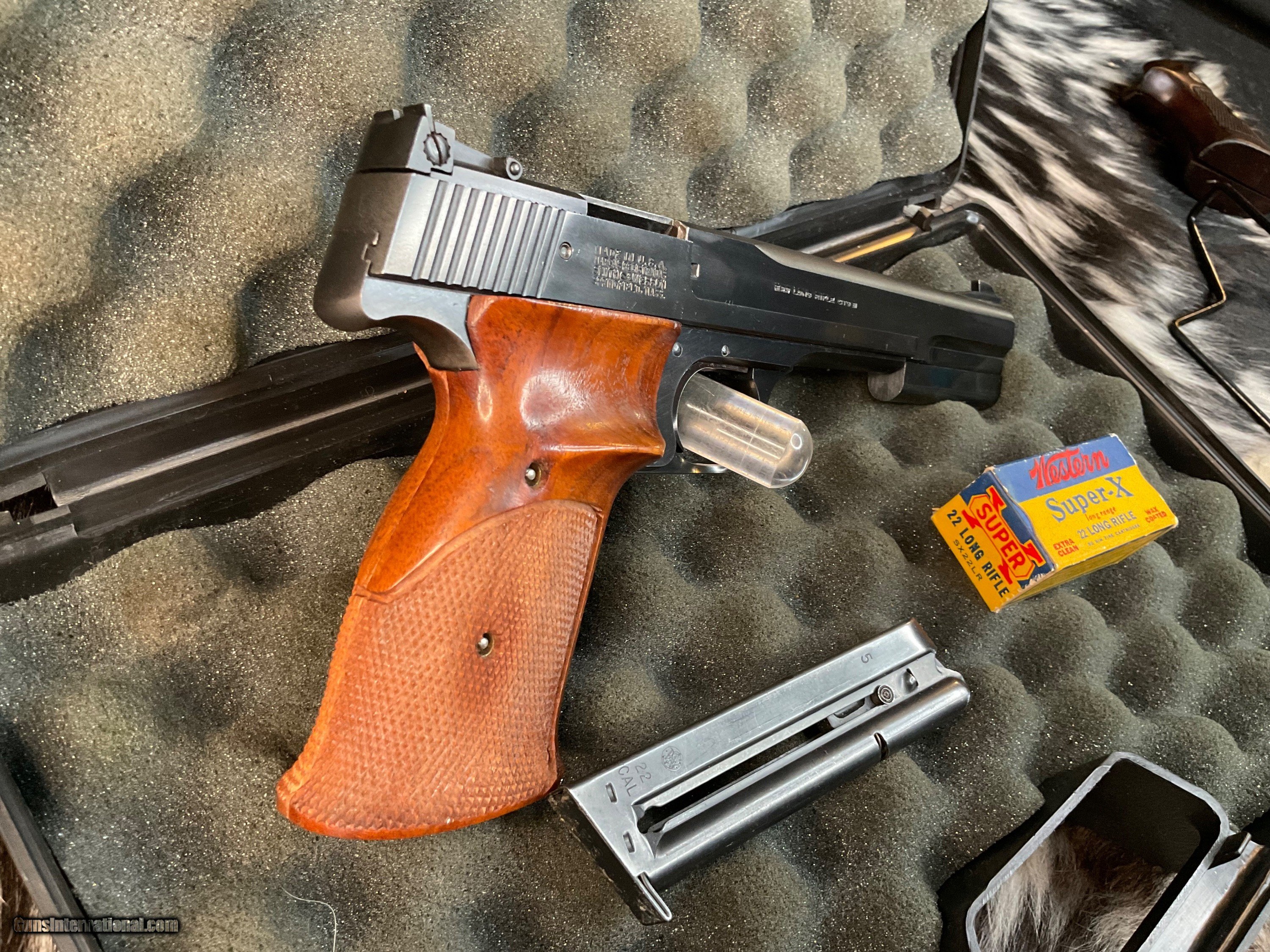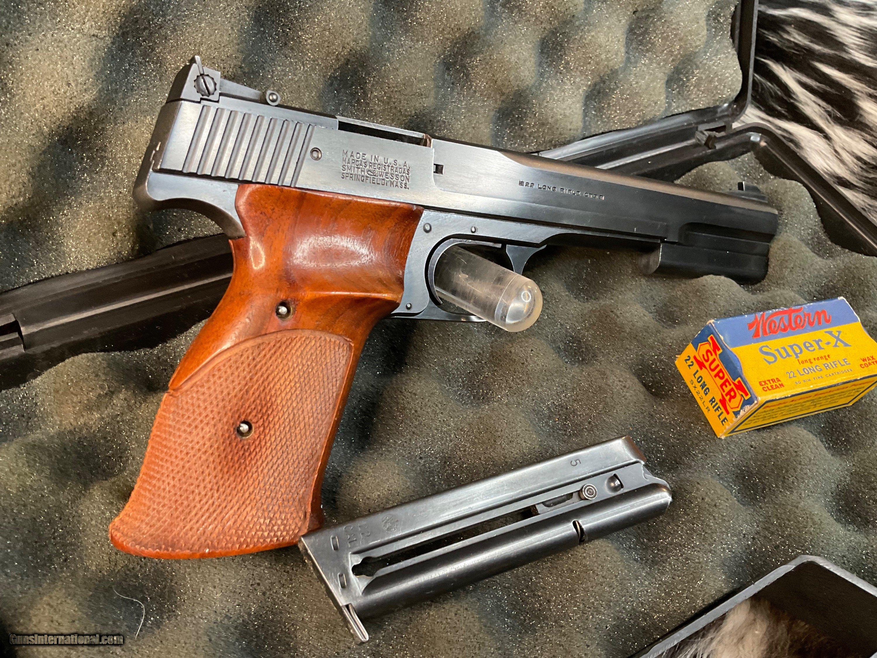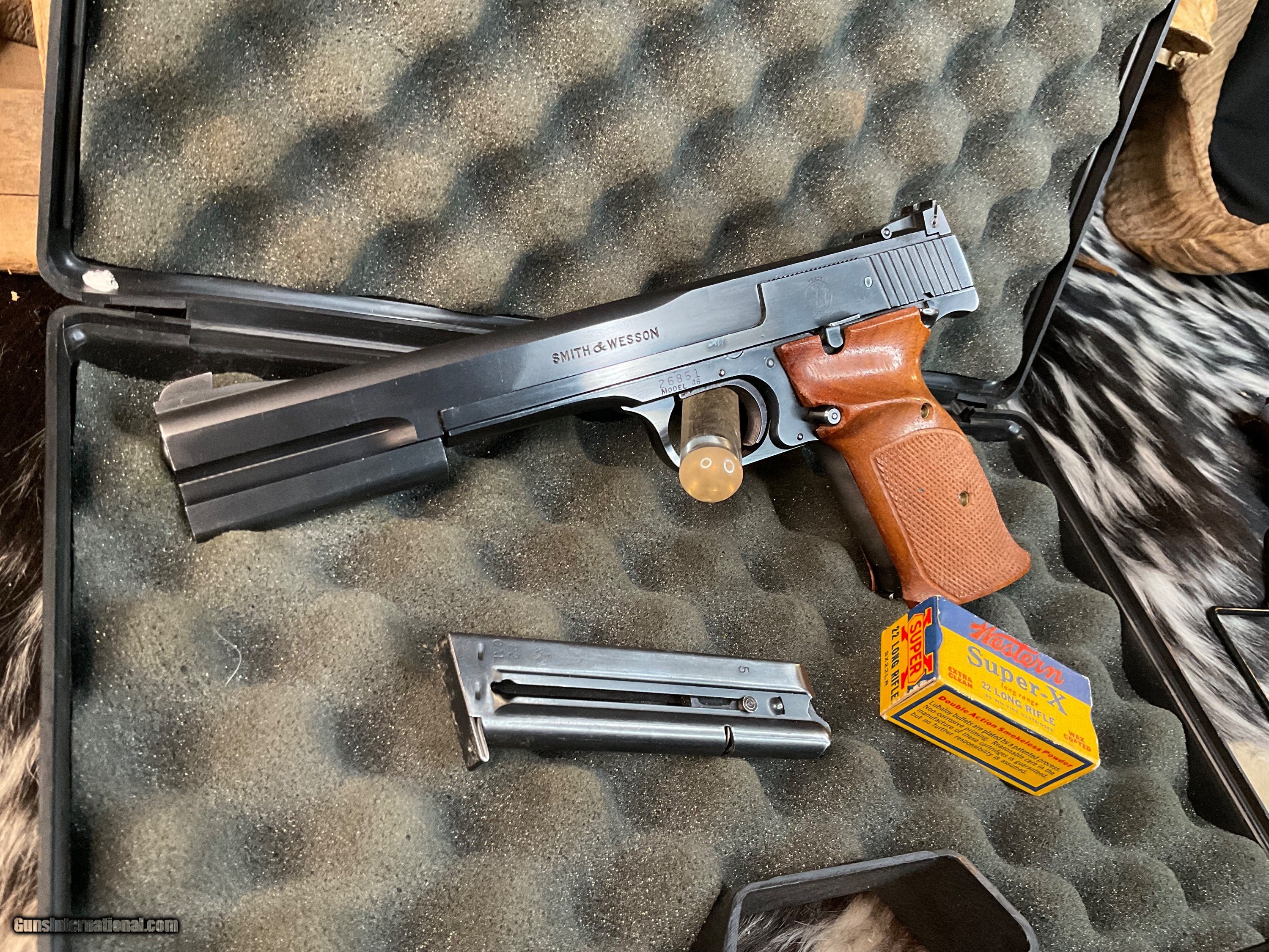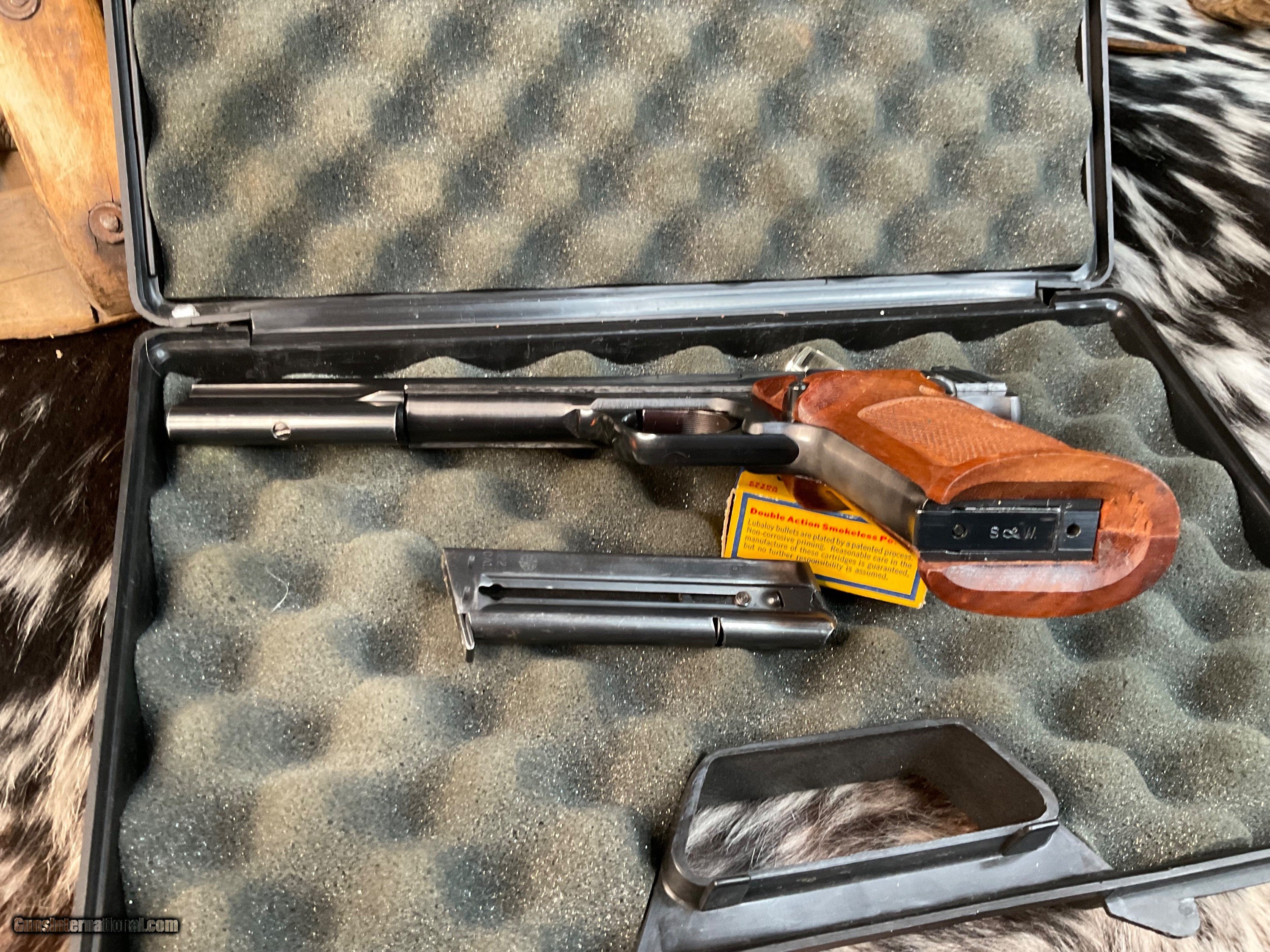 Description: Smith & Wesson model 46 Target Pistol manufactured in USA From 1957 to 1966 with total production of 4000 pistols. This is a scarce model wearing the 7 inch Blued Heavy barrel with front barrel weight attached. Adjustable target sights with premium checkered Walnut thumb rest target grips. Original finish is excellent with 97% or better remaining. Tight slide to frame fit with action cycling as intended. Gun comes in generic hard case with two S& W factory 10 round magazines. A great accurate handgun to desquirrel a woods or enjoy countless hours killing paper Zombies. With a trigger like butter this pistol will make you look good! Add 3% if paying with credit cards. Free shipping for all US. Veterans. God Bless America from a proud American, and a Viet Nam Vet , thankful for our freedoms.. paid for by the Blood ,Sweat and Tears of our brave men and women in uniform. Ten Below Firearms is a Veteran owned and operated business. We specialize in out of production models of high quality firearms. We love to ship! We ship to all states where legal, just give us a call! Handguns normally ship for $35 and Long guns for $50 and up for extra length long guns. That's 2-3 day USPS Priority shipping, Delivery conformation and with tracking number. Optional Postal insurance is additional $1.85 per $100 and highly recommended. We are OPEN BY APPOINTMENT ONLY FOR IN PERSON VISITS, We trade, sometimes. All payments sent via USPS Priority mail must be received within FIVE DAYS of date of purchase or item will be relisted for sale. **PROPS MAY BE USED FOR PHOTOS, PROPS ARE NOT INCLUDED WITH THE SALE OF THIS FIREARM** Thank you! Layaway:If needed we offer a 60 day layaway program. We offer FREE 60-day layaway. Buyer must pay at least 1/3 down, 1/3 Due in thirty days and the final balance due in sixty days. On all uncompleted layaways, all payments made will be non-refundable. The 60 days begins the day the buyer commits to buying the gun. 90 day layaway is available with 1/2 down, via phone. All layaway sales are final. Layaway is not available on negotiated prices. SOLD Handgun Caliber: .22 Long Rifle Manufacturer: Smith & Wesson Model: 46 Serial Number: 26851 Barrel Length: 7 inch Condition: Excellent Metal Condition: Excellent Wood Condition: Excellent Bore Condition: Excellent Barrel Type: Heavy target Action: Semi auto Triggers: Target 2.5 pounds Finish: Blued Sights: Adjustable target Manufacture Date: 1957-66 Extras: Ariel wts, two mags, case Case: Generic hardcase Item Location: Mn |
