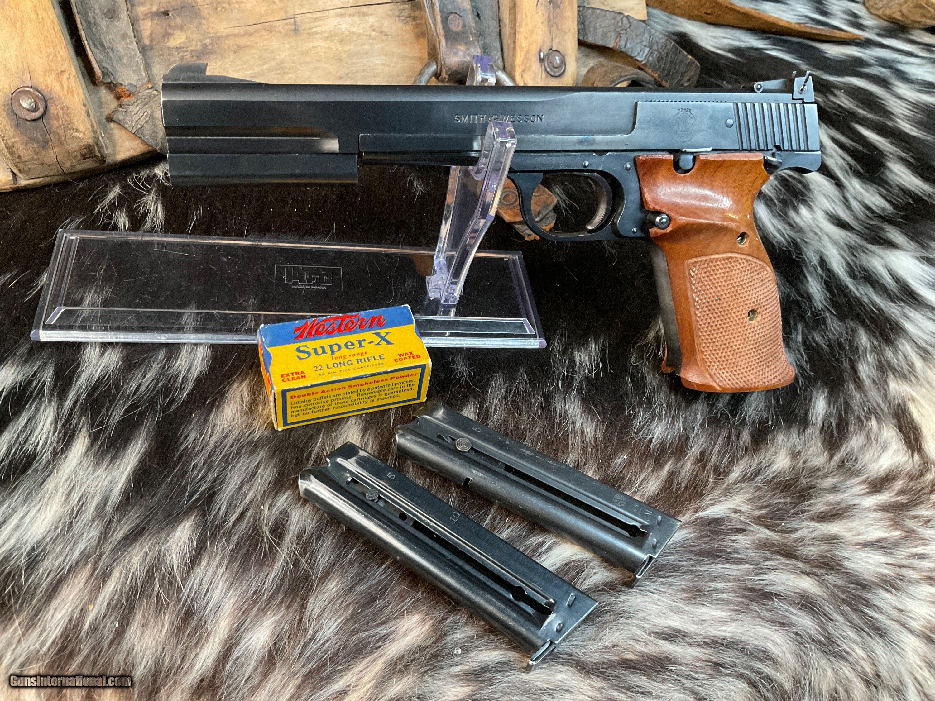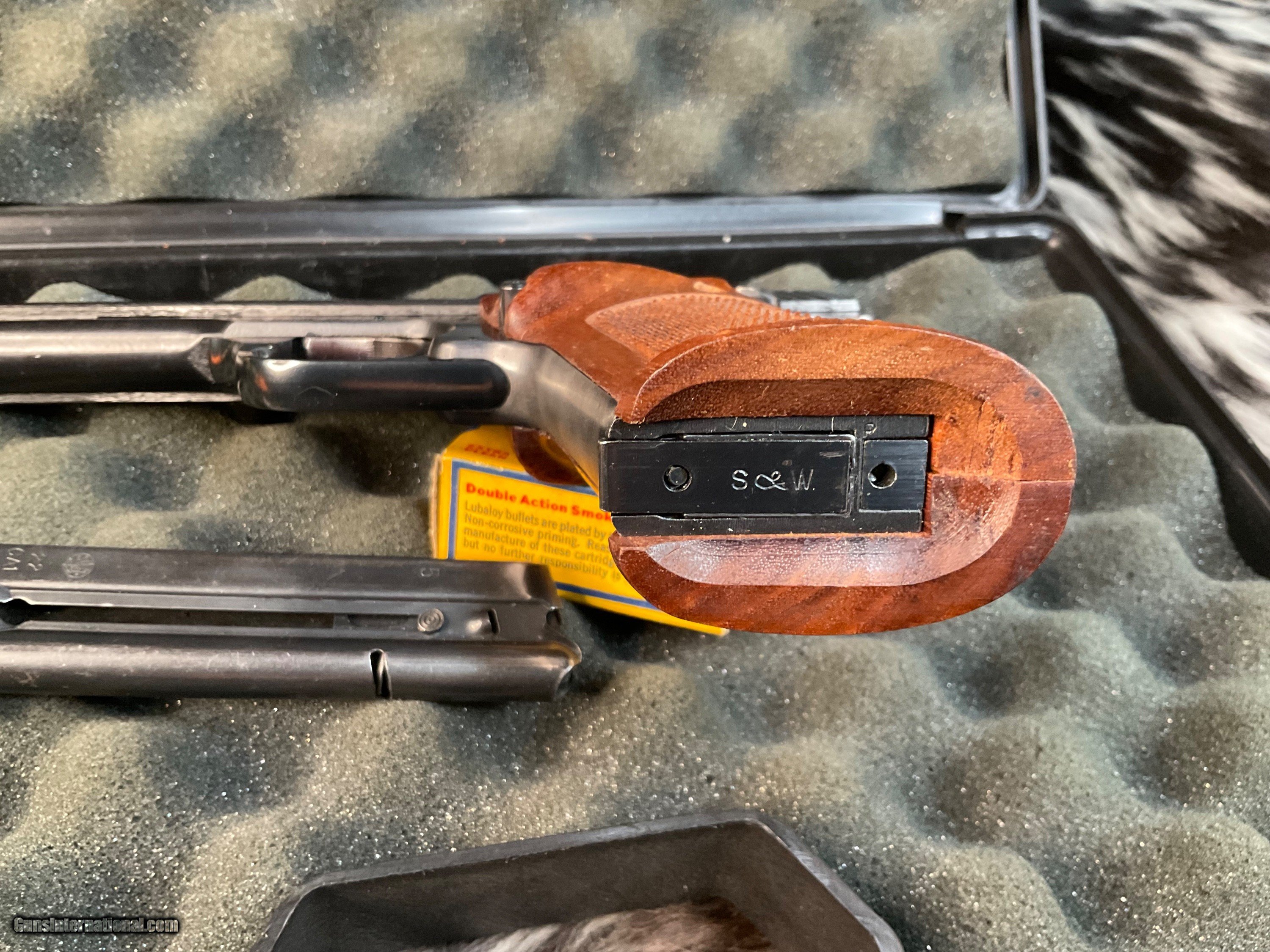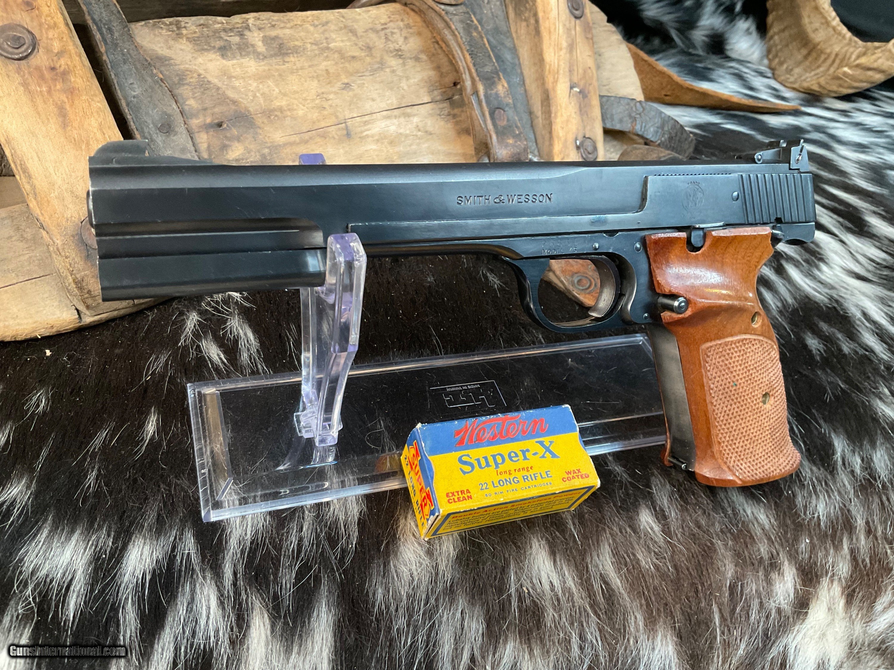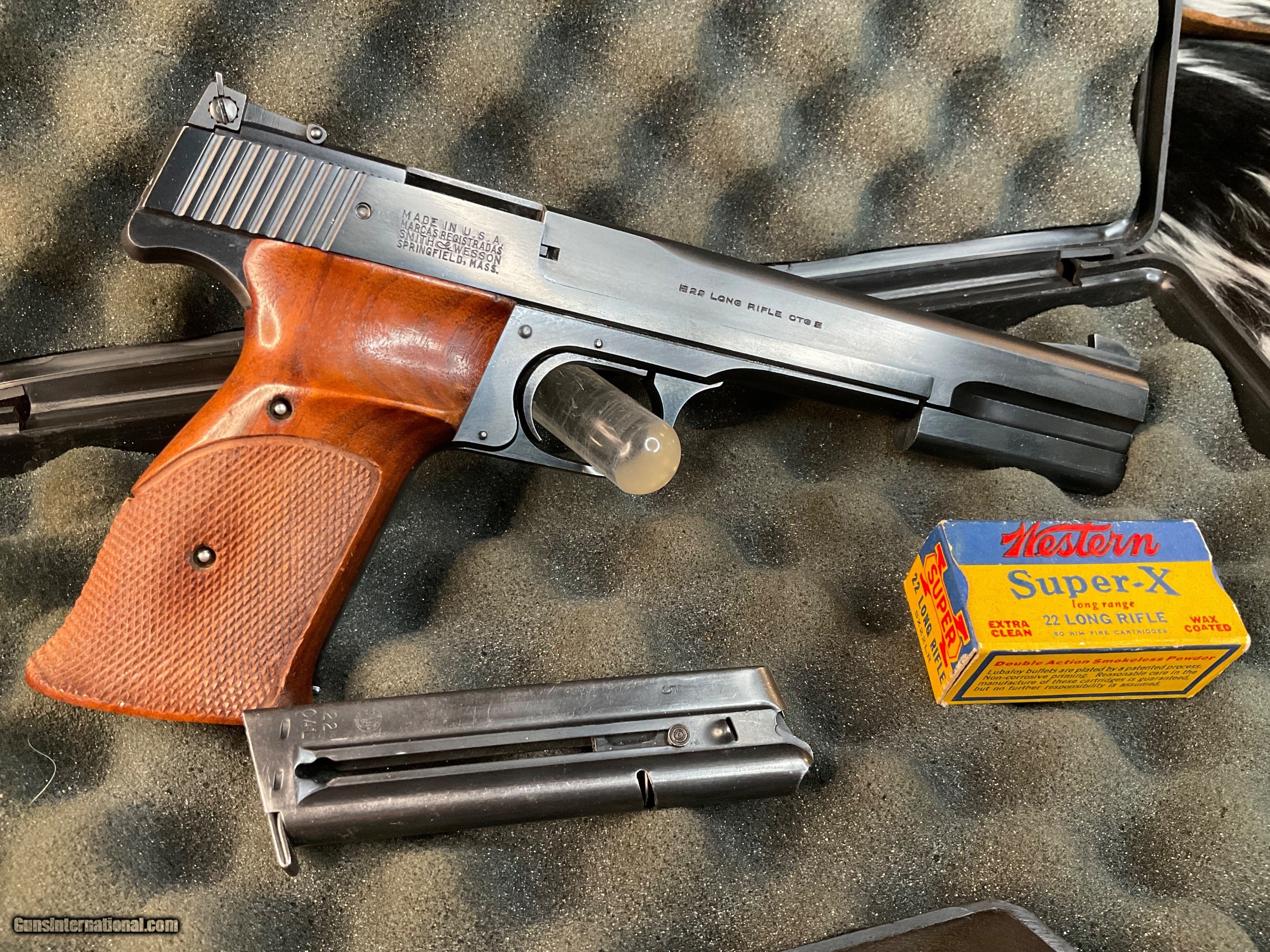 Description: Smith & Wesson model 46 Target Pistol manufactured in USA From 1957 to 1966 with total production of 4000 pistols. This is a scarce model wearing the 7 inch Blued Heavy barrel with front barrel weight attached. Adjustable target sights with premium checkered Walnut thumb rest target grips. Original finish is excellent with 97% or better remaining. Tight slide to frame fit with action cycling as intended. Gun comes in generic hard case with two S& W factory 10 round magazines. A great accurate handgun to desquirrel a woods or enjoy countless hours killing paper Zombies. With a trigger like butter this pistol will make you look good! Add 3% if paying with credit cards. Free shipping for all US. Veterans. God Bless America from a proud American, and a Viet Nam Vet , thankful for our freedoms.. paid for by the Blood ,Sweat and Tears of our brave men and women in uniform. Ten Below Firearms is a Veteran owned and operated business. We specialize in out of production models of high quality firearms. We love to ship! We ship to all states where legal, just give us a call! Handguns normally ship for $35 and Long guns for $50 and up for extra length long guns. That's 2-3 day USPS Priority shipping, Delivery conformation and with tracking number. Optional Postal insurance is additional $1.85 per $100 and highly recommended. We are OPEN BY APPOINTMENT ONLY FOR IN PERSON VISITS, We trade, sometimes. All payments sent via USPS Priority mail must be received within FIVE DAYS of date of purchase or item will be relisted for sale. **PROPS MAY BE USED FOR PHOTOS, PROPS ARE NOT INCLUDED WITH THE SALE OF THIS FIREARM** Thank you! Layaway:If needed we offer a 60 day layaway program. We offer FREE 60-day layaway. Buyer must pay at least 1/3 down, 1/3 Due in thirty days and the final balance due in sixty days. On all uncompleted layaways, all payments made will be non-refundable. The 60 days begins the day the buyer commits to buying the gun. 90 day layaway is available with 1/2 down, via phone. All layaway sales are final. Layaway is not available on negotiated prices. SOLD Handgun Caliber: .22 Long Rifle Manufacturer: Smith & Wesson Model: 46 Serial Number: 26851 Barrel Length: 7 inch Condition: Excellent Metal Condition: Excellent Wood Condition: Excellent Bore Condition: Excellent Barrel Type: Heavy target Action: Semi auto Triggers: Target 2.5 pounds Finish: Blued Sights: Adjustable target Manufacture Date: 1957-66 Extras: Ariel wts, two mags, case Case: Generic hardcase Item Location: Mn |