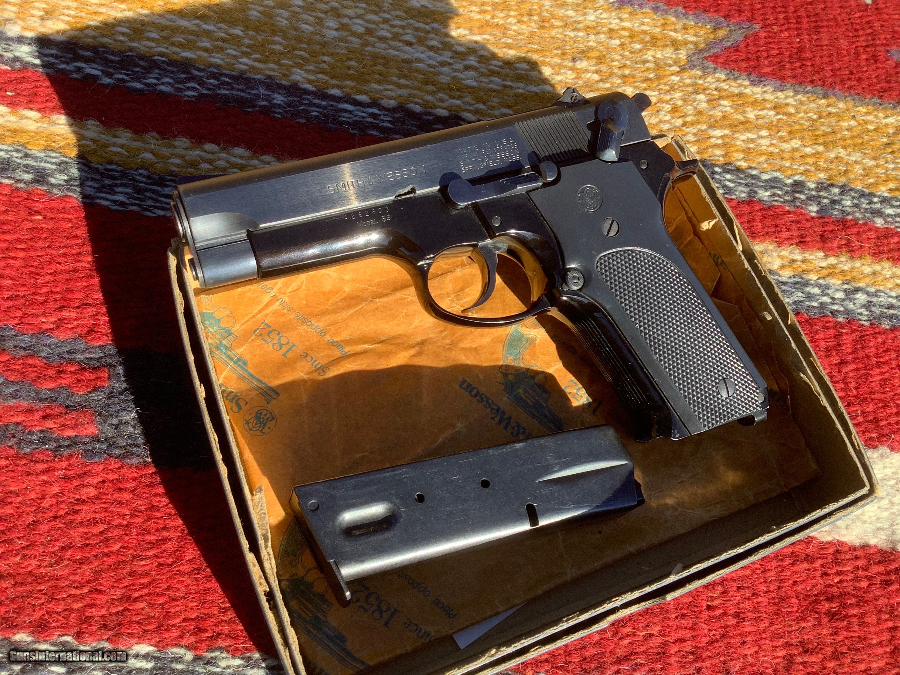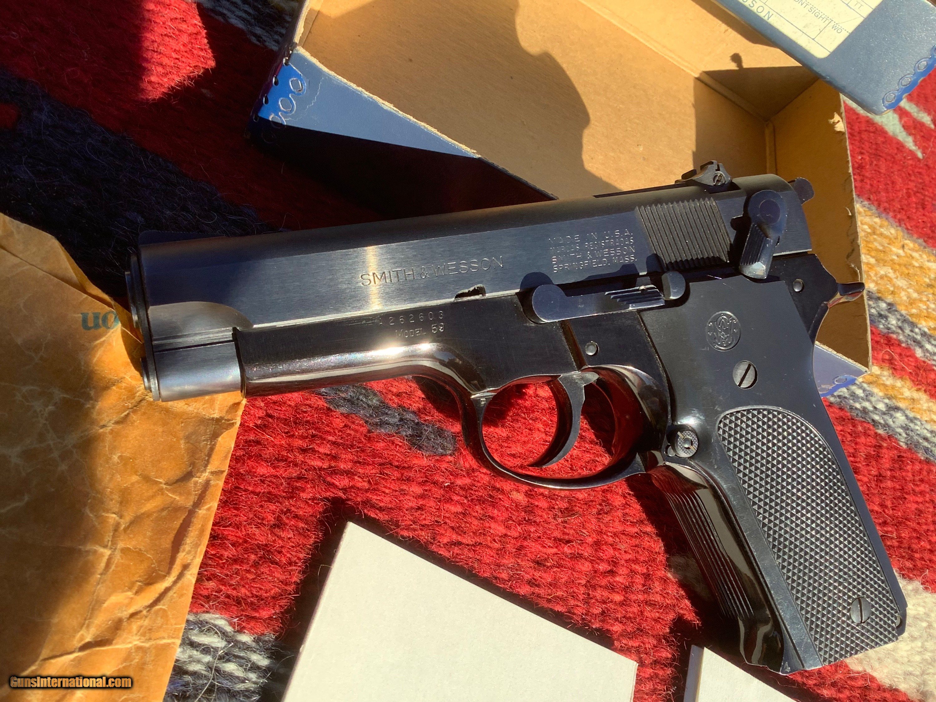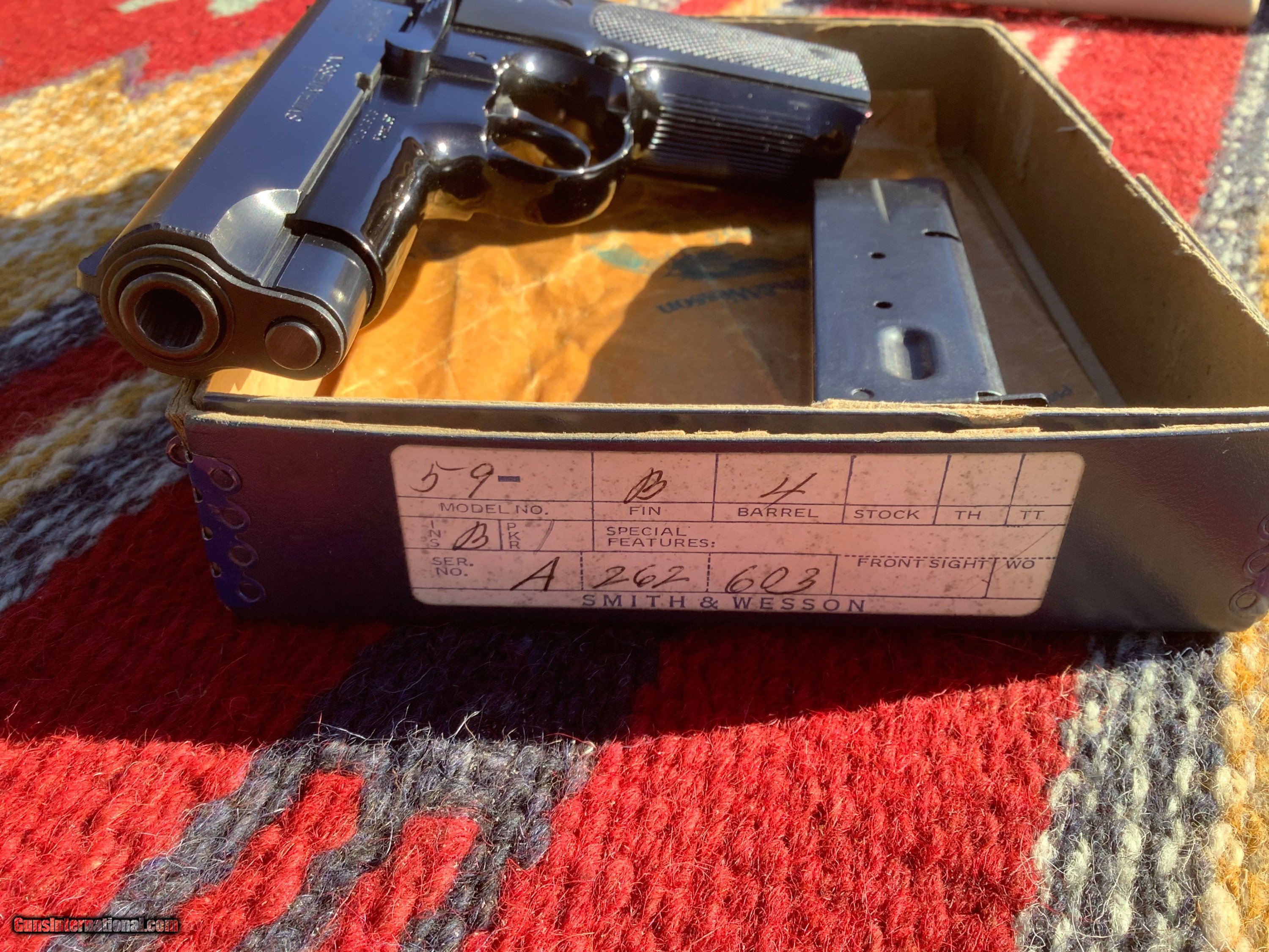 Description: Smith & Wesson 59, 9mm semi auto, single action , double action, 14 shot magazine, all in original box and in very good condition. This is old school semi auto when they were made of steel, very dependable piece. This one obviously has not been shot very much. Ship to FFL only, check, money order or cashiers check. $825.00, $50.00 shipping SOLD |