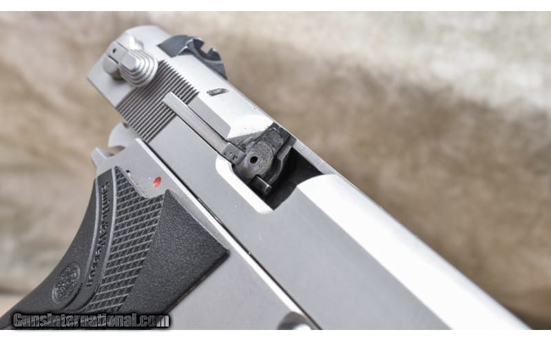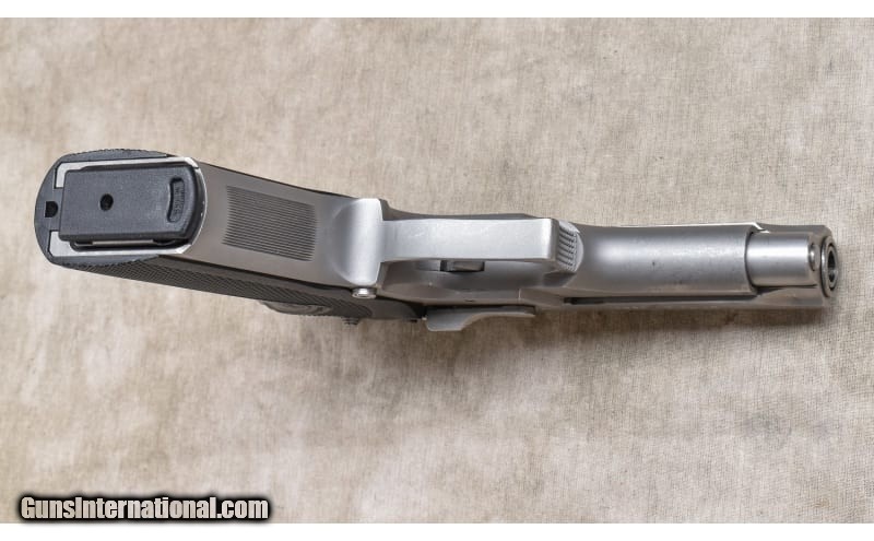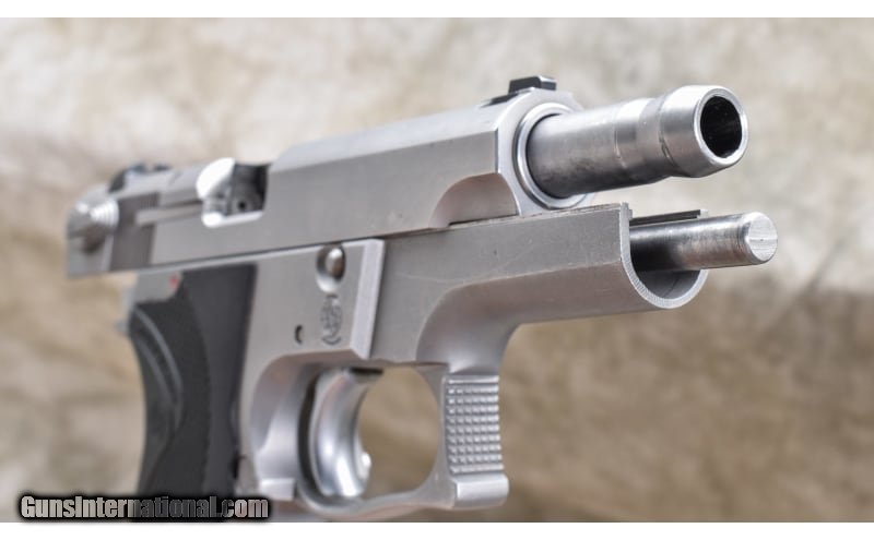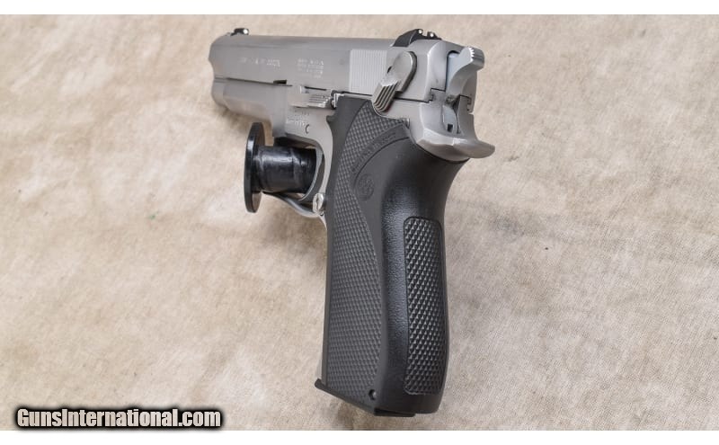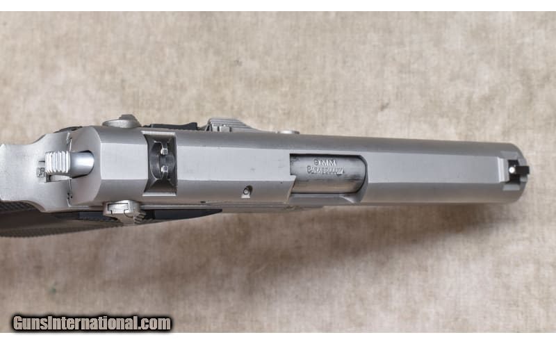 Description: This all-stainless steel pistol features ambidextrous safety, very generously sized trigger guard, and double stack magazine. They were designed for and used by police departments for many years. 9mm Luger SOLD Chambers: 14 Round detachable magazine. Wood Condition: Good with mild wear and handle marks. Bore Condition: Shiny with good rifling. Barrels: 4 Inches. Triggers: Factory double and single action trigger. Butt Pad: Checkered black synthetic. Weight: 38oz Sights: Front post with rear notch. Item Location: Rogers |