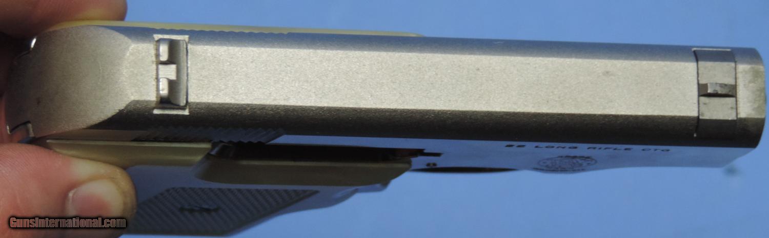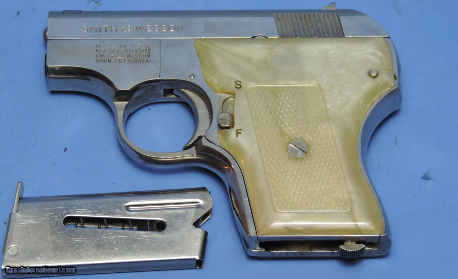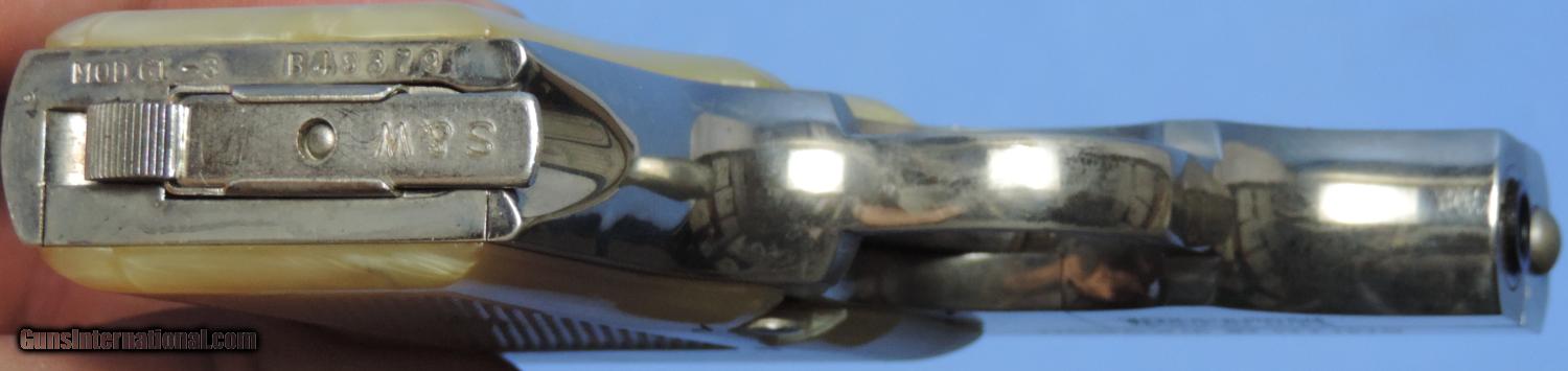 Description: Inv. 5579 Smith & Wesson Model 61-3, Nickel, Caliber 22 LR, Serial Number, B=4833XX. This minty 61-3 is the very last and perfected model of this lovely little pocket gem. The production run was exceedingly short, only 1970-1973. I think this was going into the period when "bigger is better". However the collectors and those that want a reliable small pocket gun would find this a super choice. The slide can be can be cocked by the even most feminine hand. The condition is super as the gun shows no use. From an estate collection of 16 unused guns. The nickel finish shows absolutely no wear, scratches or a loss of any sort. The grips are almost perfect. There is a tiny split on the right side from the cocking indicator hole to the edge of the grip. About a 1/4' long. This however has been professionally repaired. Please note that the cocking indicator is not missing as it is in many of this model S & W. The interior of the gun, the bolt face and feed ramp show no use. The bore like the balance of the gun shows no use and is in factory new condition. The rifling is mirror bright and razor sharp. The gun comes with two magazines. One nickel and one blued. A lovely little gem for a purse or jacket. $525. To purchase this firearm or if you want to request more information contact us at: Email ckgunsymail Phone 201-512-0002 Cell 201-575-6838 FAX 201-215-4759 We accept most major credit cards. Prices shown are Discounted 3% for Cash or Check. The buyer must be familiar with all the laws governing the purchase and the ownership of firearms in their own city and state. The Yankee Armorer, Inc is not responsible for any failure to comply with or observe these laws. The Yankee Armorer, Inc will only ship after full payment and receipt of all required documents. Shipping: Add $35.00 for handguns, $45.00 for long guns. New Jersey buyers are subject to a 7% sales tax. The Yankee Armorer, Inc offers a 3 day inspection period with full refund upon return of intact firearm and in the original condition. The Yankee Armorer, Inc offers a no interest lay away program - 25% down; 25% in 30 days; 25% in 60 days; and full payment in 90 days. Any violation of this policy is subject to restocking and forfeiture of all payments. Any variation from this policy must be agreed to in advance. Unshipped Cancelled sales are subject to a 20% restocking fee. Be advised that all firearms sold by The Yankee Armorer, Inc. or the Gun Exchange, LLC (SELLER) are sold as collector’s items. They have not been fired or tested for safety and must be examined by a license gunsmith prior to use. By purchasing any item from the (SELLER), you are agreeing to hold the (SELLER) free from any damages or lawsuits of any nature. Any item left for transfer or storage will be charged to $25.00 per month, per item from the day of its receipt. Any variation from this policy must be agreed to in advance. Store hours 10:00 am to 5:00 pm Tuesday -Saturday. It's always best to call for appointment. Store 201-512-0002, cell 201-575-6838. SOLD |