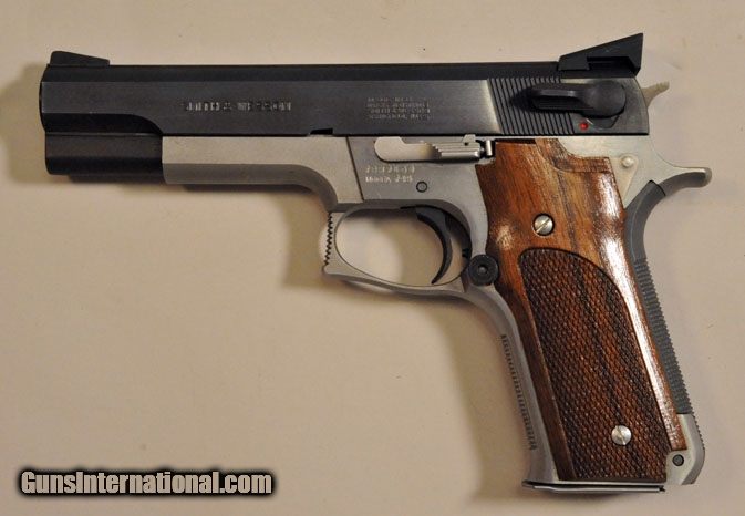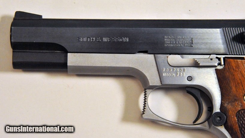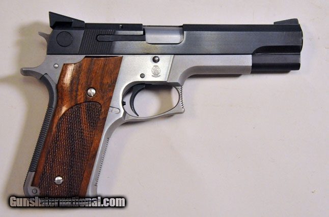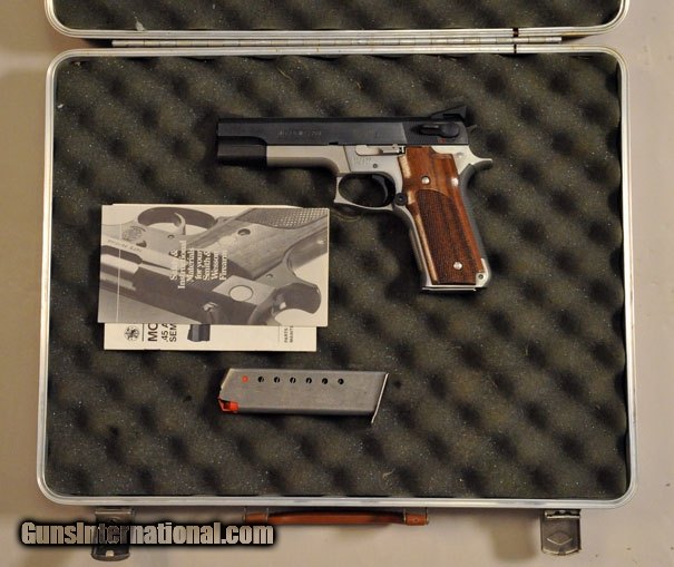 Description: Smith & Wesson Model 745 Ser. No. TBK7608. .45 ACP- 5" barrel. Stainless frame with steel slide and checkered walnut stocks. Comes with 2 mags, papers and hard case. SOLD |