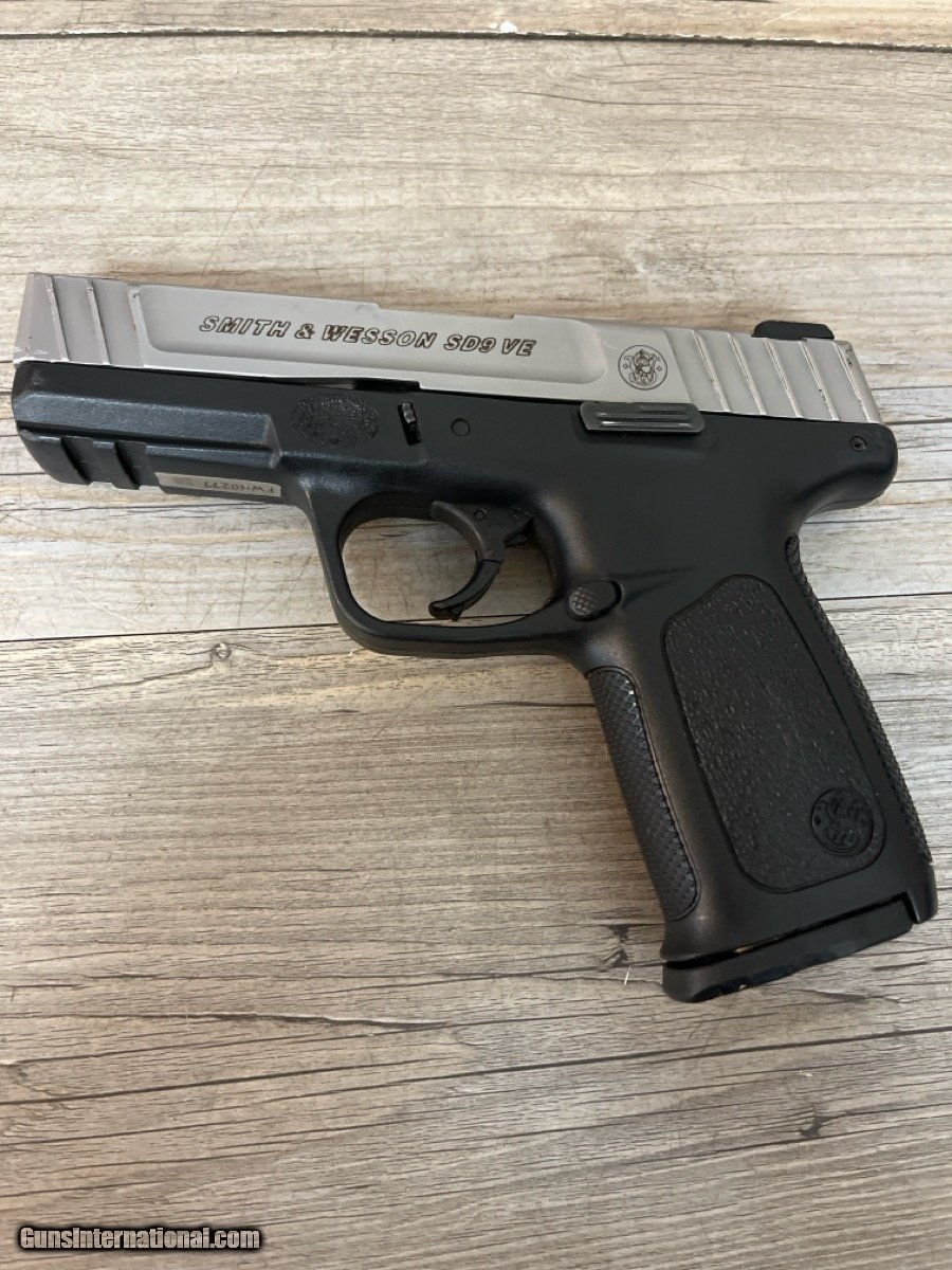 Description: Guns Listing ID: 531833 PISTOL: SMITH & WESSON MODEL SD9 VE, SERIAL NUMBER FWN0277, SEMI - AUTOMATIC, 9X19MM, MATTE STAINLESS, 4\", WITH EXTRA MAG Smith & Wesson SD9 VE 9mm Pistol The Smith & Wesson SD9 VE is a striker-fired, semi-automatic 9mm handgun designed for personal protection, home defense, and range use. Known for its reliability and affordability, the SD9 VE offers a balance of performance and value, making it a popular choice among both new and experienced shooters. Key Features: Caliber: 9mm Luger Capacity: 15+1 rounds Barrel Length: 4 inches Frame: Polymer with stainless steel slide Sights: White-dot front and fixed 2-dot rear sights Action: Striker-fired Safety: No manual safety; features a trigger safety Weight: Approx. 22.4 oz (unloaded) The SD9 VE features an ergonomic grip with aggressive texturing, providing a secure and comfortable hold. The stainless steel slide with front and rear serrations offers durability and ease of operation. Its self-defense trigger (SDT™) provides a smooth, consistent pull for enhanced accuracy. Whether you‚‚re looking for a dependable home-defense firearm or a budget-friendly option for the range, the SD9 VE delivers solid performance in a straightforward, no-frills package SOLD Manufacturer: SMITH & WESSON Model: SD9 VE Caliber Info: 9MM LUGER (9x19 PARA) Condition: Used - Non-Certified Barrels: 4 Action: SEMI AUTOMATIC Finish: two tone |