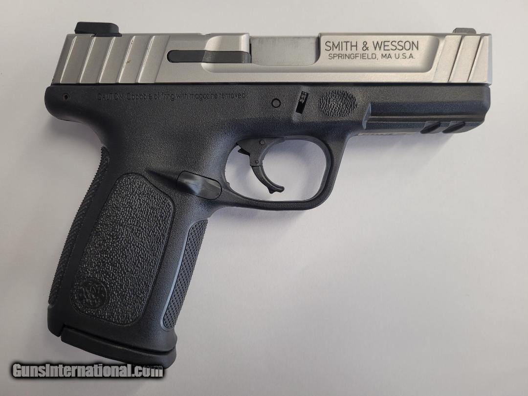 Description: Guns Listing ID: 881823 Smith & Wesson, SD9VE, Striker Fired, Semi-Automatic, Polymer Frame Pistol, Full Size, 9MM, 4\" Barrel, Silver Slide, Black Frame, Fixed Sights, 16 Rounds, 2 Magazines, 1 MAG 30 RDS FACTORY BOX Duo-tone finish SDT - Self Defense Trigger for Optimal, Consistent Pull Ergonomic, Textured Grip No Thumb Safety SOLD Manufacturer: SMITH & WESSON Model: SD9 VE Caliber Info: 9MM LUGER (9X19 PARA) Condition: Used - Non-Certified Barrels: 4 BARREL |