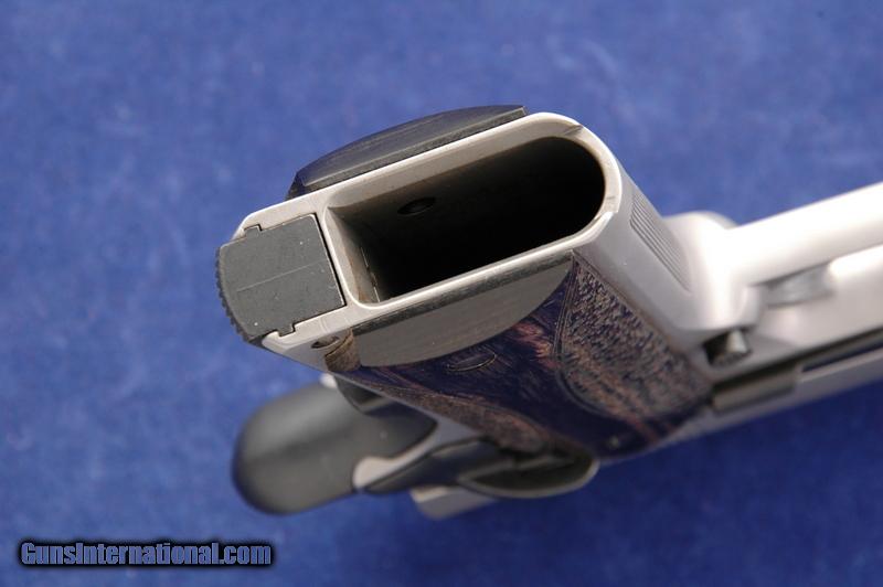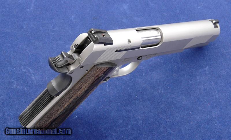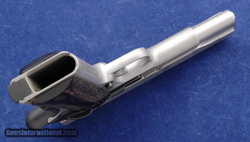 Description: Smith & Wesson Stainless steel, SW1911 chambered in .45acp and manufactures in 2008. This pistol features a 5” stainless barrel, chamber throated and polished, full length guide rod, lowered ejection port, skeleton hammer, Novak sights, beaver tail grip safety, extended thumb safety, under cut frame, checkered main spring housing, serrated front strap, and laminated wood grips. This 1911 is in excellent condition and comes in its factory box with 2 mag as well as its factory grips. SOLD |