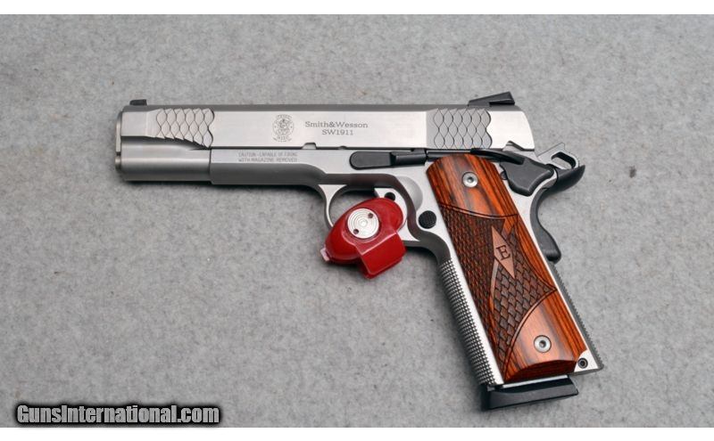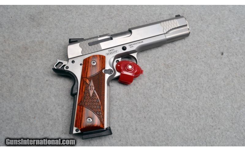 Description: This an "E" Series 1911 from Smith & Wesson. The slides mirror polish finish still shines bright with minor wear marks. Comes with box. SOLD Caliber Info: .45 ACP Metal Condition: Very good with few handling marks Wood Condition: grips are in excellent condition Bore Condition: Bright and shiny. Barrels: 5 Inch Triggers: Single Action Only Stock: Enhanced Laminated Wood Grip Weight: 38.4 oz Sights: Notched White Dor Rear - Blade White Dot Front Item Location: Hazelwood, MO |