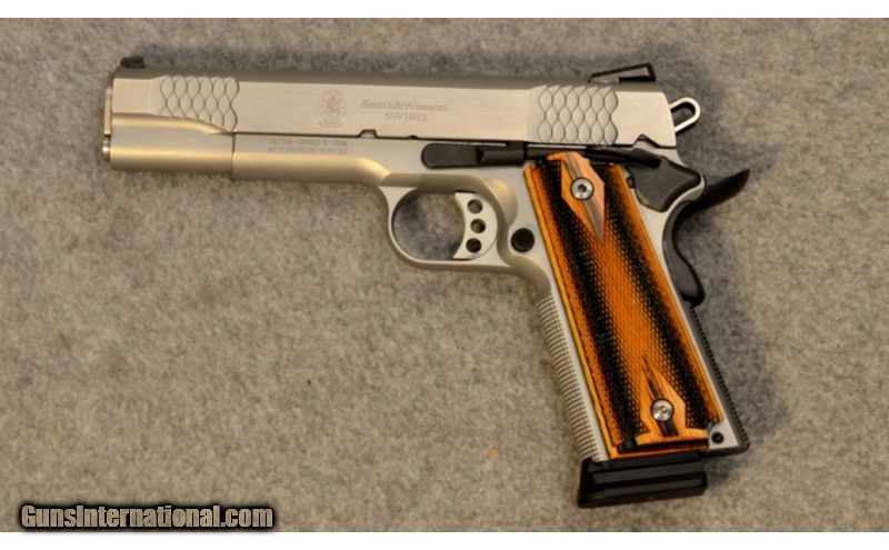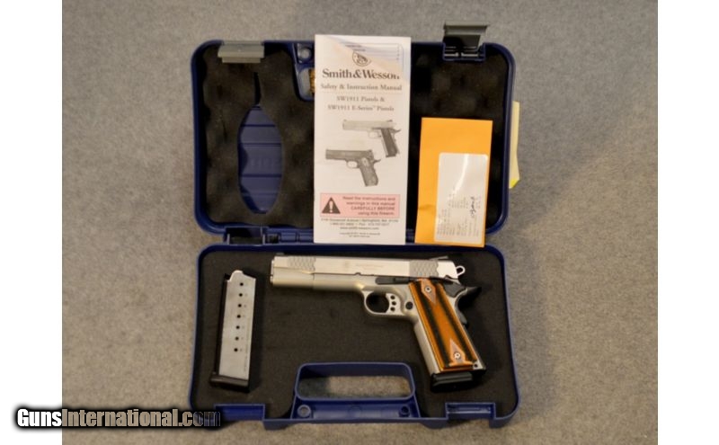 Description: This is a pre-owned Smith & Wesson SW1911. SOLD Caliber Info: .45 Auto Metal Condition: Excellent condition with a few light scratches. Wood Condition: Excellent condition. Bore Condition: Clean with bright lands. Barrels: 5 inch. Triggers: 3 hole aluminum. Stock: Checkered laminate, double diamond grips. Weight: 2 ½ lbs. Sights: Fixed 3-dot. Extras: Comes with the factory case, 2 magazines, and the manual. Item Location: Glendale, AZ |