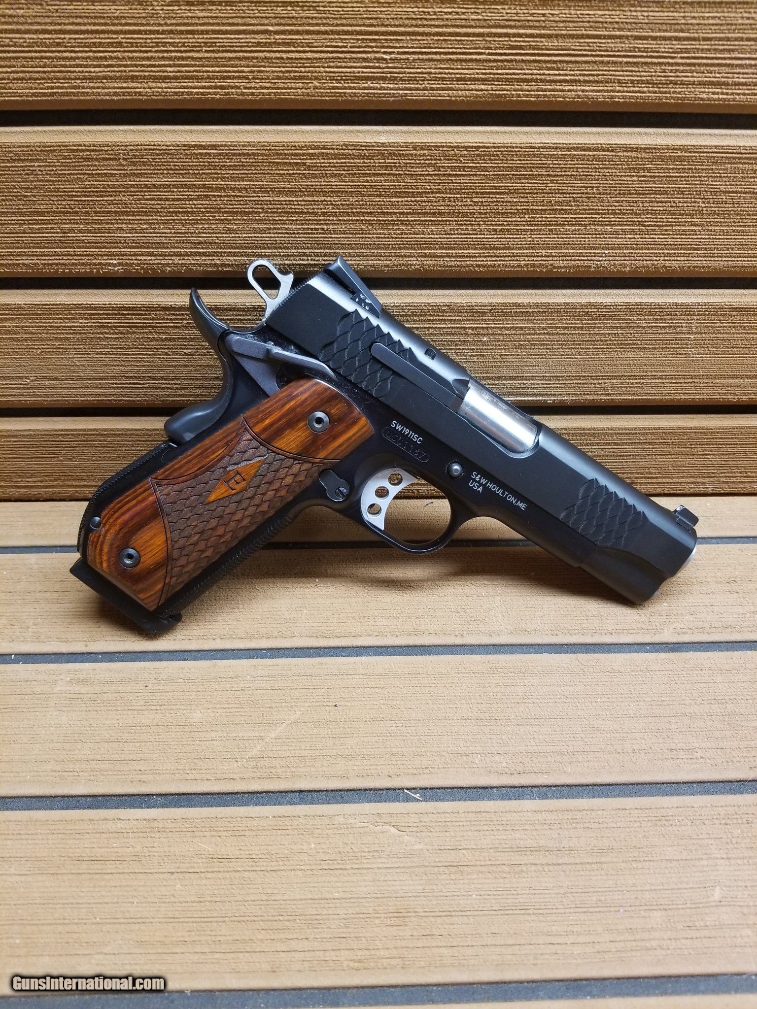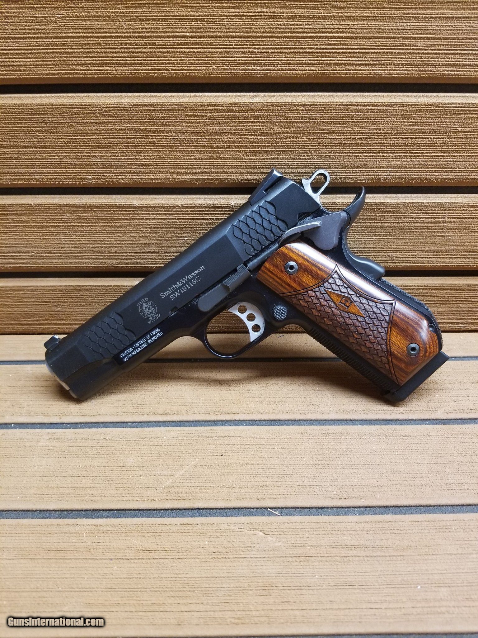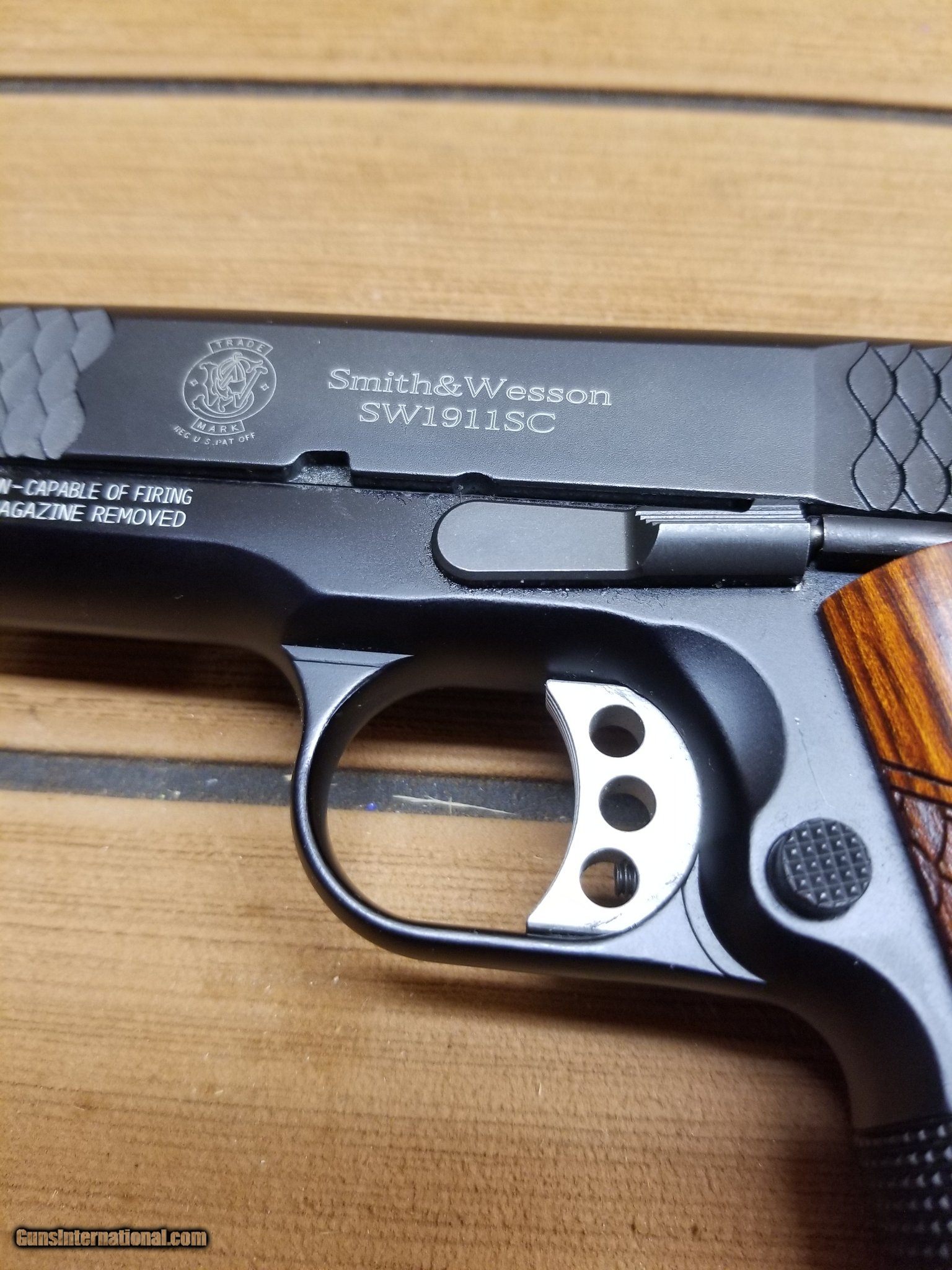 Description: Guns Listing ID: 1321182 Smith & Wesson SW1911SC, E-Series, Single Action Only, Semi-Automatic, Metal Frame Pistol, Commander, 45 ACP, 4.25\" Barrel, Scandium Alloy, Black, Wooden Laminate E-Series Grips, Tritium Night Sights, Manual Thumb Safety, 8 Rounds SOLD Manufacturer: SMITH & WESSON Model: SW1911SC Caliber Info: .45 ACP Condition: Used - Non-Certified Barrels: 4.25 BARREL Finish: BLACK AND WOOD |