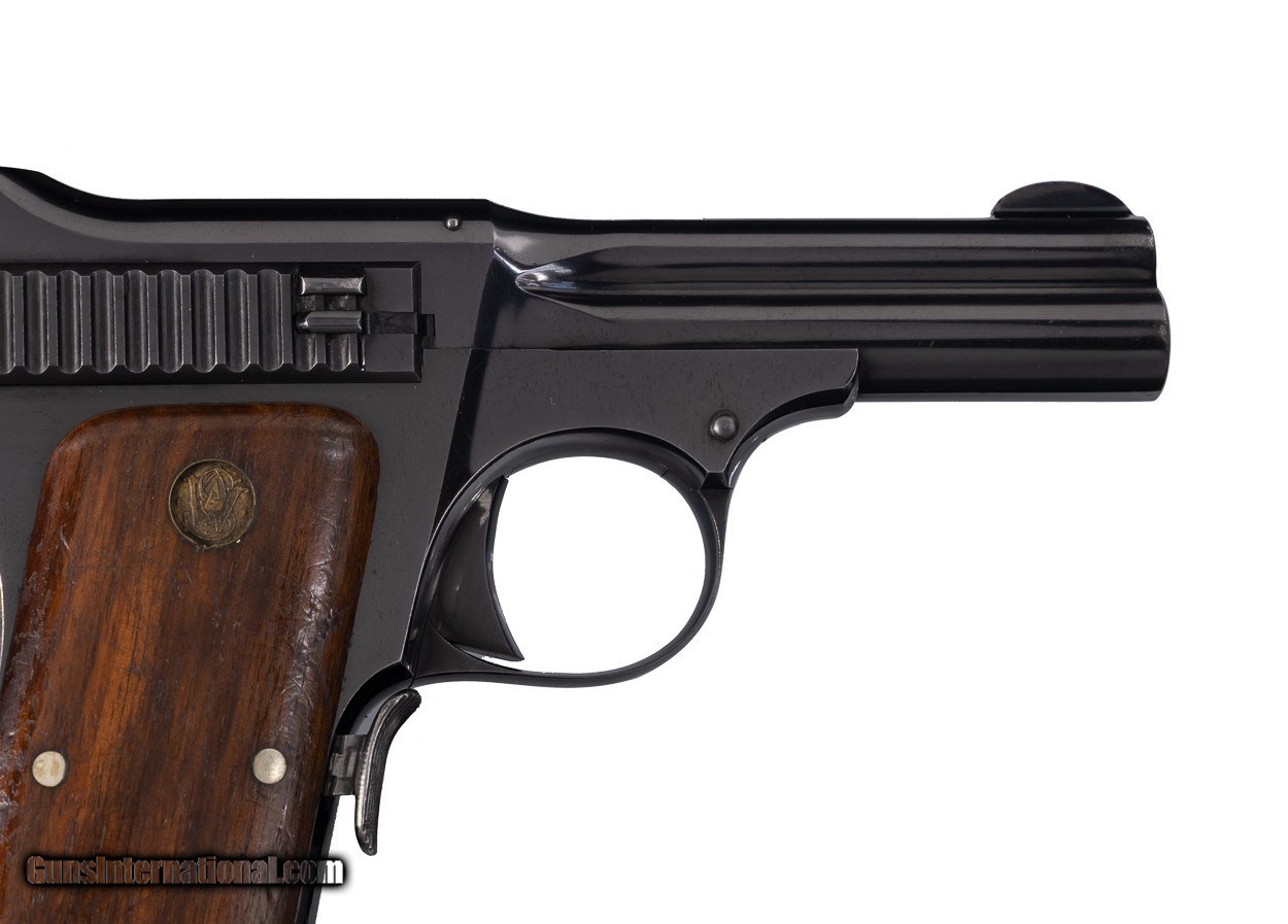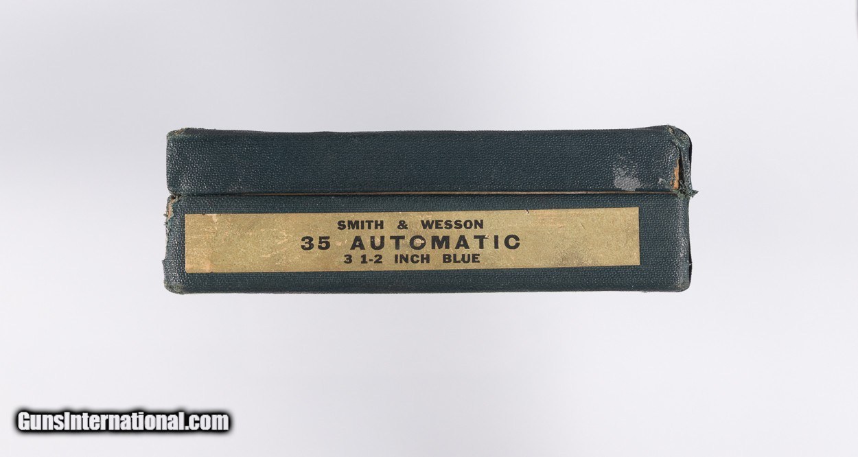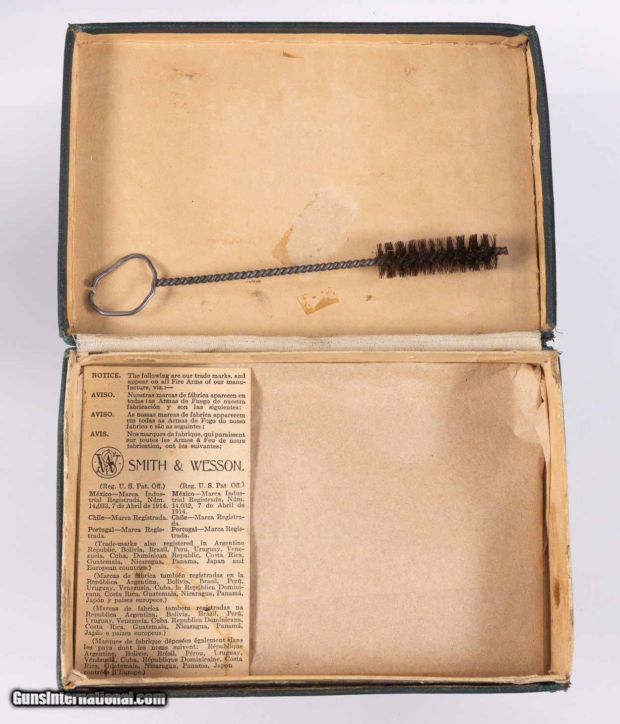 This rare and sought after S&W Model 1913 .35 Auto Club Gun was given to Victor Wesson on December 9, 1914 per correspondence with Roy Jinks. Victor was an important figure in the Wesson family and at the S&W factory. A supremely rare model to see as a ‘Club Gun’ this crisp example is complete in the green one piece box with the tissue wrap, caution flyer and cleaning brush. The gun retains about 95% of the original blue finish with some slight age thinning on the grip straps and a touch of wear at the muzzle. Knowledgeable collectors are aware how few examples of any model were given to members of the Wesson Family, as well as the scarcity of Club Gun models. A must own early S&W Auto that will enhance even the finest collection!