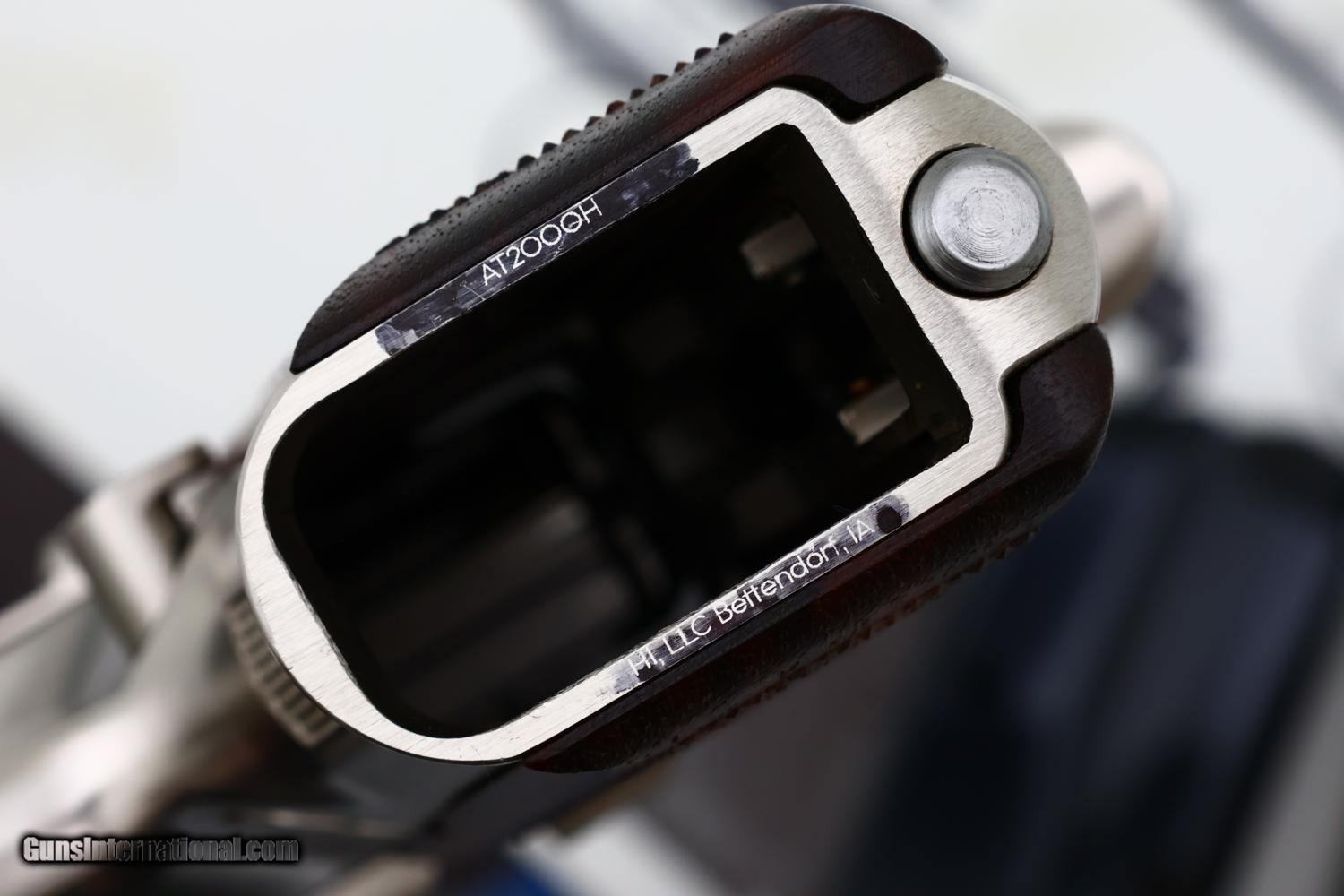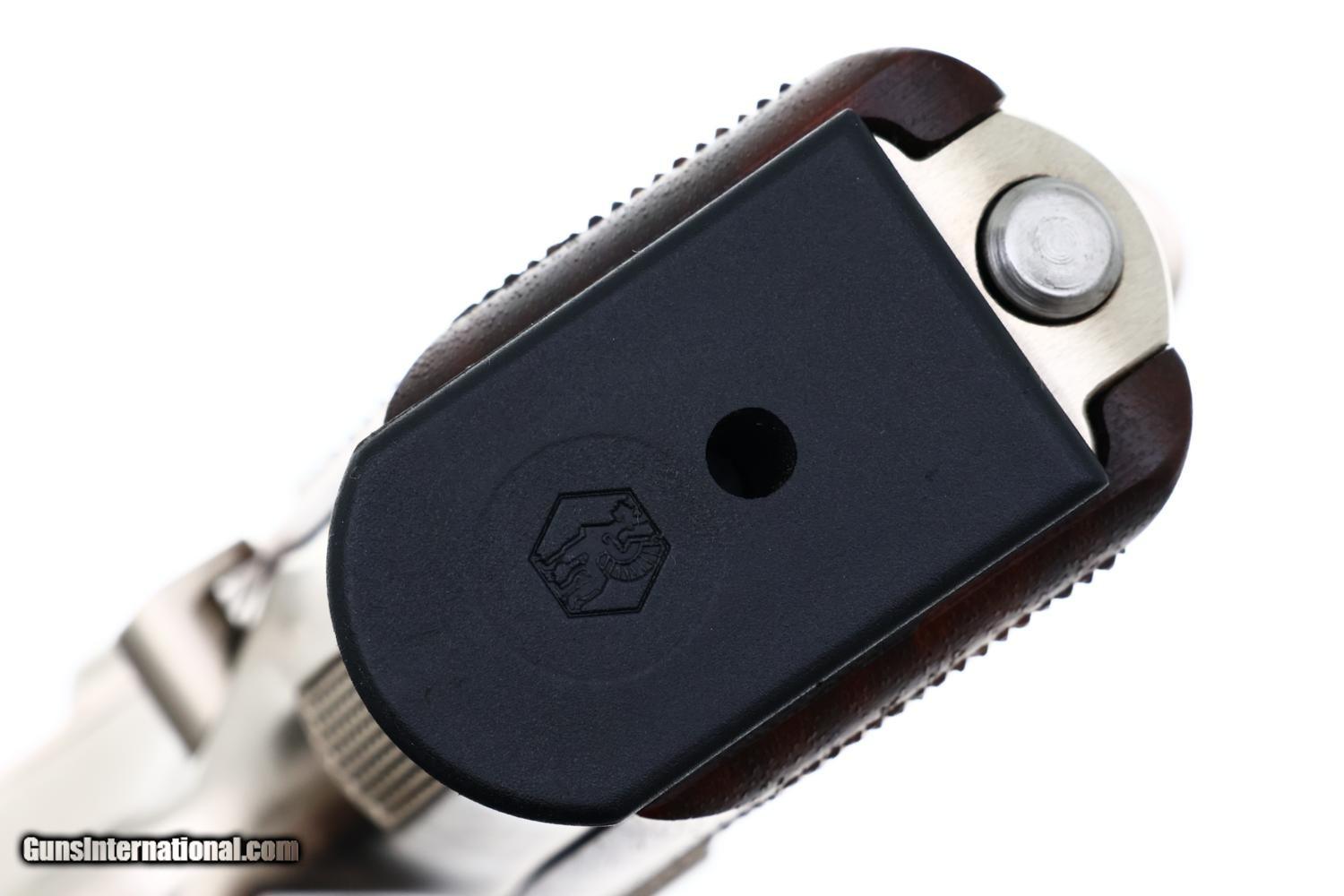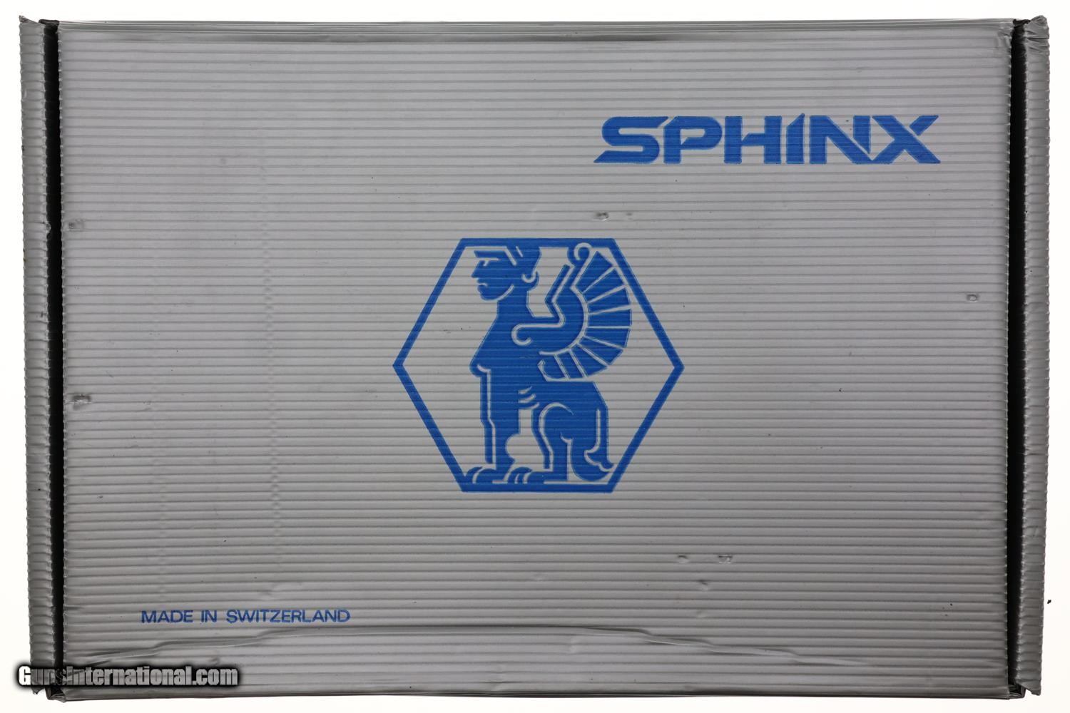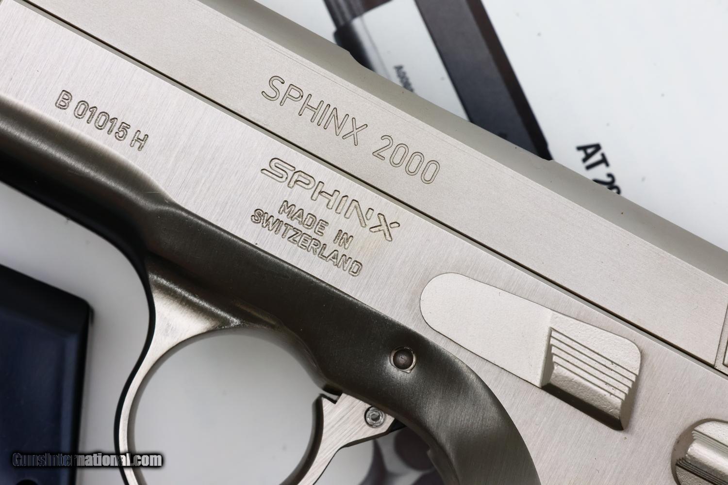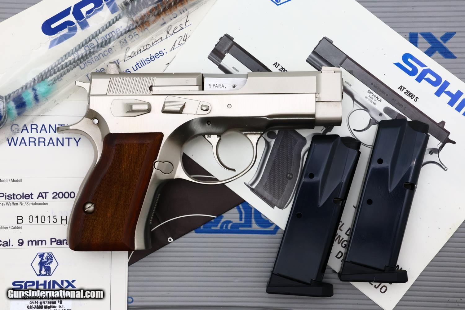 Beautiful SPHINX AT2000H semi-automatic stainless steel SA/DA compact pistol in 9mmP with 3.5-inch barrel, SN: B01015H, hand-fitted to tight tolerances rather than mass-produced, with brushed finish, as NIB The pistol has a fixed red dot front sight and drift adjustable rear sight. Ambidextrous safety and slide release. The left side of the slide marked "SPHINX 2000" over "SPHINX" with "MADE IN SWITZERLAND" and serial number "B 01015 H" engraved on the frame. The right side of barrel hood marked "9 PARA." with BP proof markings. Fitted with checkered brown wooden grips secured with slotted screws (spare set of blued grip screws) and includes two blued steel magazines with two indicator holes and removable floorplates. Complete with factory test target showing grouping, SPHINX branded documentation, warranty papers, cleaning tools and original shipping box including end label referencing the make, model and serial number. The AT2000H is one of many Sphinx pistols, all made in Switzerland, used by special forces, elite police units and sports shooters.