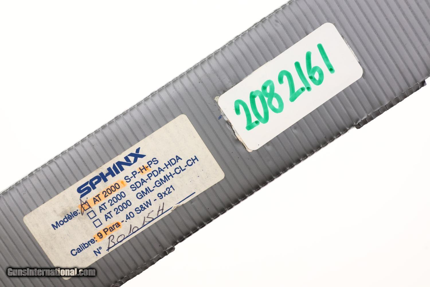 EXC+, virtually new, showing only the most minor handling marks, mainly light scuffing at the top of the barrel hood from slide retraction. Grips are as new. Neither magazine shows any insertional wear. Mirror Bore. Correct manual mechanics. Plastic packet of cleaning implements never opened. Near excellent box. A wonderful AT2000H Sphinx as shipped from the factory!
