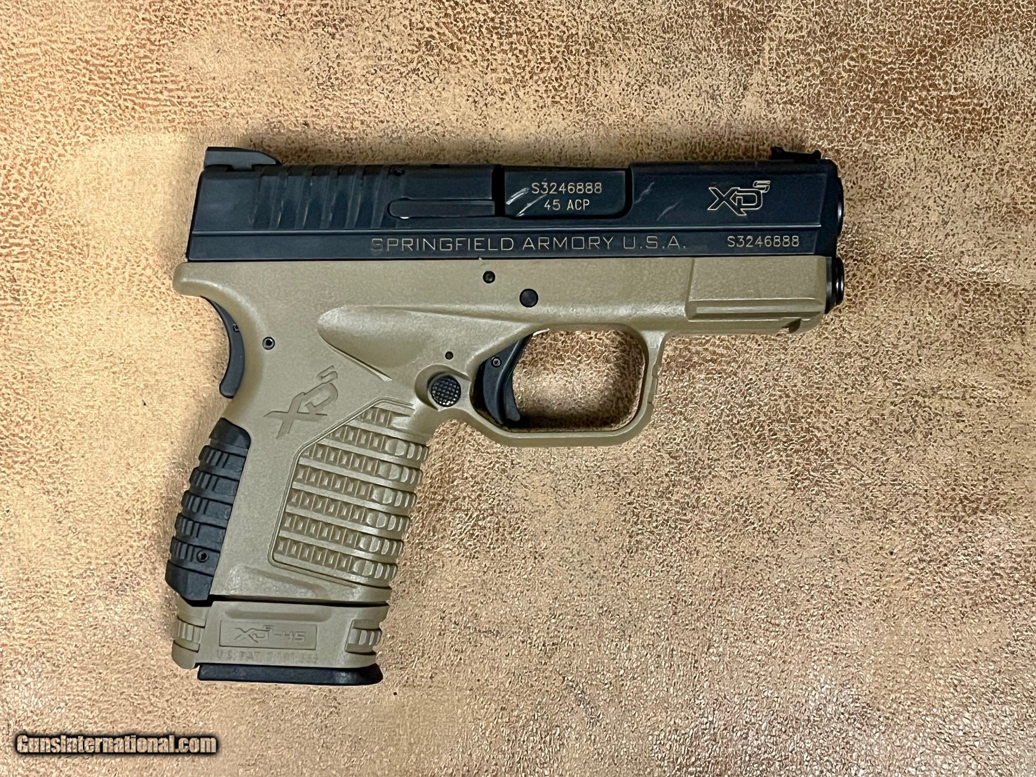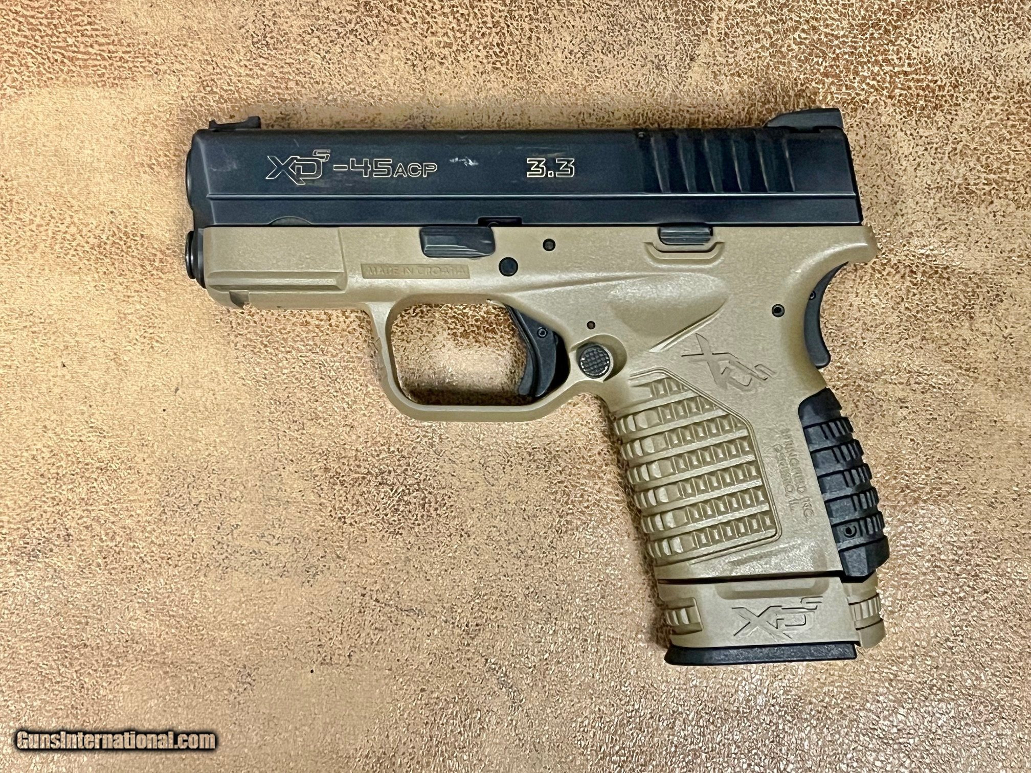 Description: Guns Listing ID: 473298 Springfield XDS Single Stack 45 ACP 3.3\" Barrel, Flat Dark Earth frame, interchangeable backstraps, (1)5-Rd & (1)6rd Magazines, original box SOLD Manufacturer: SPRINGFIELD ARMORY Model: XD-S Caliber Info: .45 ACP Condition: Used - Non-Certified Barrels: 3.3 BARREL Action: STRIKER |