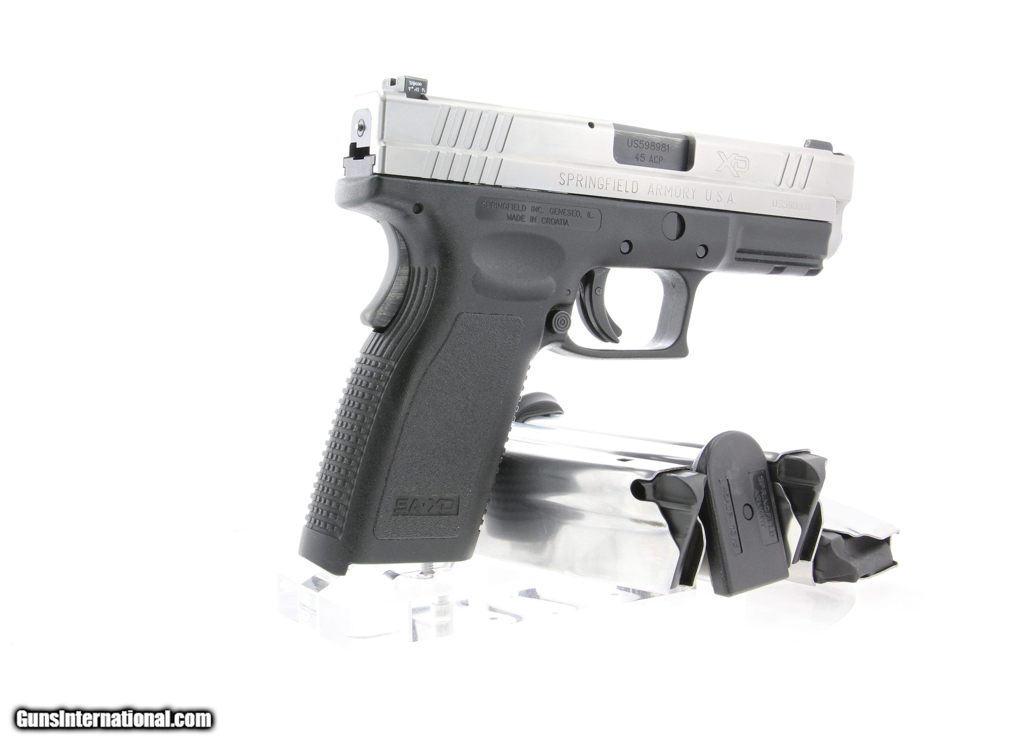 Description: Guns Listing ID: 1219175 This pistol is in perfect condition, aside from some mild use. The action is sharp and crisp, and ejects shells as it is supposed to. The bluing does show some mild use but it can be cleaned up and oiled with no issues. The stampings and markings are proud and very crisp, and visible. The barrel is clean, bright and shows very little residue of gunpowder. Overall condition is very good, and we believe this would be a great addition to anyone‚‚s safe. No Case Is Included Any and all of our firearms are listed as UNTESTED, nor do we make any claims that they have been tested for operation in regards to their firing abilities. Please review photos for the most accurate description of the item you are buying because that is the item you will receive. Please if you have questions regarding any of our listings, feel free to send us an email. Specifications: Springfield Armory XD Service 13+1 .45 ACP 4\" - Stainless/Silver, 4\" Barrel, 13+1 Rounds, Polymer Grips, 3-Dot Sights Model XD9613HCSP06 Action Striker Fired Barrel Length 4\" Caliber .45 Auto Capacity 13 Frame Finish Black Slide Finish Stainless UPC 706397866839 UHS-5 US598981 SKU: 2403010 SOLD Manufacturer: SPRINGFIELD ARMORY Model: XD45 Caliber Info: .45 ACP Condition: Used - Non-Certified Barrels: 4 BARREL |