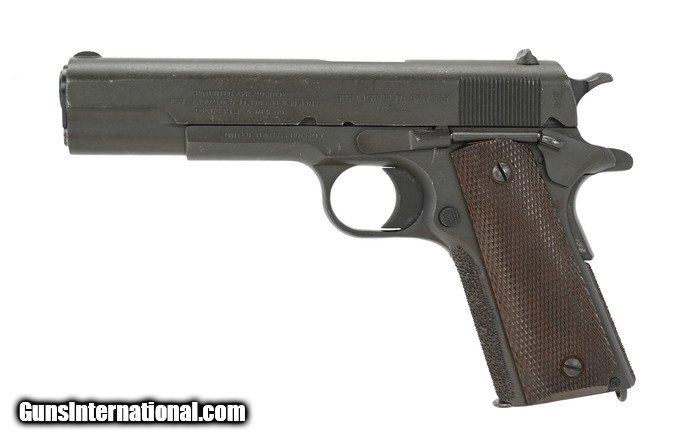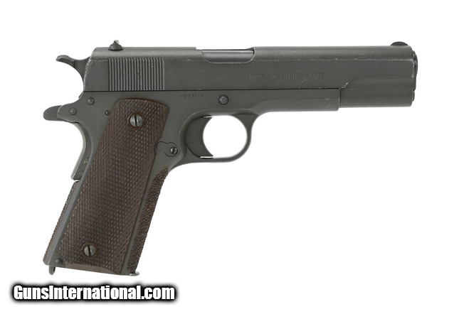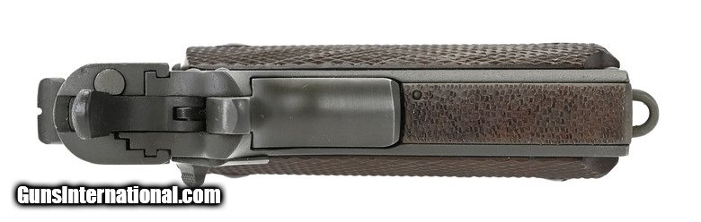 Description: " Springfield 1911 .45 ACP caliber pistol. Pre-WWI US Military pistol made in 1914. Has been refurbished for WWII, with parkerized finish and plastic grips. The frame is marked “AA" for Augusta Arsenal. The grip frame has been stippled like a National Match gun. The bore is very good.