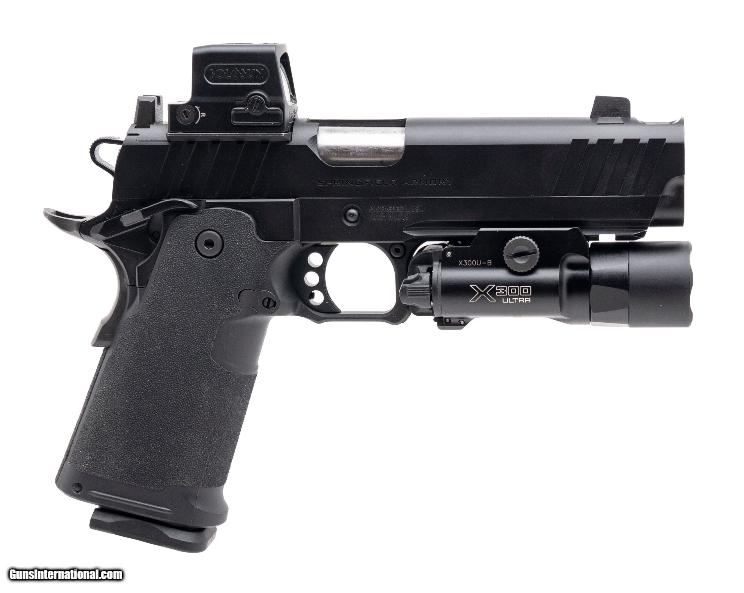 Description: "SN: NMH34019. Modern production, 9mm with an 5"" ported bull barrel. Bore is bright with strong rifling. Full size double stack 1911 style pistol with a Holosun 509T red dot optic, Surefire X300U-B flashlight, and a tritium front sight. Overall condition is near excellent. Comes with carry bag and two extra magazines. Price: $1,850.00 Contact Seller |