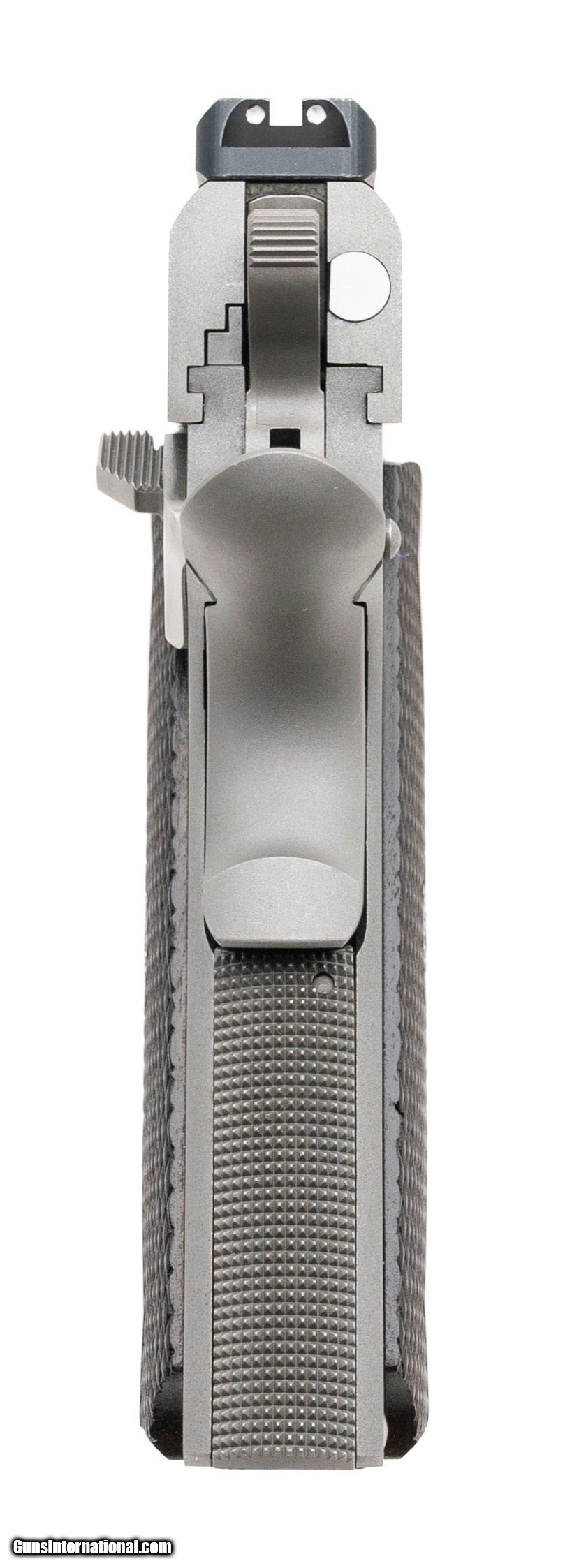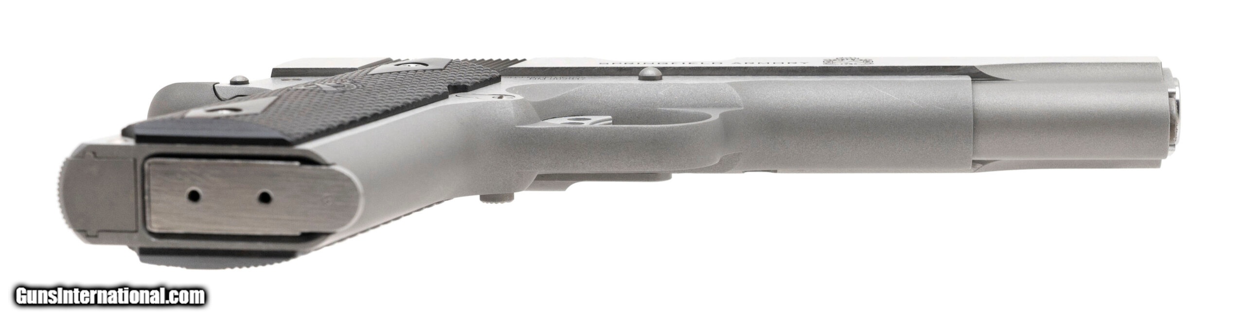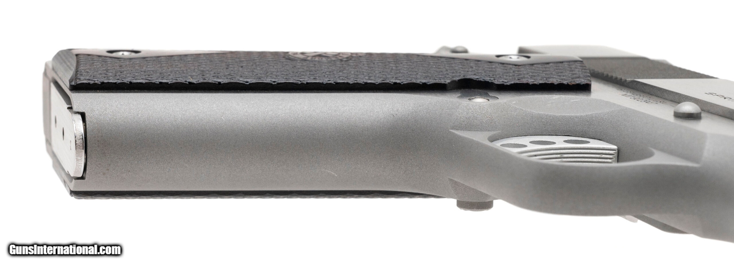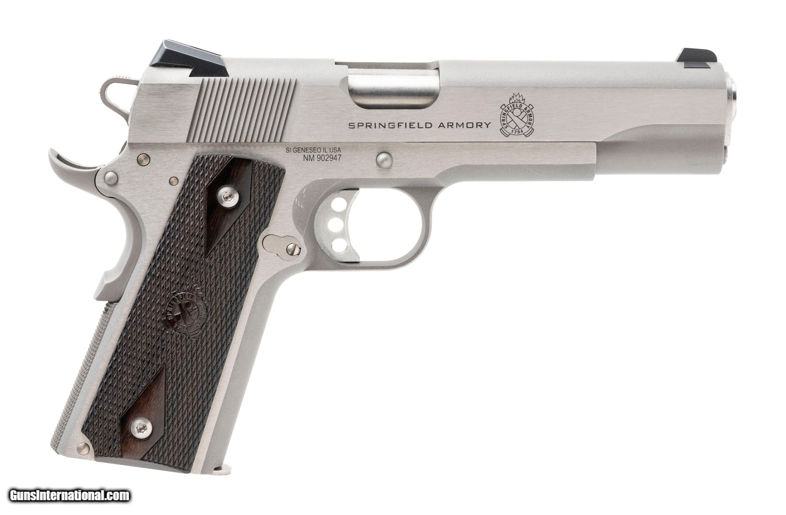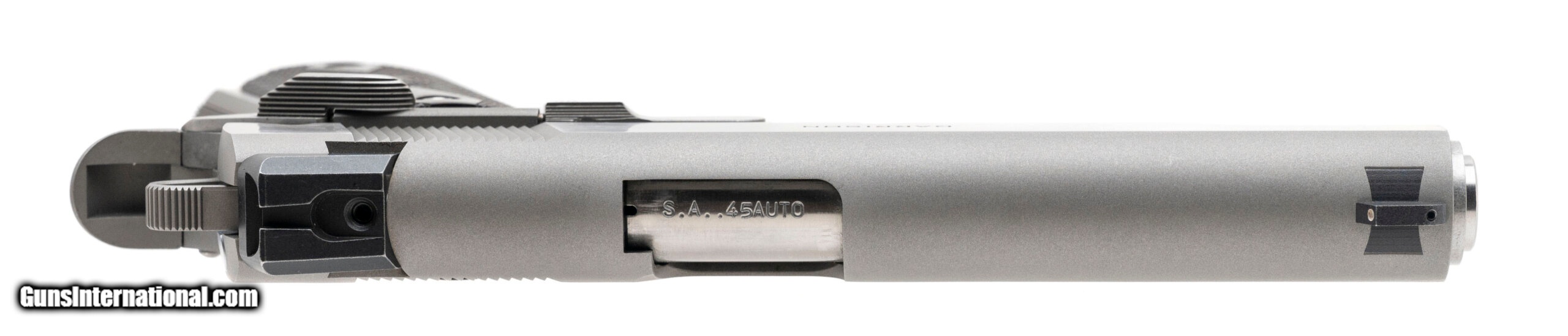 Description: "SN: NM902947. Modern production. .45 Acp with a 5"" Barrel. Bore is in excellent condition. Full size stainless 1911. Finish and grips are in very good condition with wear note on left side frame. Overall condition is very good. Comes with box. SOLD |
