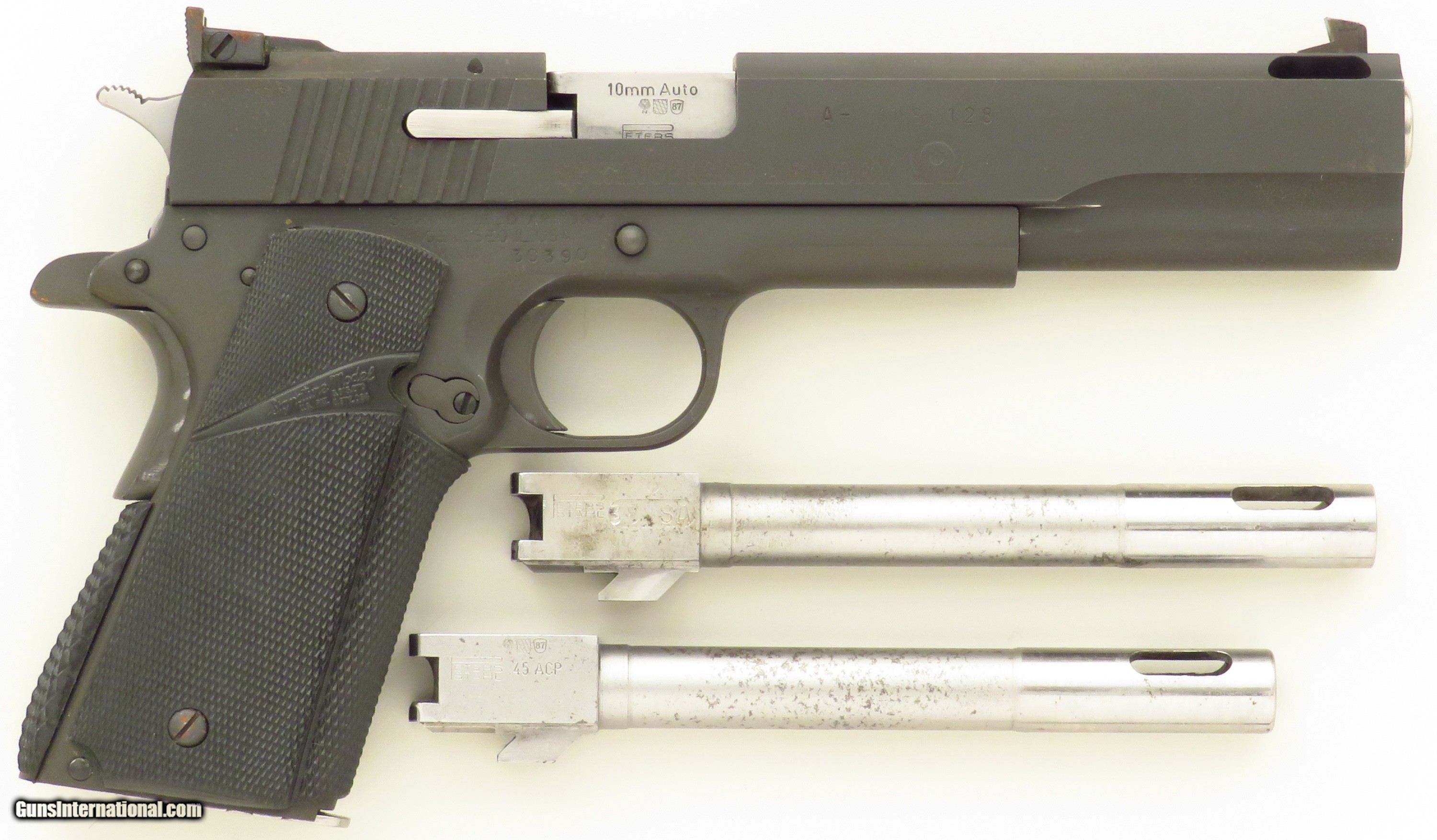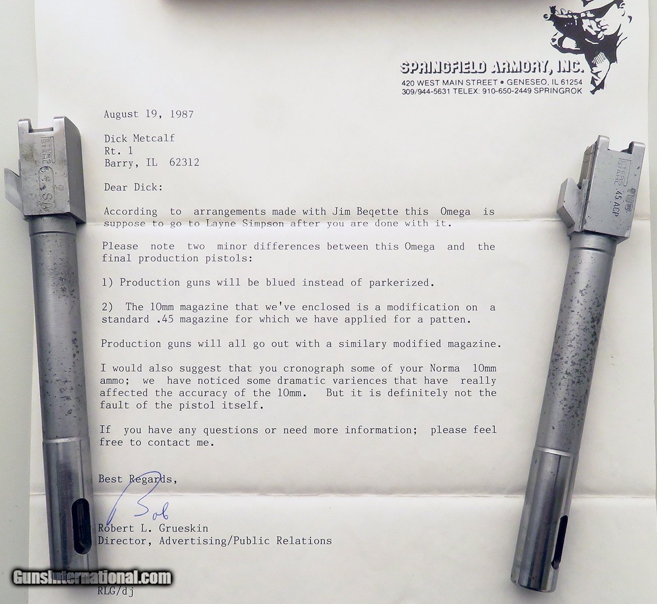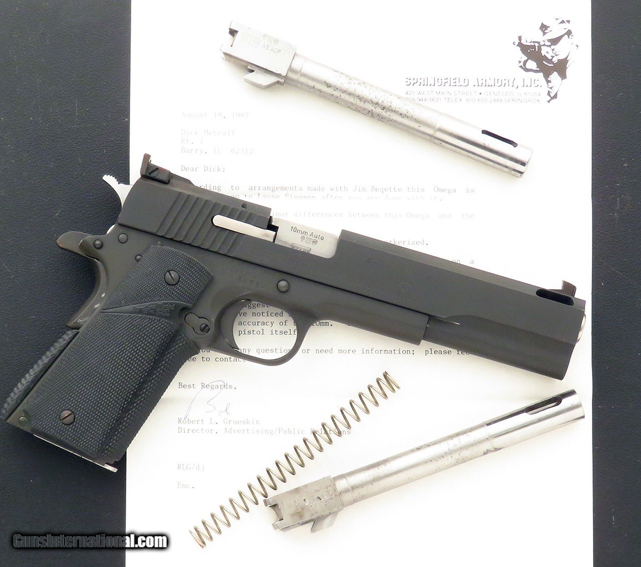 Advance release Springfield Armory Omega 10mm, matte, 1987, 6-inch ported, extra barrels, letter, collection of gunwriter Dick Metcalf, layaway