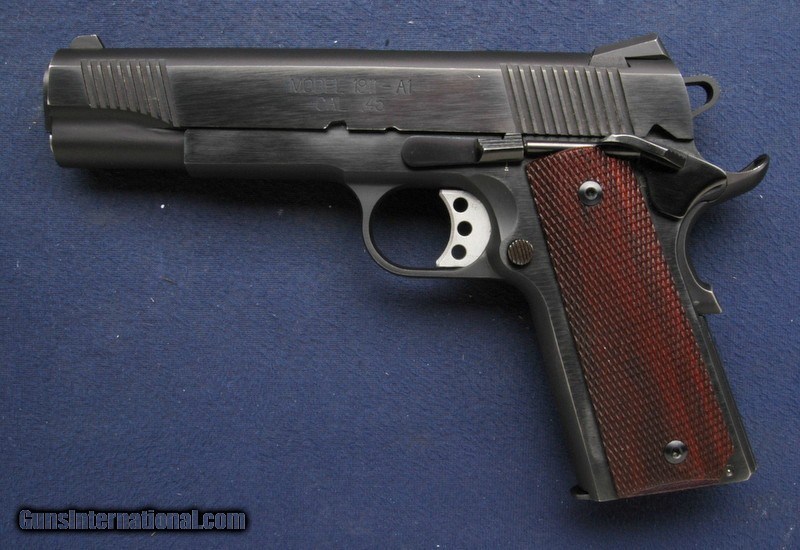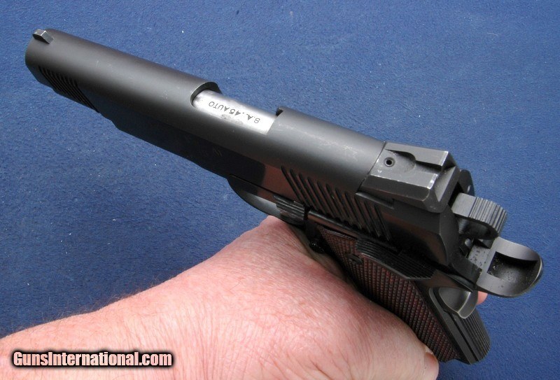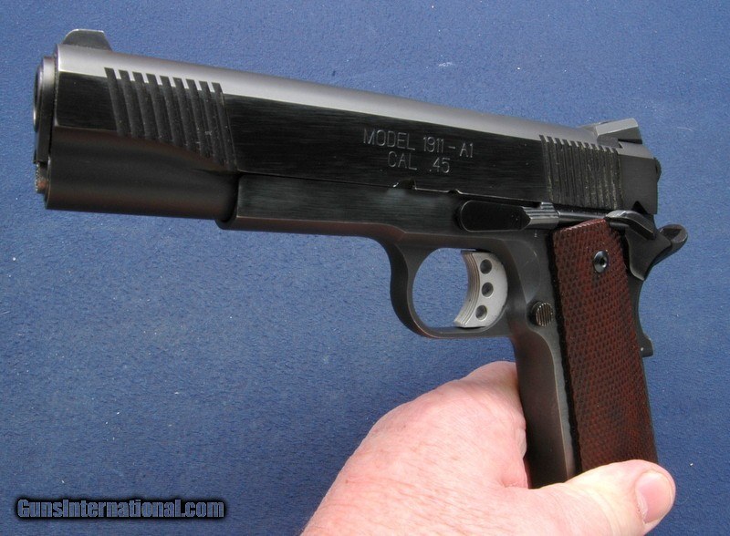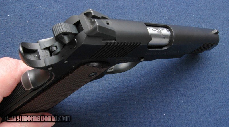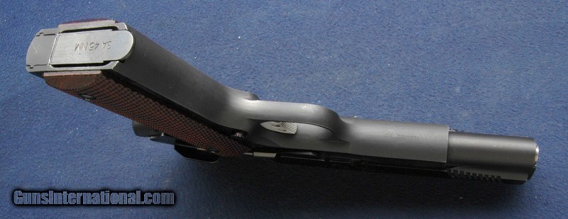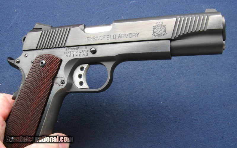 Description: Nice commercially blued Springfield 1911-A1. Basic Novak style sights, right hand extended thumb safety, beavertail safety, minty bright bore, excellent trigger. Comes in a hard case with one SA seven round magazine. $45 shipping to the lower 48, 3% surcharge for using a CC. If you pay with a personal check, you can expect us to hold the item for up to 10 days to ensure that the check clears. SOLD Handgun Caliber: .45 ACP (.45 Auto) |