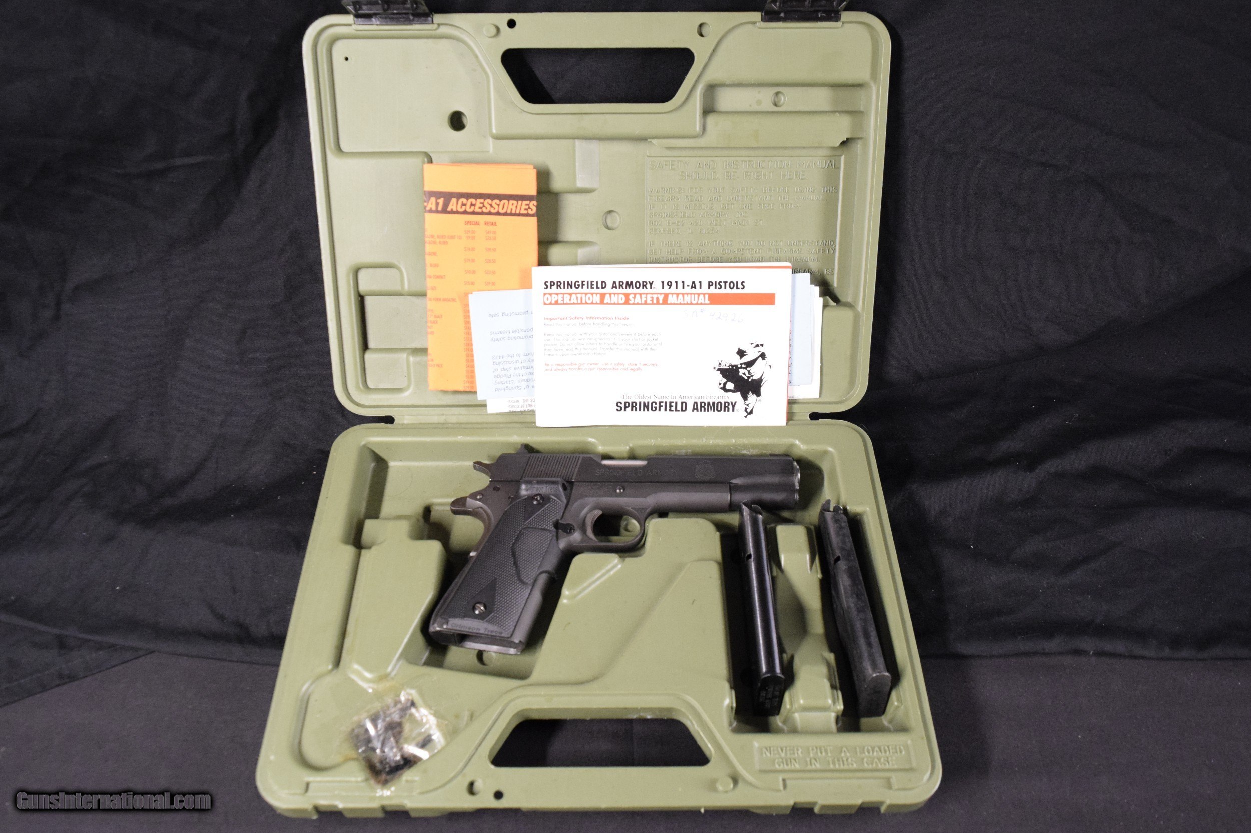 Description: 1911 .45 ACP pistol is an entry-level defensive handgun that combines G.I.-proven features with Springfield Armory® quality and materials science along with a true working man’s price. This top-quality G.I.-inspired pistol includes a short military-style trigger, an arched mainspring housing, a spurred hammer, and a single 7-round box magazine. Three-dot steel sights and a lowered and flared ejection port ensure modern reliability and performance without breaking the bank. This package comes with 2 magazines and the original hard case. The overall condition is great with some scratches on the slide. Pre-Owned - Springfield 1911 A1 SA .45 Auto 4.5" Handgun