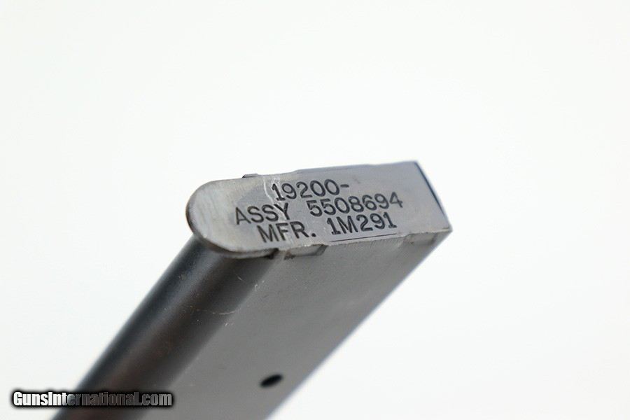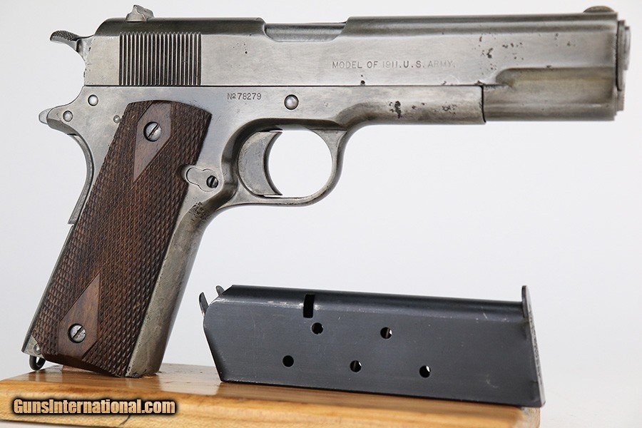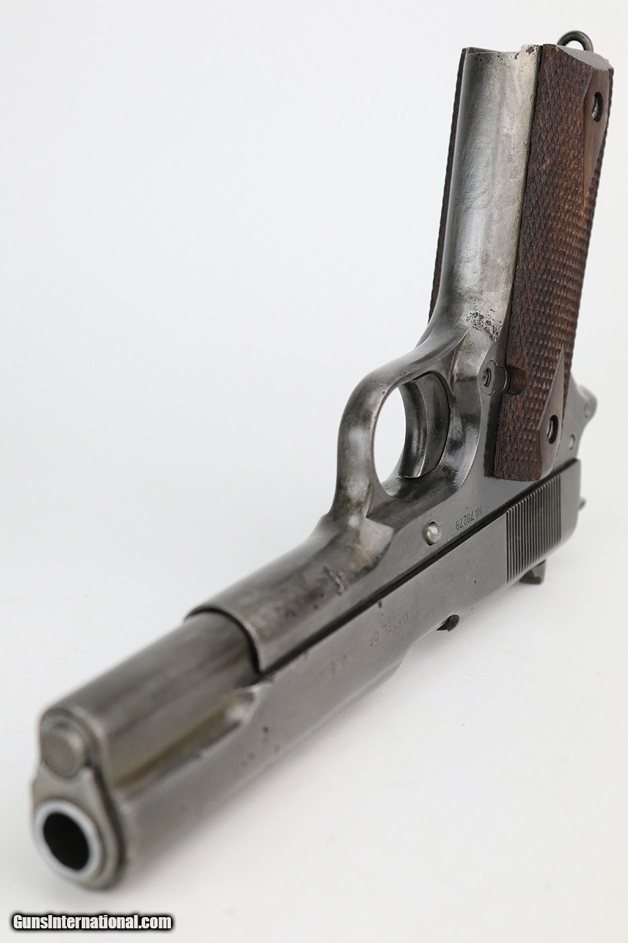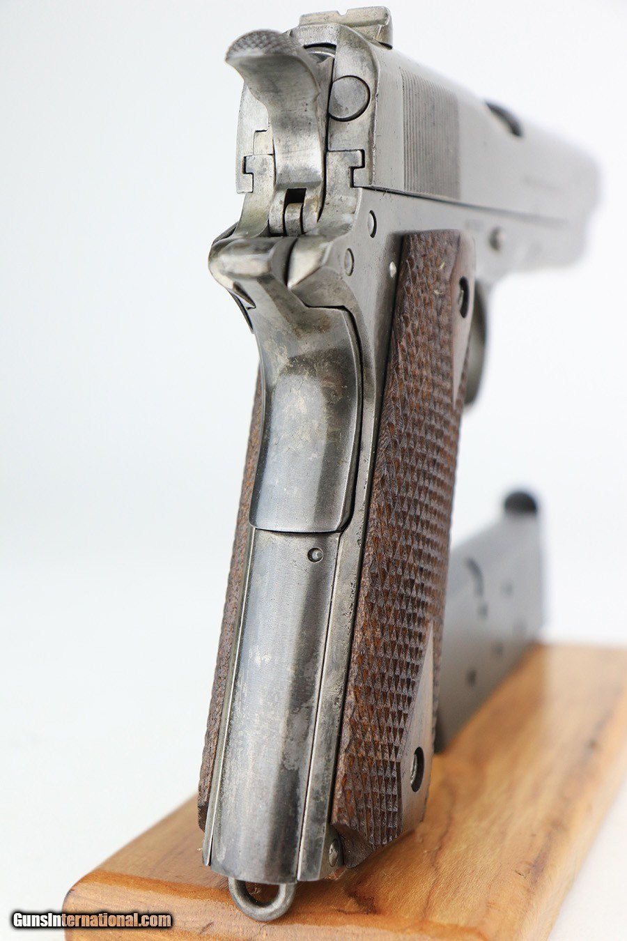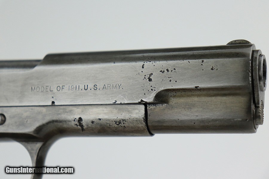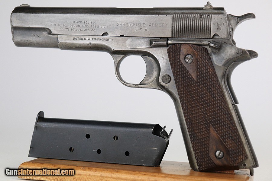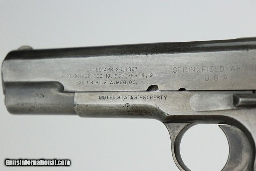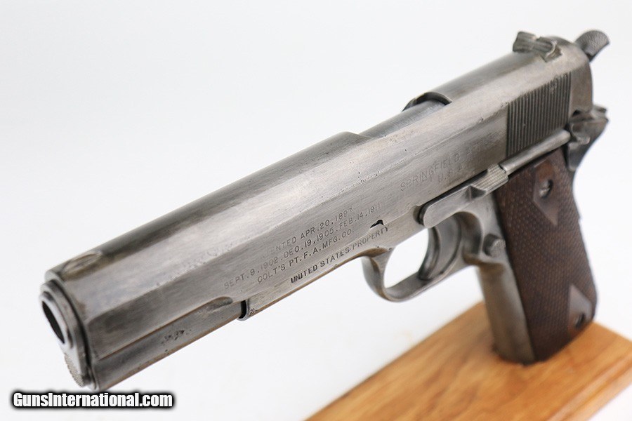 Description: This is a rare Springfield Armory Model 1911 issued to the US military during WW1. It is "United States Property" marked, has the proper Springfield Eagle on the right side of the slide, and has flaming bomb military acceptance proofs. It's an early example from 1914, one of the first ~6,000 made. Several small parts do have the Springfield 'S' marked on them, including the slide stop, hammer, safety, mainspring housing, grip safety, trigger and mag catch. Obviously has a Springfield slide and frame as well. Replacement barrel that's marked MP on the side of the lug and P on the underside. Grips and magazine are after-market. The pistol is obviously quite worn and has several patches of pitting. Very little of the original blue remains. SOLD Curio/Relic: Yes Handgun Caliber: .45 ACP (.45 Auto) Bore: 8.5/10 Condition: ~10% |
