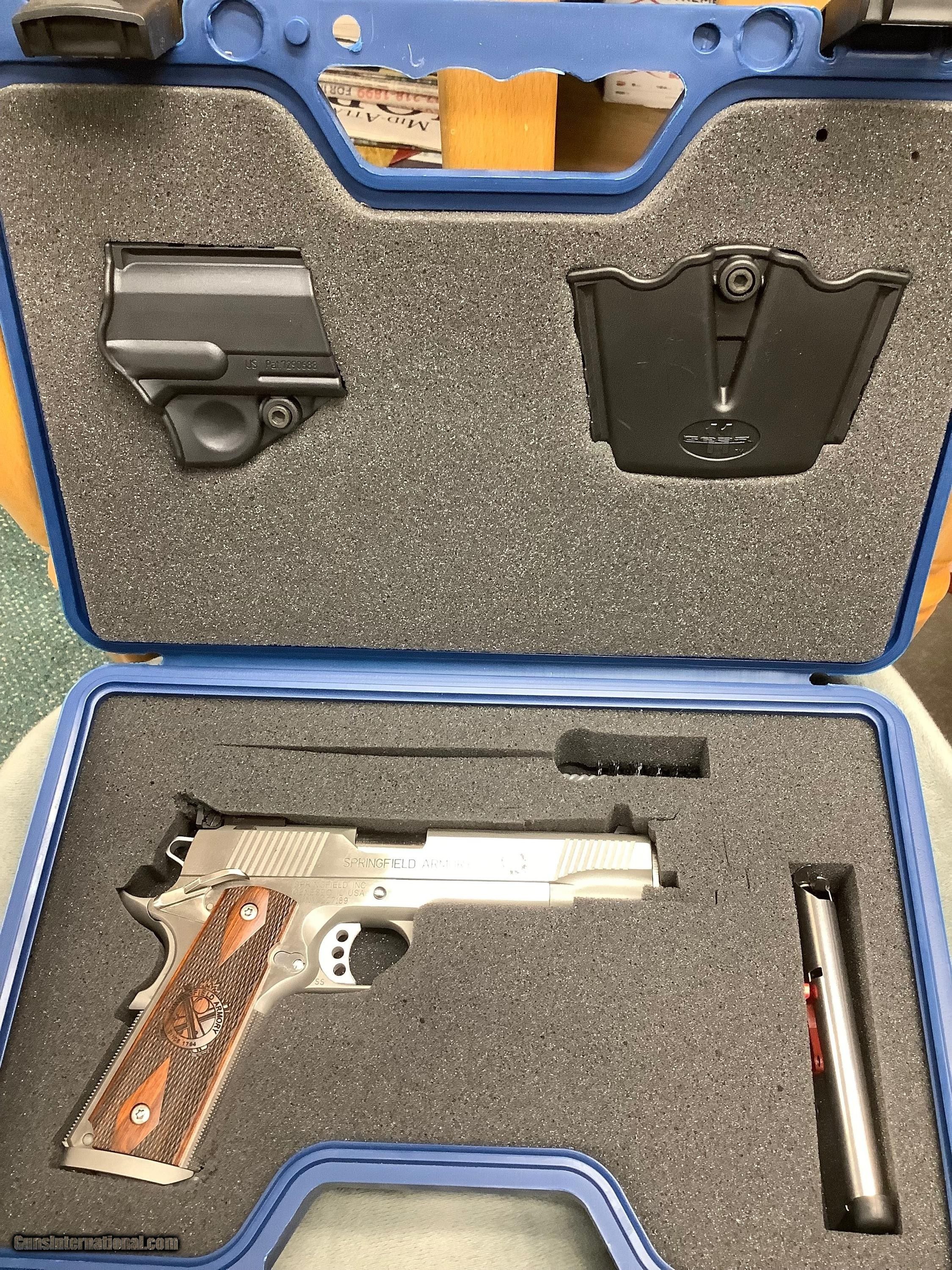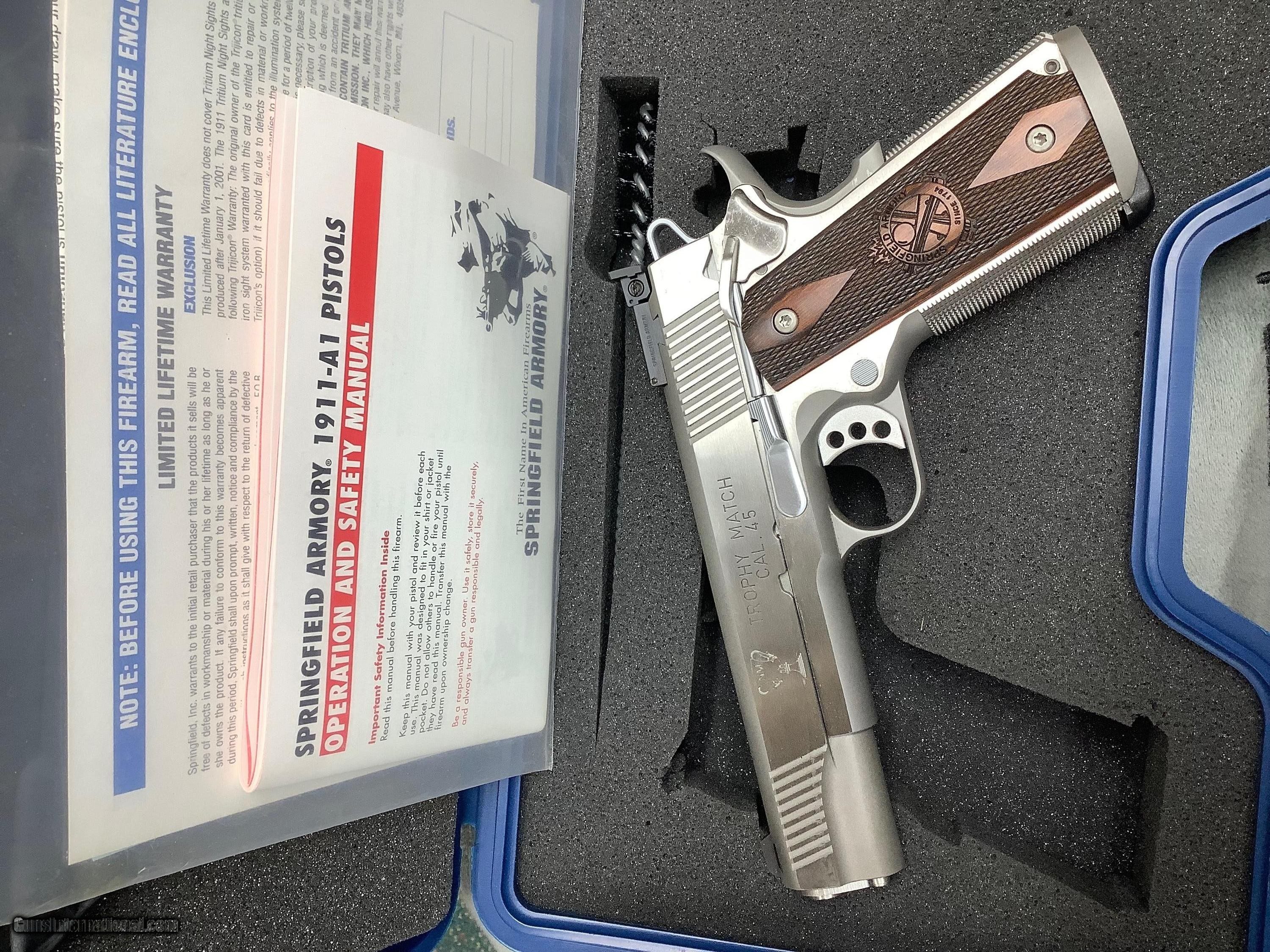 Description: Springfield 1911 A1 Trophy Match, 45acp, Top of the line Pistol, Improved trigger Pull, Adjustable rear sight, 5" Match Grade Barrel and Bushing, Stainless Steel, Includes 11Gear System Holster and Mag holder, gun is unfired, 100% condition comes with manuals, cleaning brush two mags. $45 Shipping from my FFL in Pa to your FFL,no CA sales,no AK sales. SOLD |