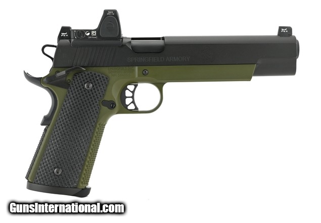 Springfield 1911-A1 TRP 10mm caliber pistol. NEW Long Slide TRP with Trijicon RMR and 2-tone black over green finish.