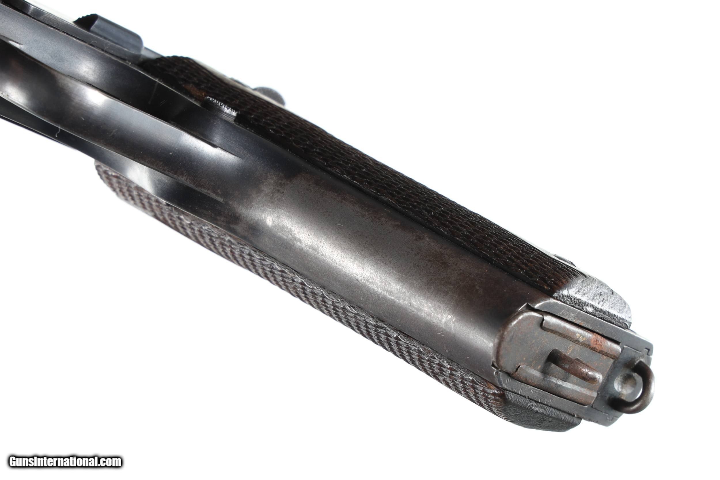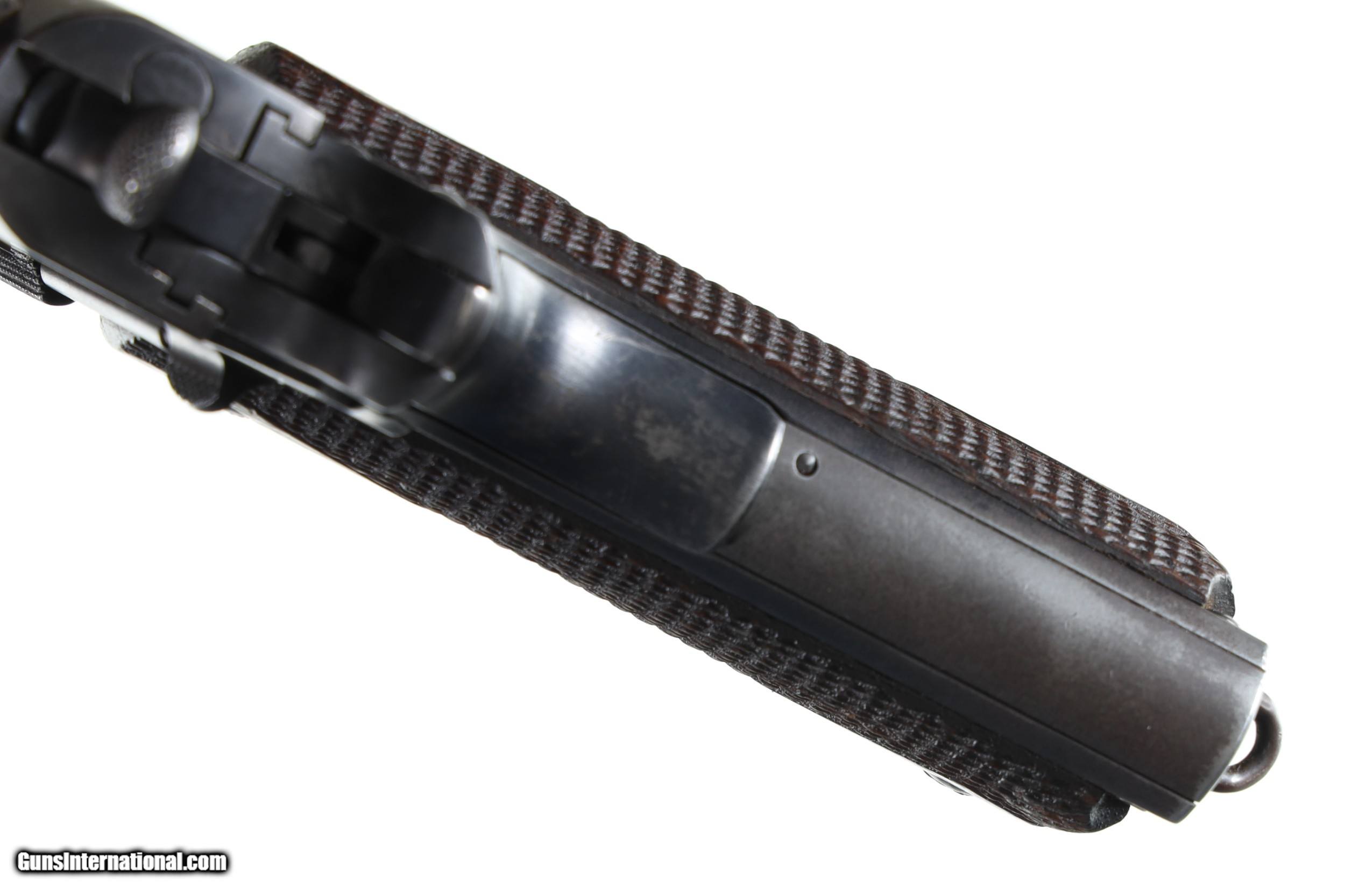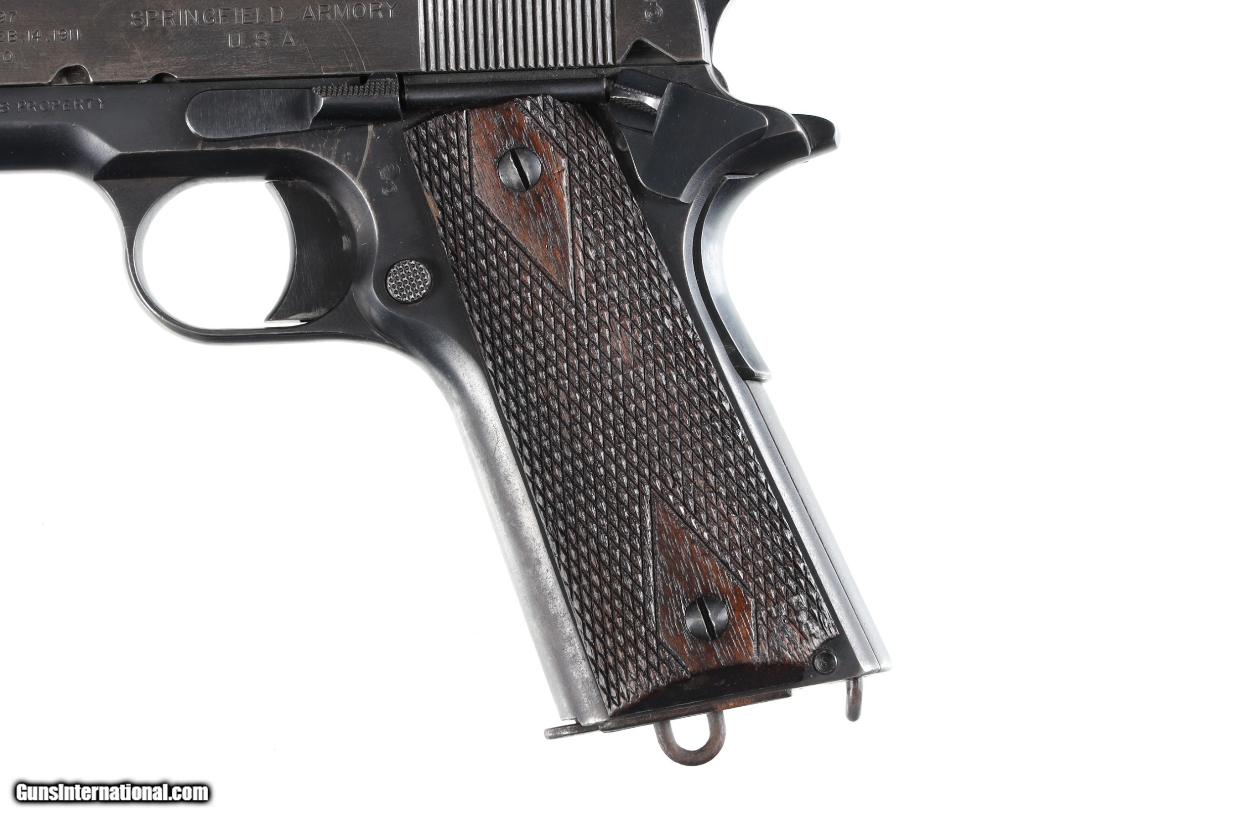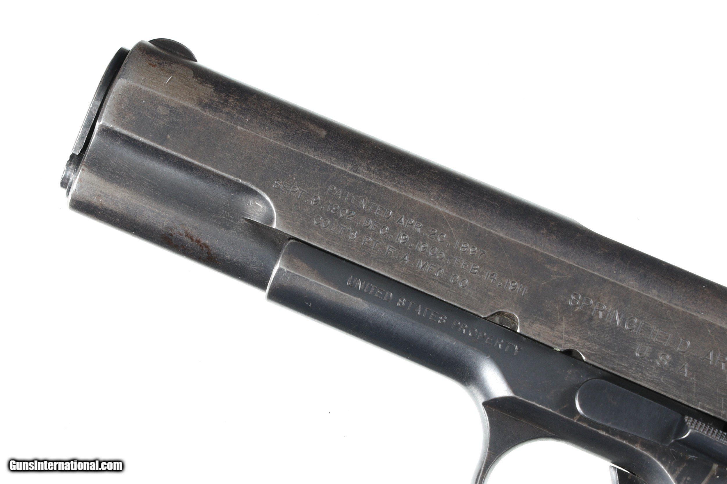 Description: Very good overall condition, fading original finishes. Manufactured 1915. Correctly marked Barrel with S and P on left lug. Firing pin retainer marked S. Correct Stocks and early type magazine. Unable to see marking on barrel bushing, spoke with another collector he says he’s never seen one marked. However, Clawson’s book lists barrel bushing as marked. Safety appears to be correct type from Clawson’s book. I have not broken the 1911 down to all parts. I’m not comfortable with hammer and punch. The gun feels and looks all matching in patina and appearance. Grips had the never been taken off feel as I only removed the left grip. • Free Shipping, No Credit Card Fees. • Lay-a-way available for this firearm. • 1/3 Down, a 1/3 in 30 Days 1/3 in 60 Days. SOLD Manufacturer: Springfield Model: 1911 Serial Number: 114993 Barrel Length: 5 |