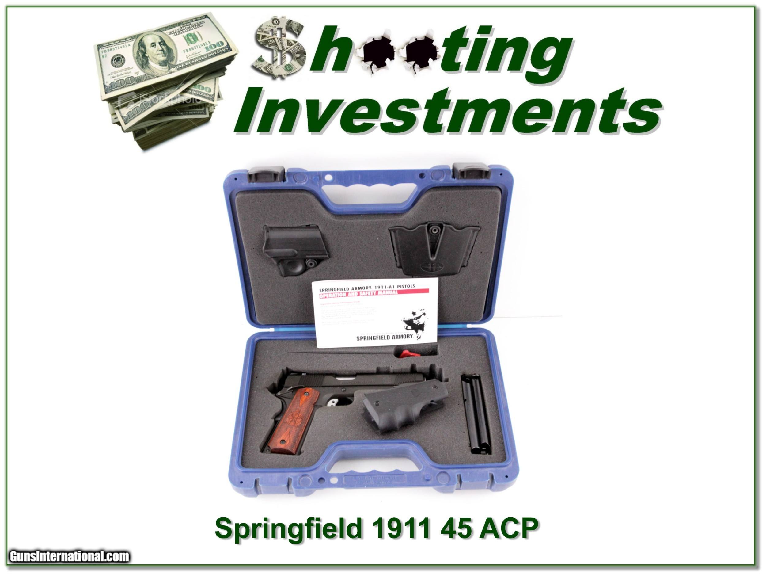 Description: This is a like new Springfield 1911-A1 in 45 ACP. It comes as seen in original case, 2 magazines all papers and accessories. It includes 2nd set of grips and leather holster. I am sure only a few rounds fired. I am selling this one on consignment and as such lay-a-way can’t be used. It does of course have the standard 3-day inspection. Shipping with insurance is $39. Please email me with any questions or larger pictures. (Consign your quality firearms with Shooting Investments for only 12%! Let me know if you have any you would like to sell!) 18-1098 Payment: Payment is by Money Order, Cashiers Check or Personal Check. I can now also accept MasterCard and Visa with a 3% convenience fee. PayPal can be used for some items but never firearms. Please let us know if you would like to pay via PayPal. Shipping: The shipping charge will be listed in each description. It is $39 for most long guns and $29 for most handguns. Some heavy guns or those insured for over $2000 will be higher. Shipments to Alaska and Hawaii are higher because air shipment is required. Most firearms are shipped on Tuesday and Thursday and usually in 5 days of receipt of payment. We package all shipments carefully and insure them. For long guns you can purchase a new Plano case for $19. They now cost us $22 when buying 100 at a time. Optics are shipped Priority Mail and most other non-firearm shipments are shipped First Class. Returns: Our return policy is simple. If for any reason you are not pleased with your purchase, you may return your item for a full refund of purchase price. Ammunition cannot be returned. It is important to us that you are happy. Guns cannot be fired or dissembled before returning them and they must be returned in the same condition as received. Notification of a return must occur with-in 3 days of receipt at your dealer. Shipping, convenience and dealer fees are not refundable and are the responsibility of the buyer. Lay-a-way: If needed, we offer a 60 day lay-a-way option on most firearms. It is 1/3 now, 1/3 in 30 days and 1/3 in 60 days. Lay-a-way firearm sales are final and if not completed the first payment cannot be returned. Consigning your firearms with Shooting Investments: We will help you get top dollar for your firearms. While most local guns shops charge 20% or more, our fee is only 12% with a minimum of $75. At your local gun shop it might take months to sell. Selling on-line provides instant access to thousands of interested buyers. You won’t find any other on-line dealer willing to sell your firearms for only 12% or listing every gun on 3 separate s. Selling through an House typically costs the seller 15% and the buyer an addition 15% (so 30%) and you have to wait several months to sell and longer to receive funds. If properly priced, we will sell your firearms in a few weeks. Send us an email or give us a call and we’ll explain how easy it is for you to get top dollar. Trading: Trading for use is really just buying your gun to re-sell. If you have a gun you want to trade, please email a picture and we will let you know what we can give or it. You will always get more if we sell it for you on consignment. Help for California Buyers: We are happy to ship to California. It is the buyer’s responsibility to make sure any item you buy is legal in your state. We are also happy to help with your purchase of a firearm from someone other than us. If you see a gun you would like to buy but the seller can’t or won’t ship to California they can ship to use and we’ll then ship it to your California dealer. The cost for this service is only $30 + shipping. Let us know if we can help! SOLD |