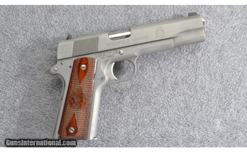 Description: Stainless Steel Mil-Spec model with arched main spring housing and standard spur hammer. A full size classic SOLD Caliber Info: .45 Automatic Colt Pistol Metal Condition: Very good showing a few light scratches Wood Condition: Very good with slight finish wear Bore Condition: Bright & sharp Barrels: 5" Stainless Match Grade Triggers: Single Action Stock: Checkered Double Diamond walnut with Springfield logo Weight: 40 oz Sights: Fixed front & drift adjustable leaf rear Extras: Factory case with extra grip panels Item Location: Grand Junction, CO |