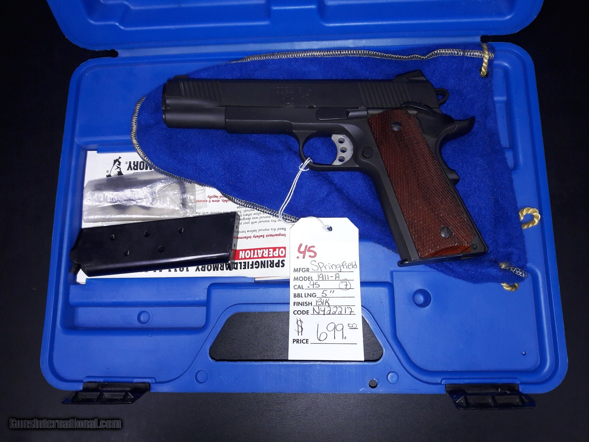 Description: Guns Listing ID: 1165653 Really nice gun! Comes with a extra mag and a hard case. SOLD Manufacturer: SPRINGFIELD ARMORY Model: 1911- A1 Caliber Info: .45 ACP Condition: Used - Non-Certified Barrels: 5 BARREL Finish: BLACK |