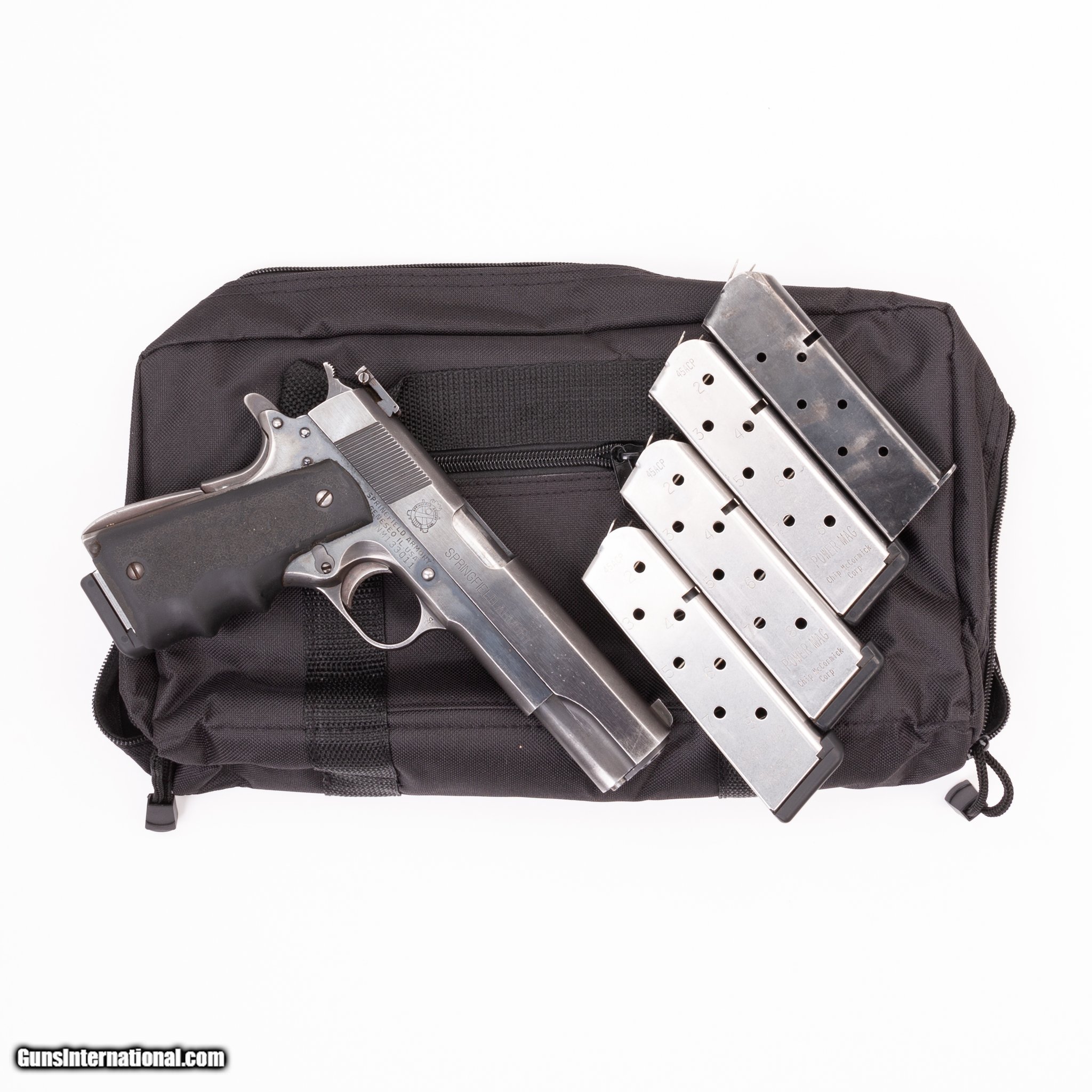 Description: Guns Listing ID: 461656 This Springfield Armory 1911 A1 is a single-action model. It features Hogue rubber grips, thumb and grip safeties, and an adjustable rear sight with fixed front sight. Wear marks are present on the frame and slide. Purchase includes one 8-round magazine and four 8-round Chip McCormick magazines. Get the best bang for your buck when you get a Certified Used Firearm . When you see the Certified Used stamp on any of our firearms, you can be confident that you‚‚re getting exactly what you want – a gun only in very good to excellent condition and held to the highest quality standard. All Certified Used Guns come with a ‚‚no questions asked‚‚ return policy . PLUS, ALL CERTIFIED USED GUNS SHIP FR SOLD Manufacturer: SPRINGFIELD ARMORY Model: 1911- A1 Caliber Info: .45 ACP Condition: Used - Certified Barrels: 5.00 Action: SEMI AUTOMATIC Finish: BLUED Weight: 2.4 |