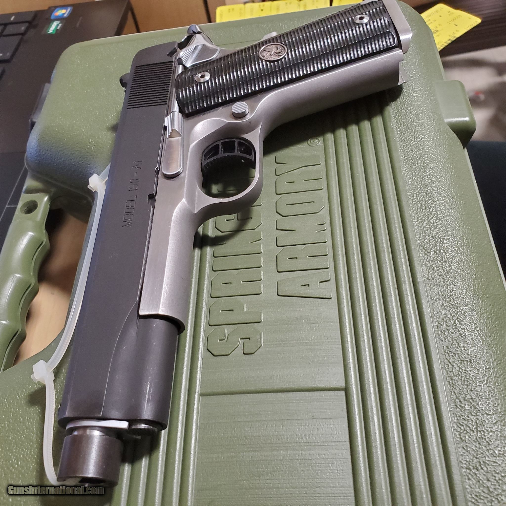 Description: Guns Listing ID: 386610 STAINLESS STEEL AND BLACK 1911-A1, W/ 1 8 ROUND MAG, IN ORIGINAL GREEN CASE, FEW SCRATCHES SOLD Manufacturer: SPRINGFIELD ARMORY Model: 1911 a1 stainless steel Caliber Info: .45 ACP Condition: Used - Non-Certified Barrels: 4.25 BARREL Finish: STAINLESS AND BLACK |