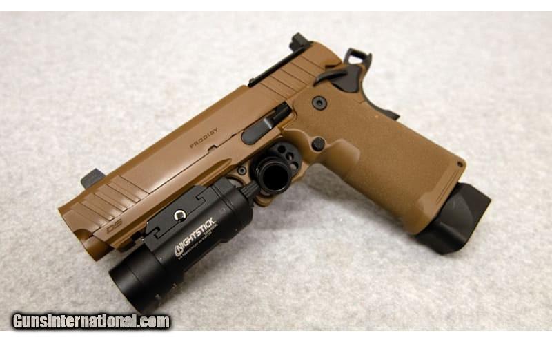 Description: Springfield Armory 1911 DS Prodigy Comp, chambered in 9 mm. Features include: double stack, forged carbon steel frame and slide, 5 in. match grade SS compensated bull barrel, 20 shot mag., AOS (Agency Optic System), tritium front and black serrated rear sight, polymer grips, two-piece full length guide rod, Coyote Brown finish 9mm Luger SOLD Chambers: 9 mm Metal Condition: Excellent Bore Condition: Excellent Barrels: 5'' Sights: 3 Dot Night Item Location: Fort Mill, SC |