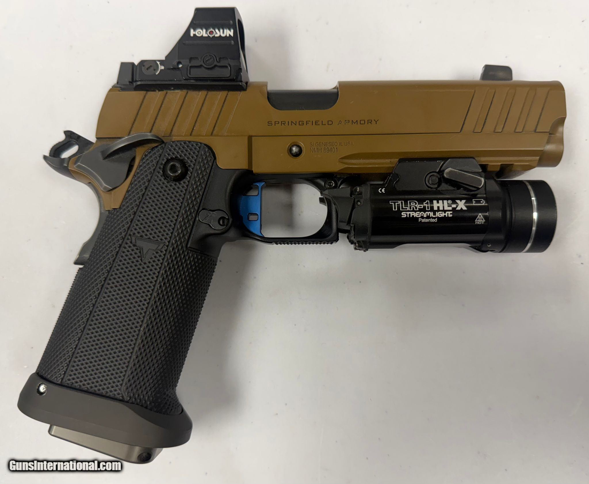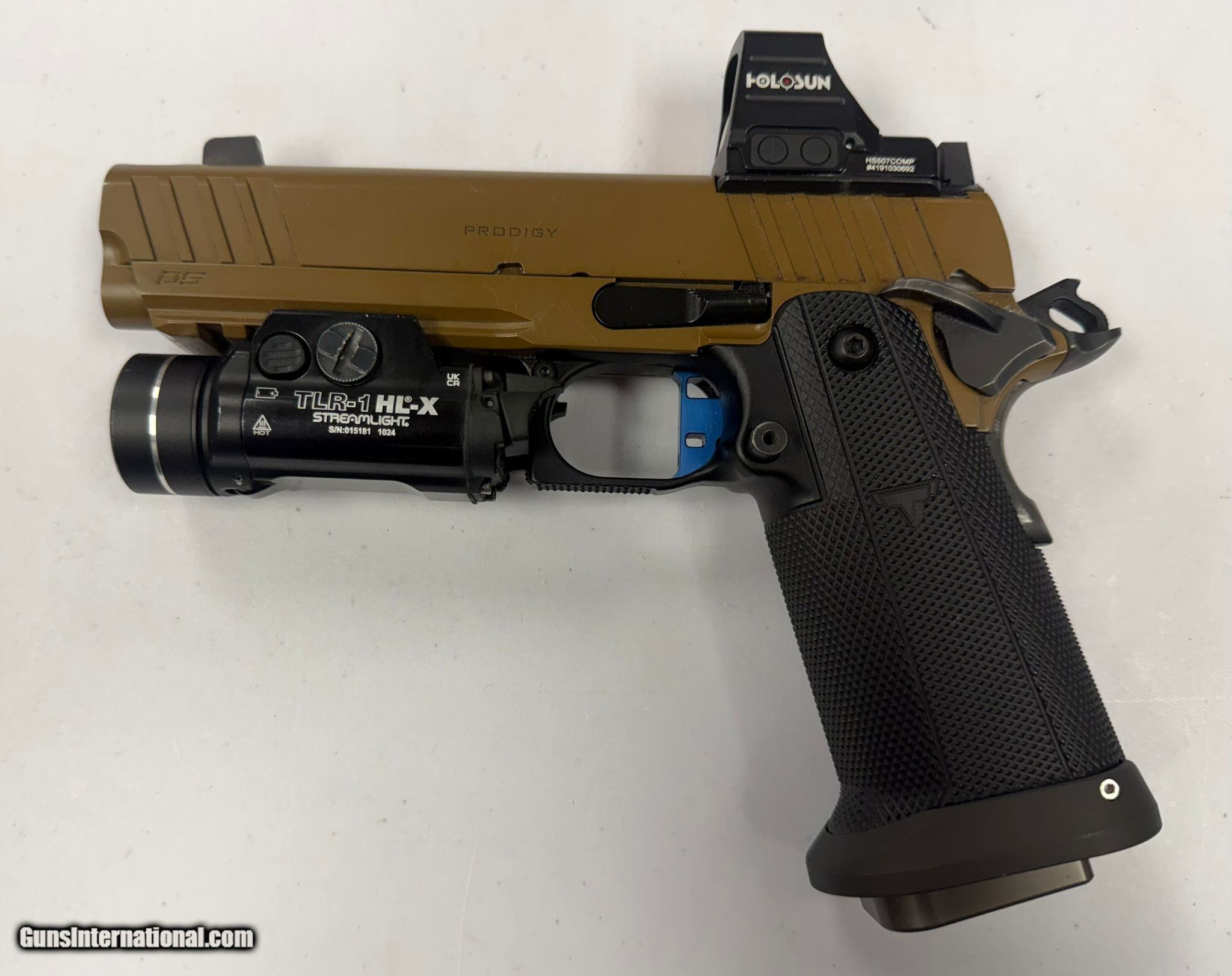 Description: Guns Listing ID: 602090 Comes with a TTI X Icarus 2011 Grip, 2 17rd magazines with Base Pad For STI/SV Magazines, a HOLOSUN HE507COMP-GR, a Streamlight TLR-1 HL-X Weapon Light, a (IWB) Light Bearing Holster, an aftermarket trigger, and a soft case. The Springfield Armory 1911 DS Prodigy Comp AOS is a high-performance, double-stack 1911-style pistol engineered for shooters who demand speed, precision, and modern capability. Chambered in 9mm Luger (9x19 Parabellum), this competition-ready handgun blends classic 1911 ergonomics with advanced features designed to enhance recoil control and rapid follow-up shots. Gun is in very good condition with some wear on the trigger guard. See photos for details! Manufacturer: SPRINGFIELD ARMORY Model: 1911 DS PRODIGY COMP AOS Caliber Info: 9MM LUGER (9x19 PARA) Condition: Used - Non-Certified Barrels: 5" BARREL Action: SINGLE ACTION Finish: coyote brown Weight: 2.1 LBS. Price: $1,500.99 Contact Seller |