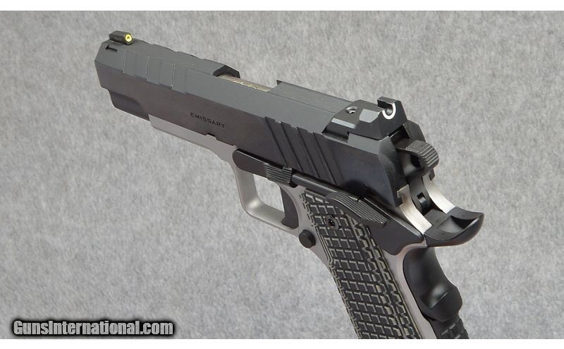 Description: Forged stainless steel frame and forged carbon steel slide, with two-tone finish. The blued carbon steel slide pairs with a stainless steel frame featuring a distinctive squared trigger guard with additional room for ease of operation with a gloved hand. The slide's "Tri-Top" cut gives the Emissary custom styling, while a flattened top strap is finished with 40 LPI serrations to diffuse light and reduce glare. New in factory box with softcase, manuals and extra 9 round mag. 9mm Luger SOLD Metal Condition: Blued/Stainless NEW Wood Condition: "VZ Grips, Thin-Line G10 Barrels: "4.25"" Forged Stainless Steel, Match Grade, Fully Supported Ramp, Bull, 1:16 Triggers: Single Action Auto Weight: 40 oz Sights: "Tactical Rack U-Dot Rear Sight, Tritium Front Item Location: Buda, TX |