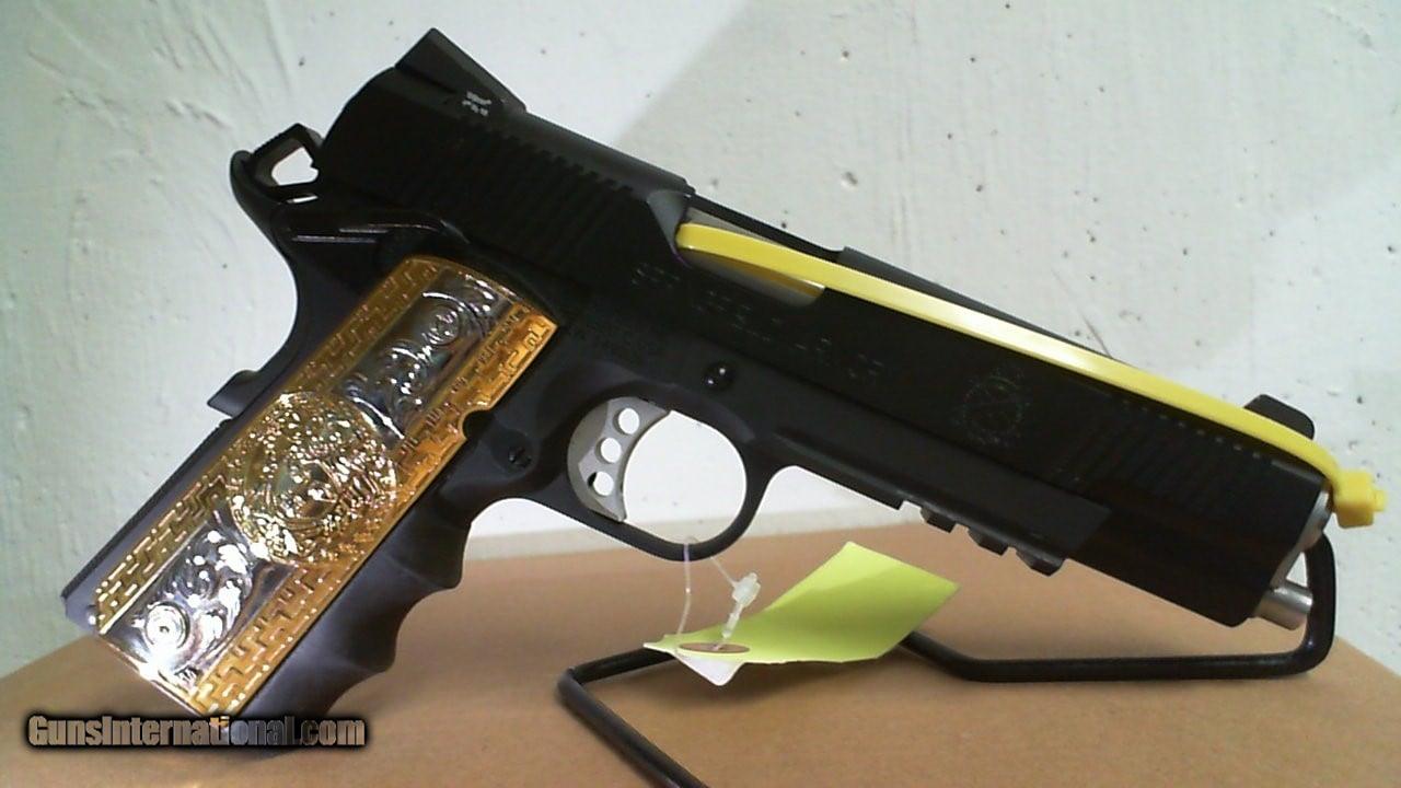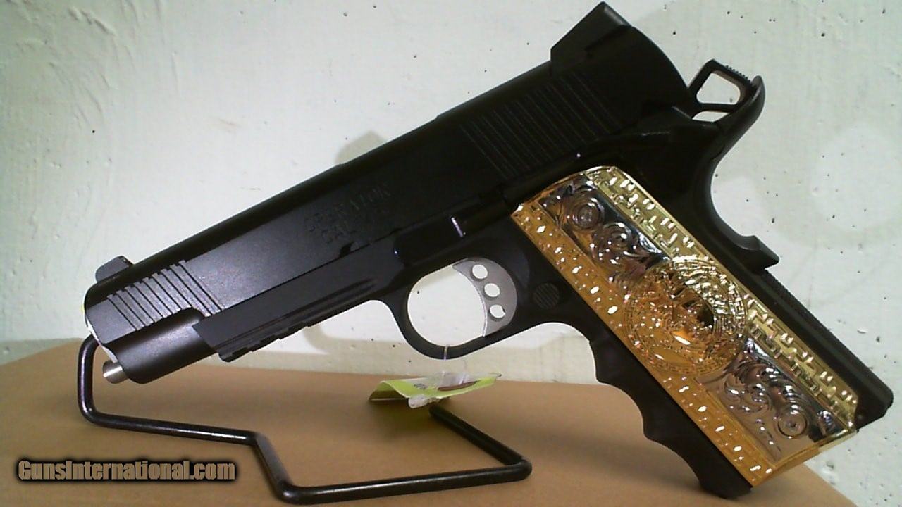 Description: Guns Listing ID: 467859 USED Pistol Firearm Springfield Armory 1911 Operator, #Lw149026, .45 Caliber, Semi-Automatic; One 12 Rnd Mag, Gold-Silver Grip (Not Original from Pistol) With A Versace Logo, In A gray Springfield case. SOLD Manufacturer: SPRINGFIELD ARMORY Model: 1911 OPERATOR Condition: Used - Non-Certified Barrels: 5 Gauge Info: .45 ACP Finish: blue steel |